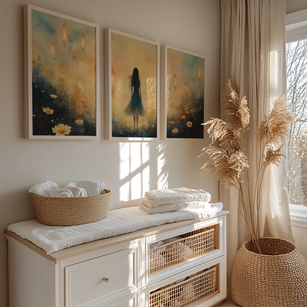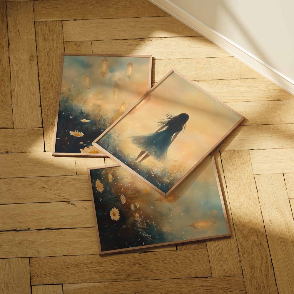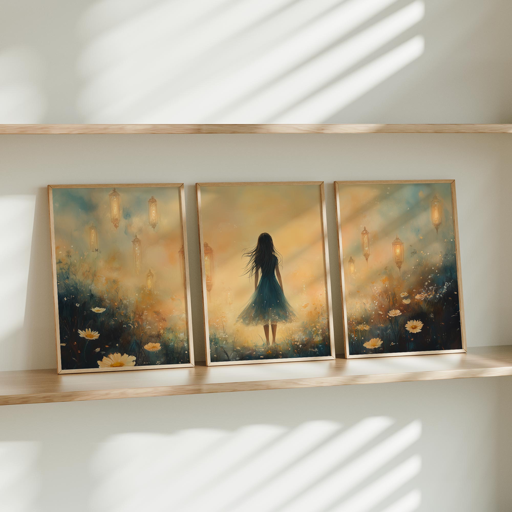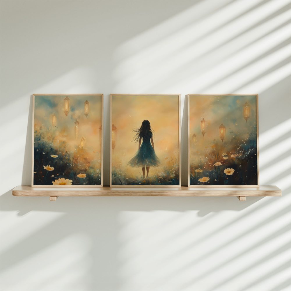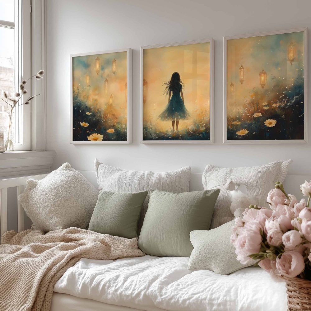 Terug naar collectie / Kinderkamer posters / Bloemen posters / Dromerig veld van bloemen en blauwe jurk