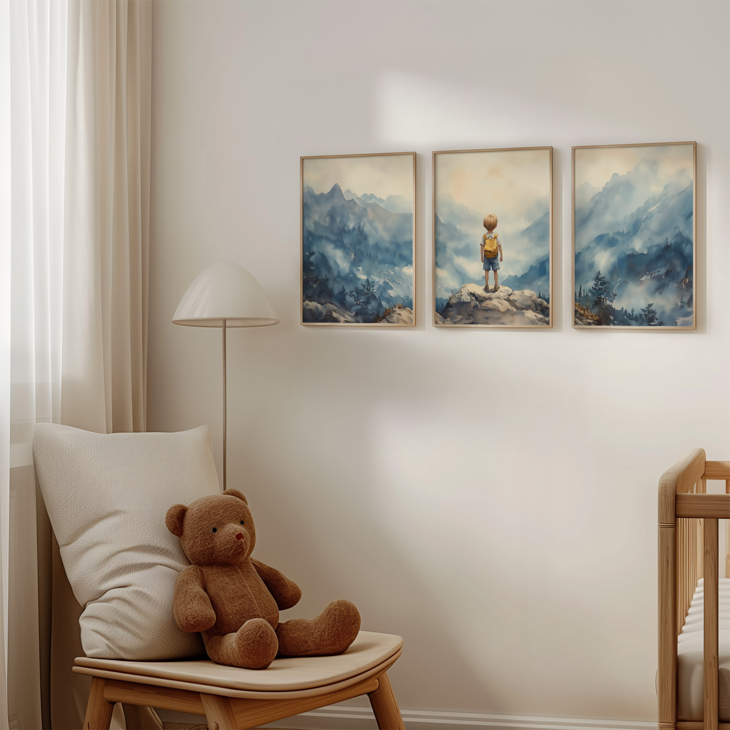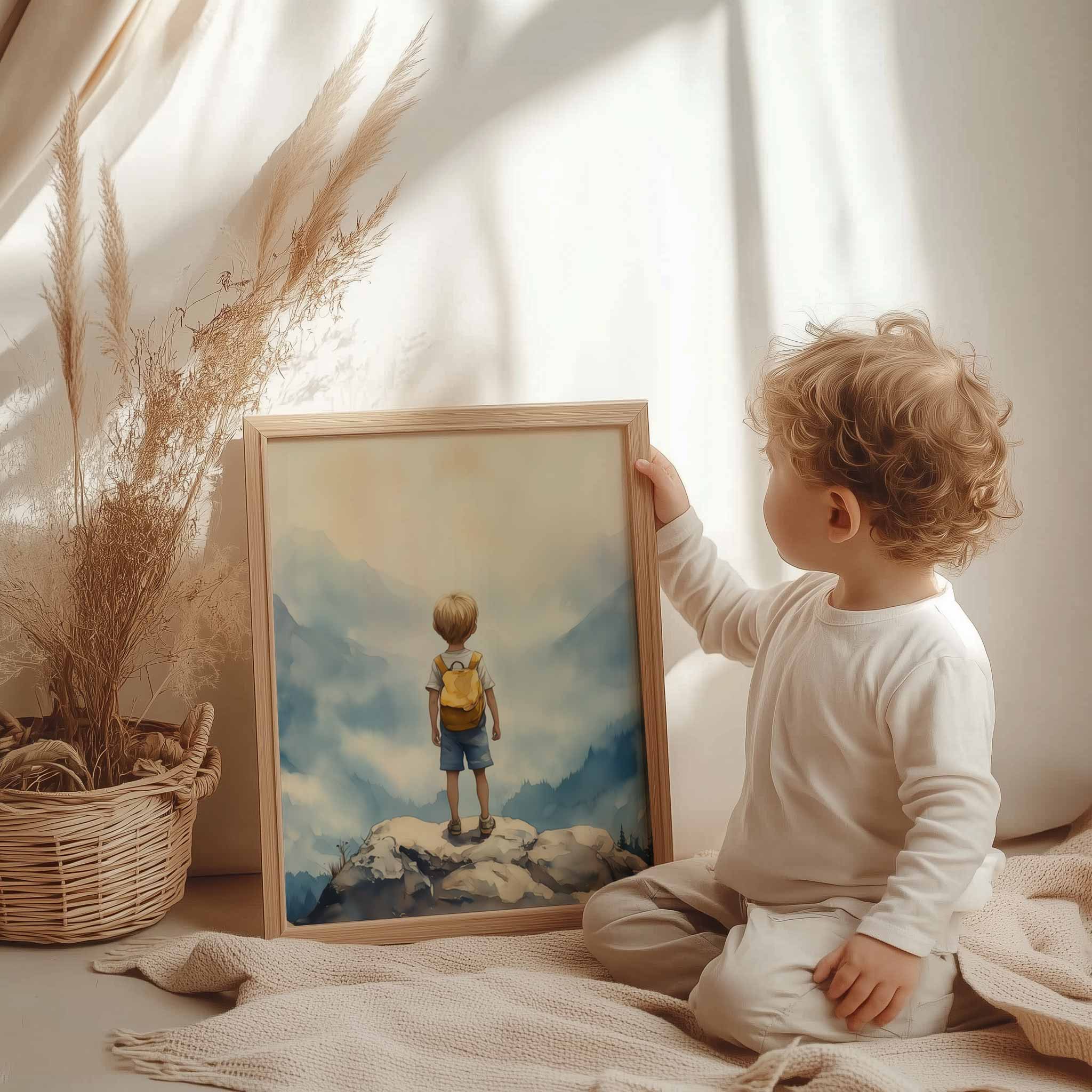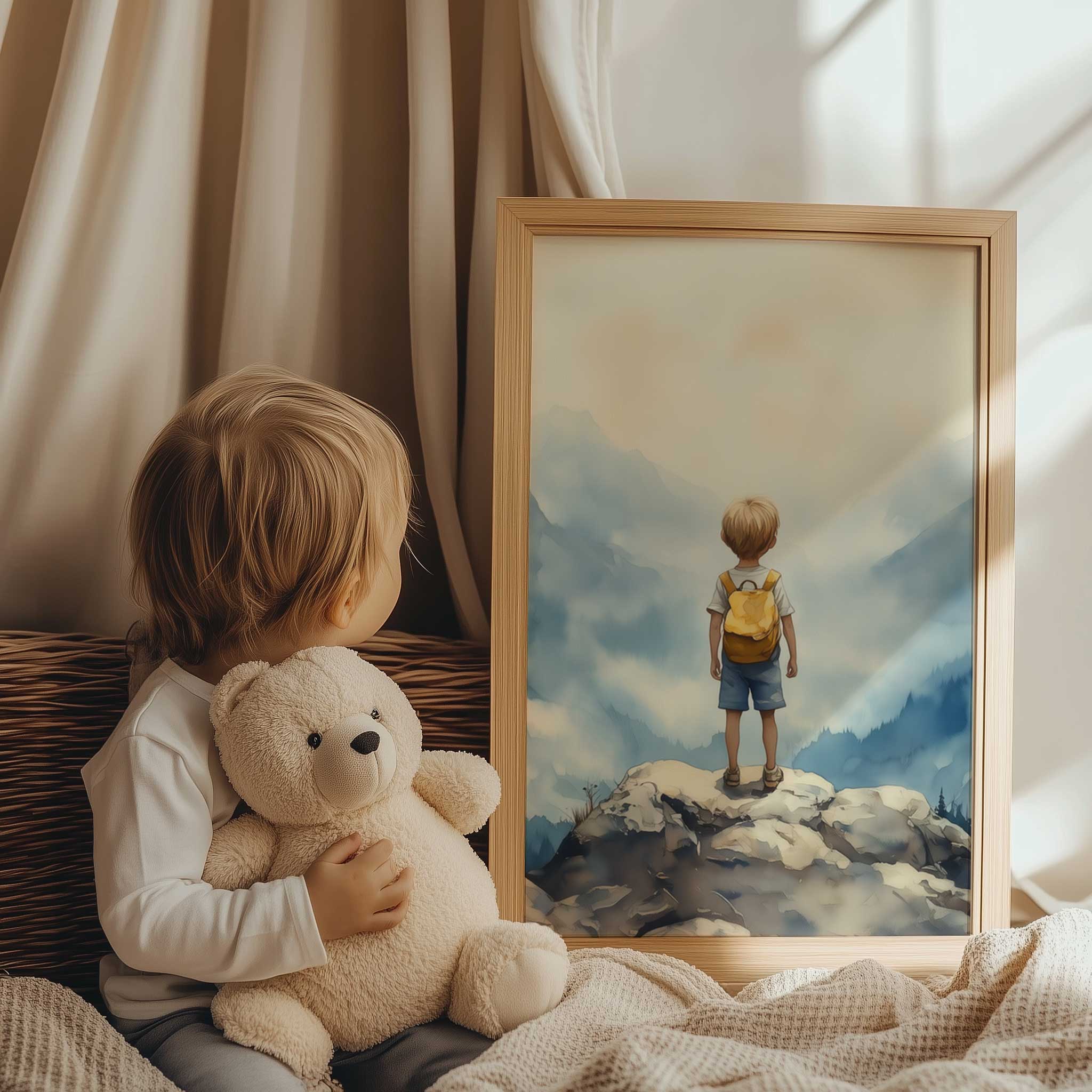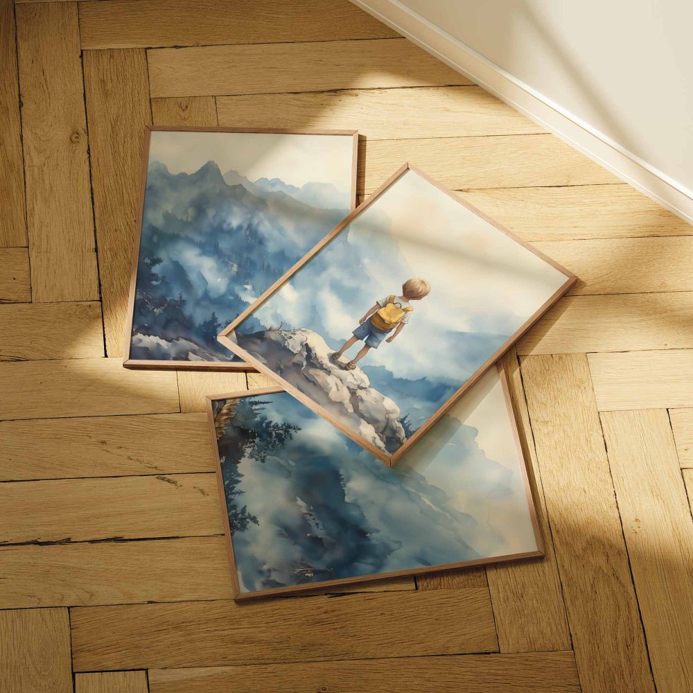 Terug naar collectie / Kinderkamer posters / Avontuurlijk posters / Dromerige Bergverkenner – Blauw-Wit Landschap voor Jongens