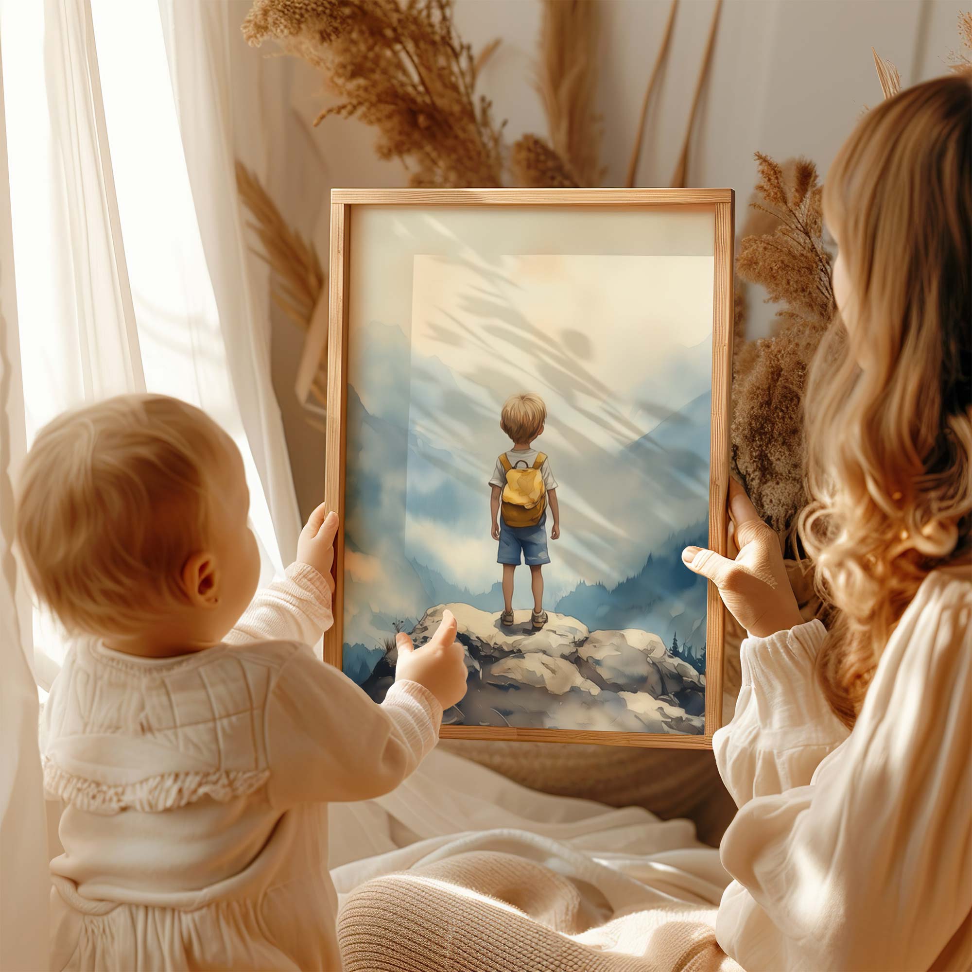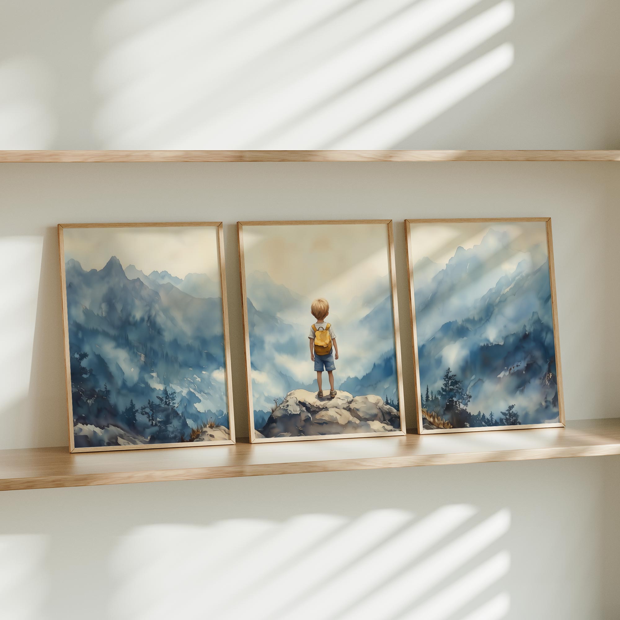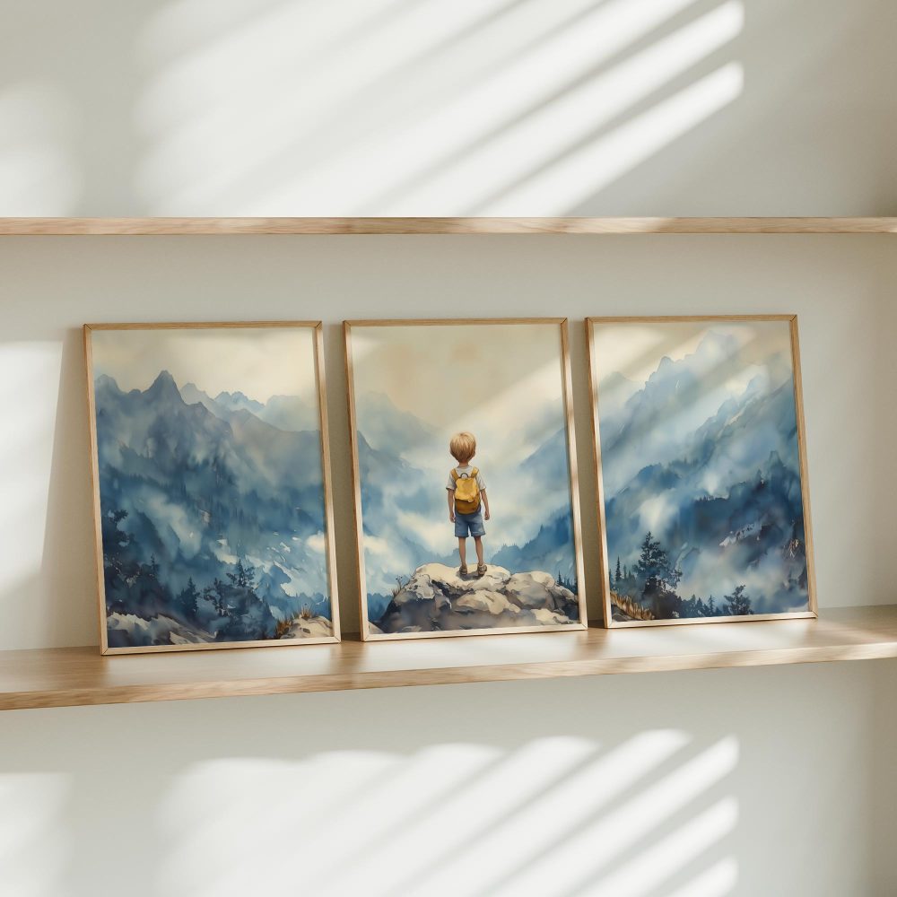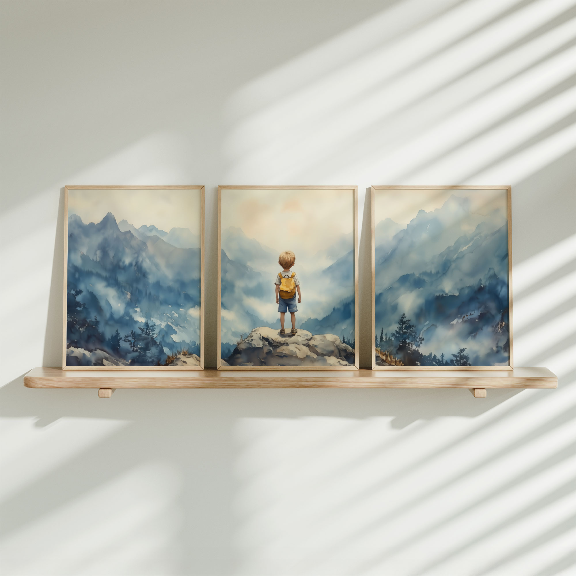 Terug naar collectie / Kinderkamer posters / Avontuurlijk posters / Dromerige Bergverkenner – Blauw-Wit Landschap voor Jongens