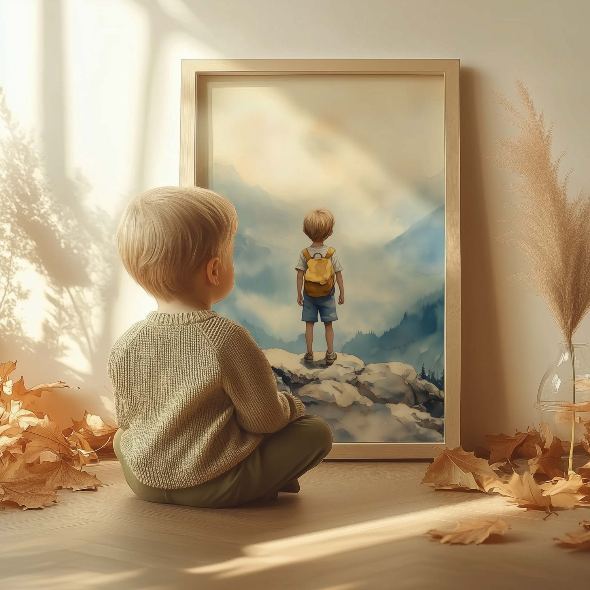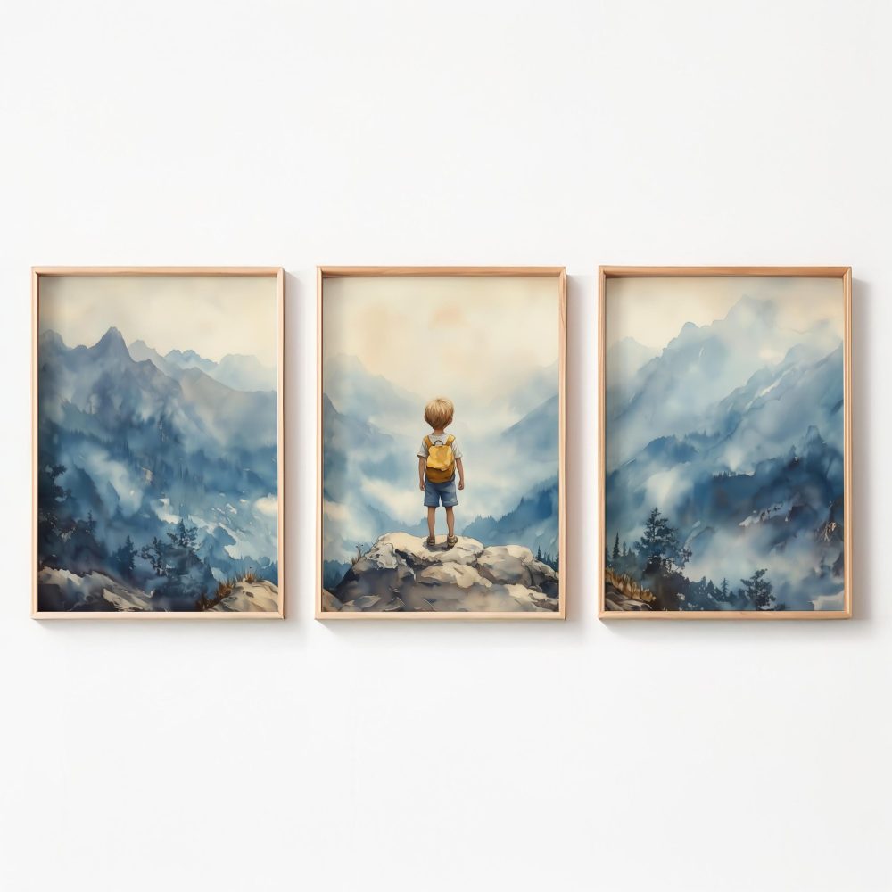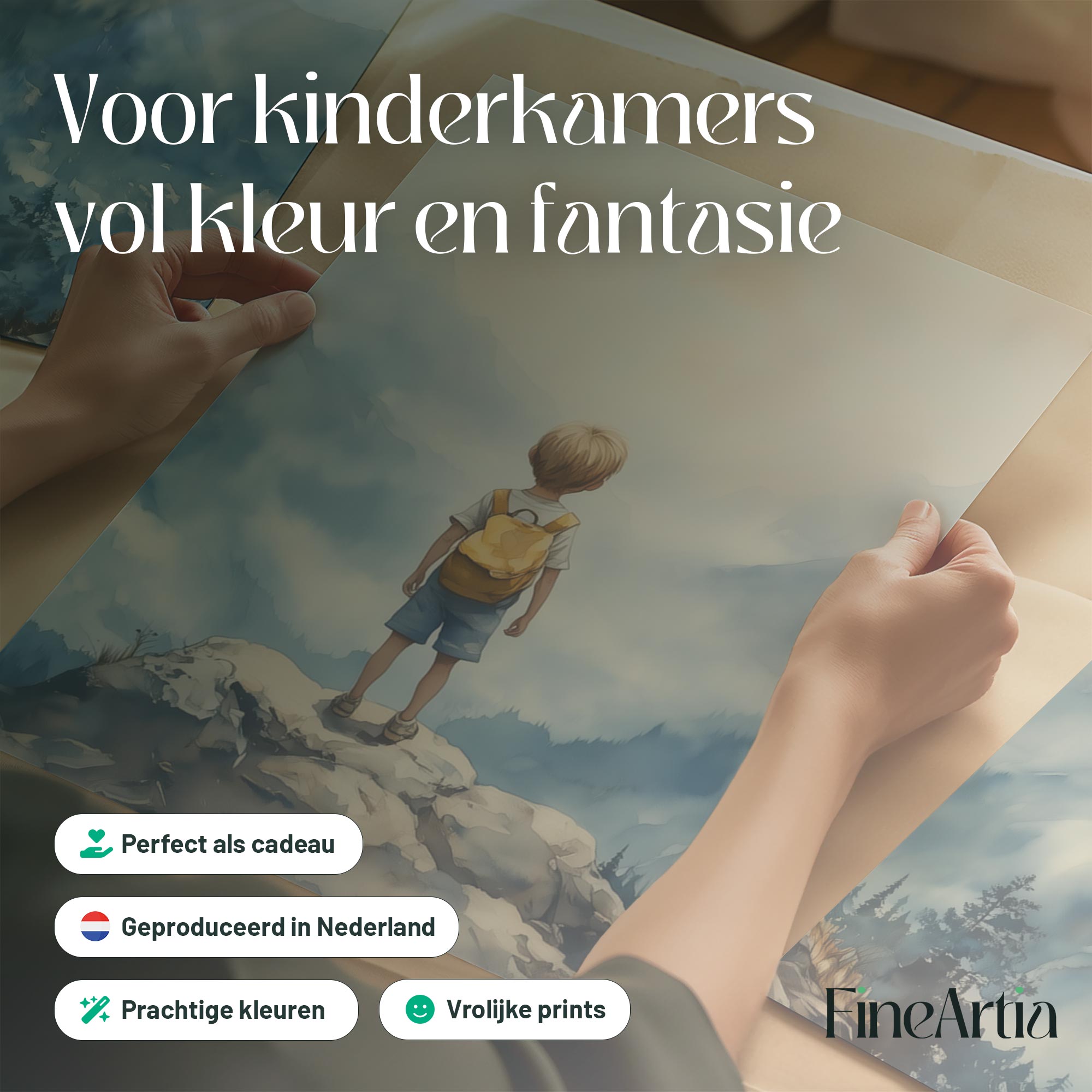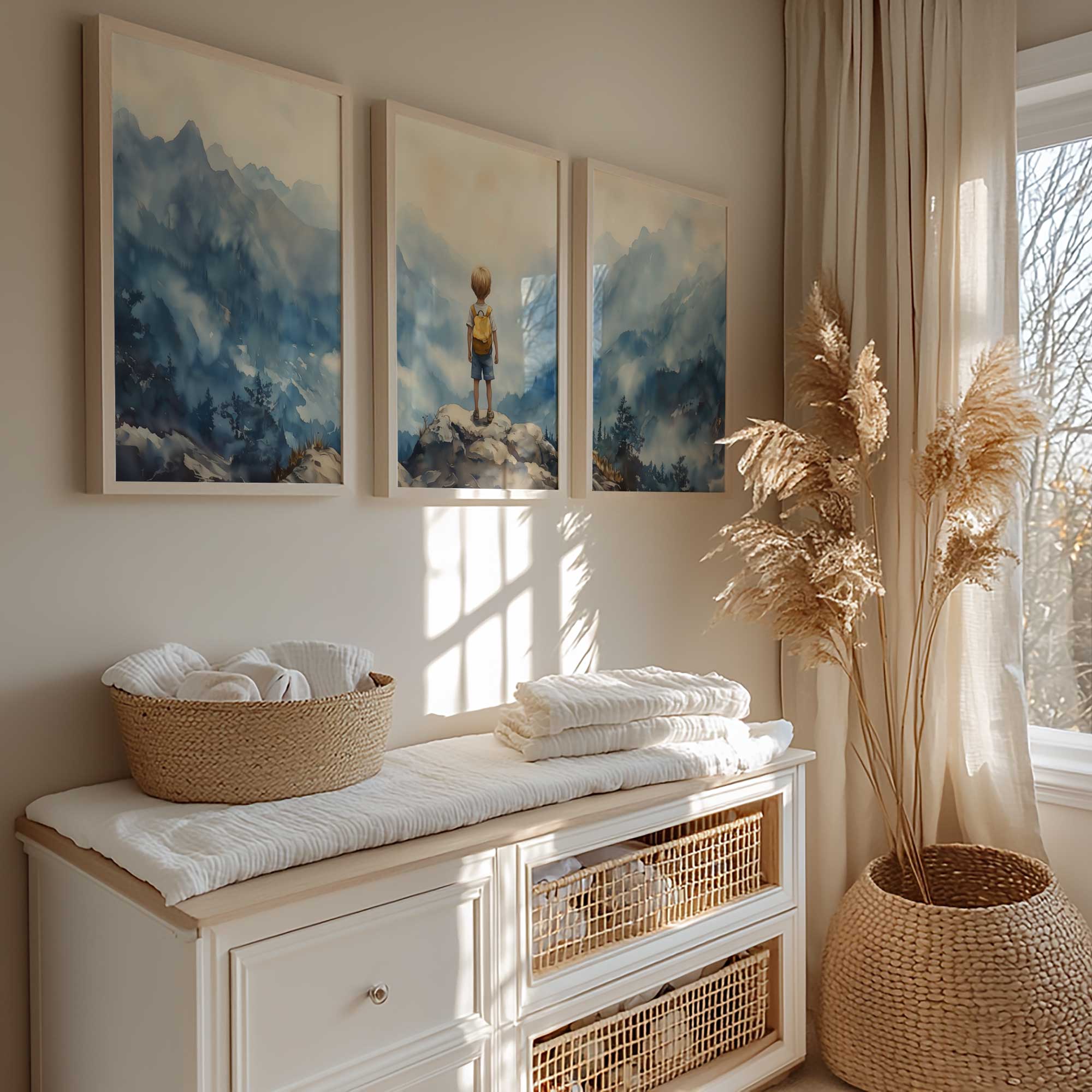 Terug naar collectie / Kinderkamer posters / Avontuurlijk posters / Dromerige Bergverkenner – Blauw-Wit Landschap voor Jongens