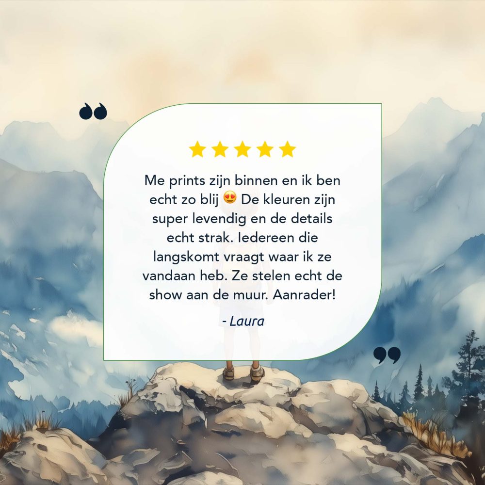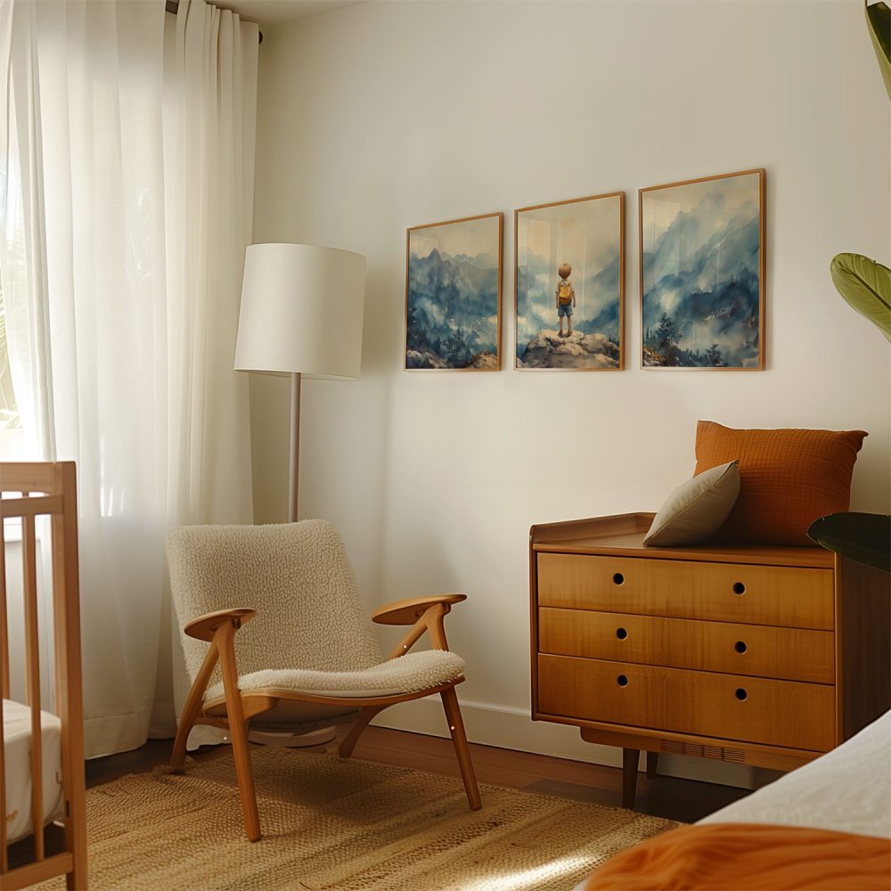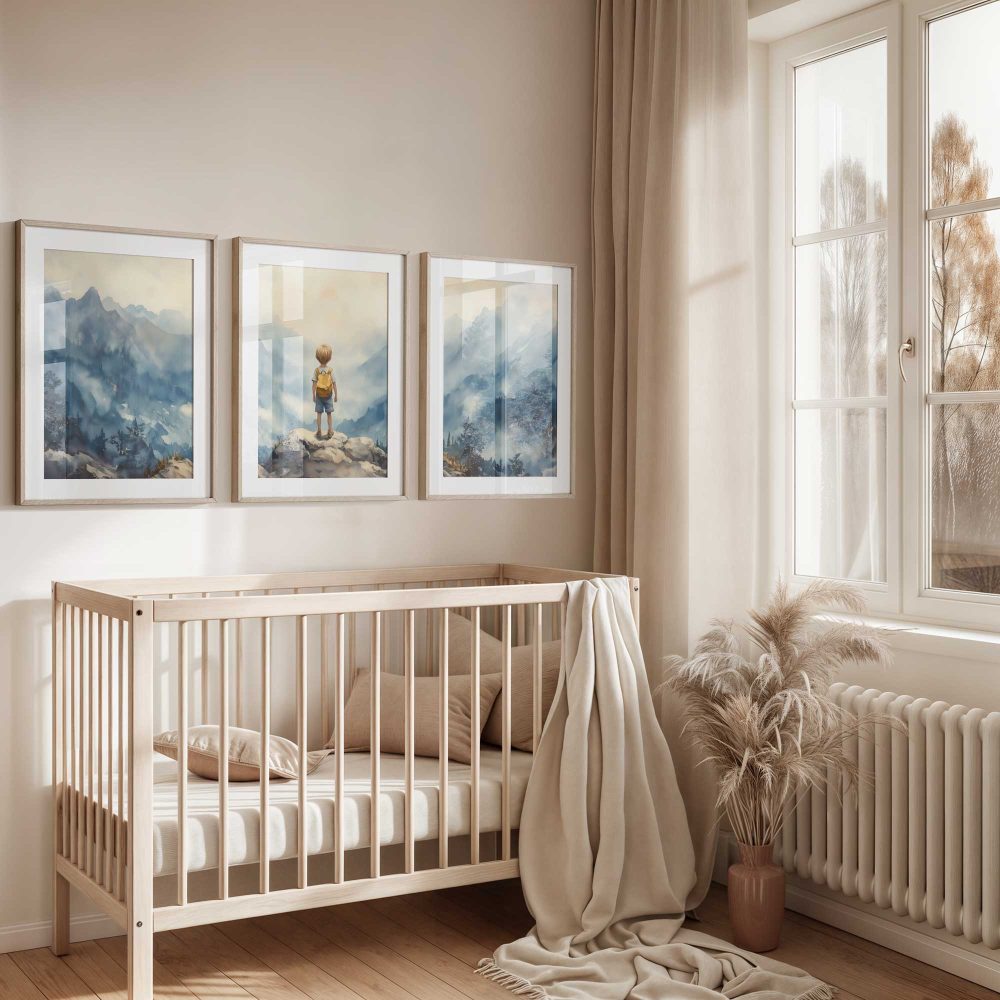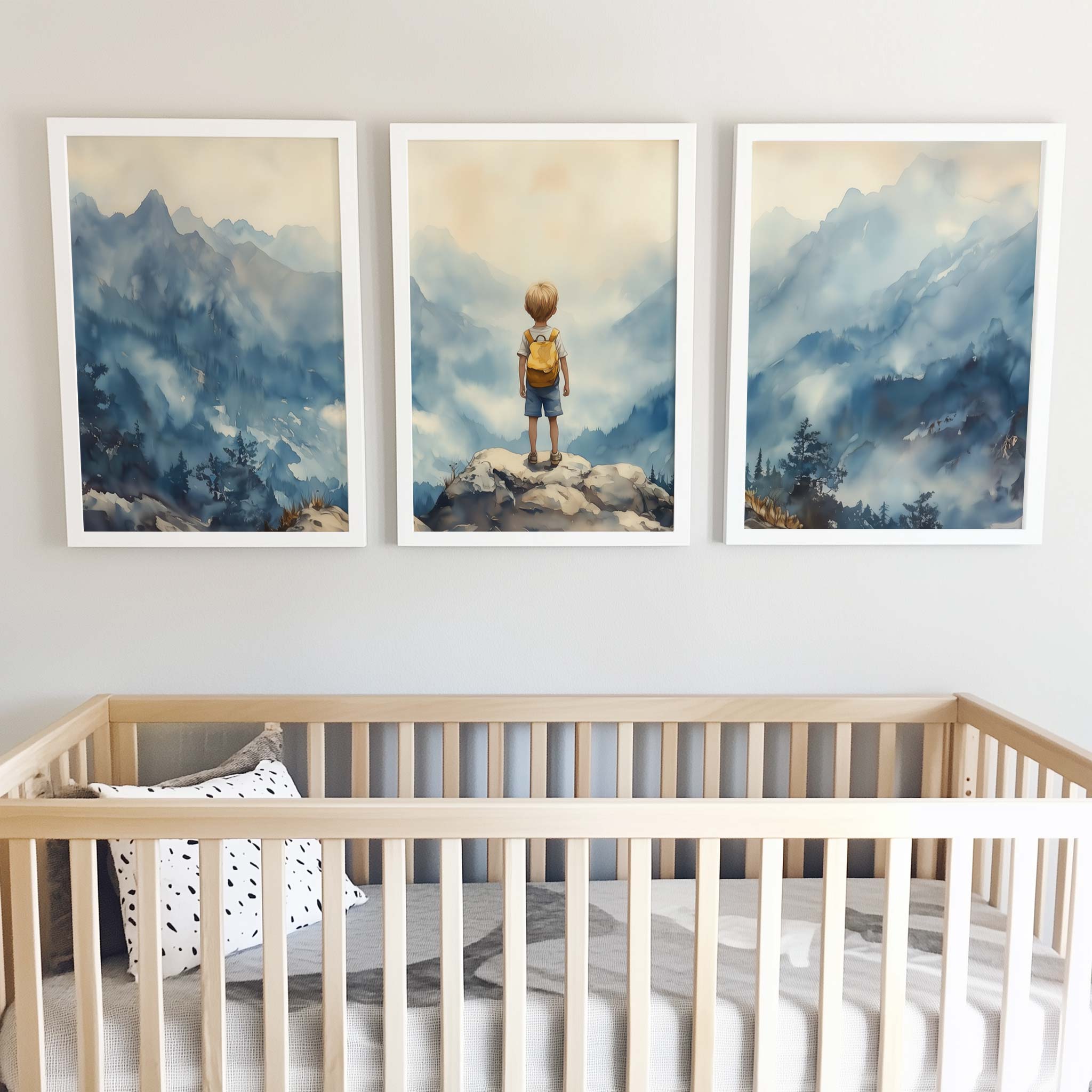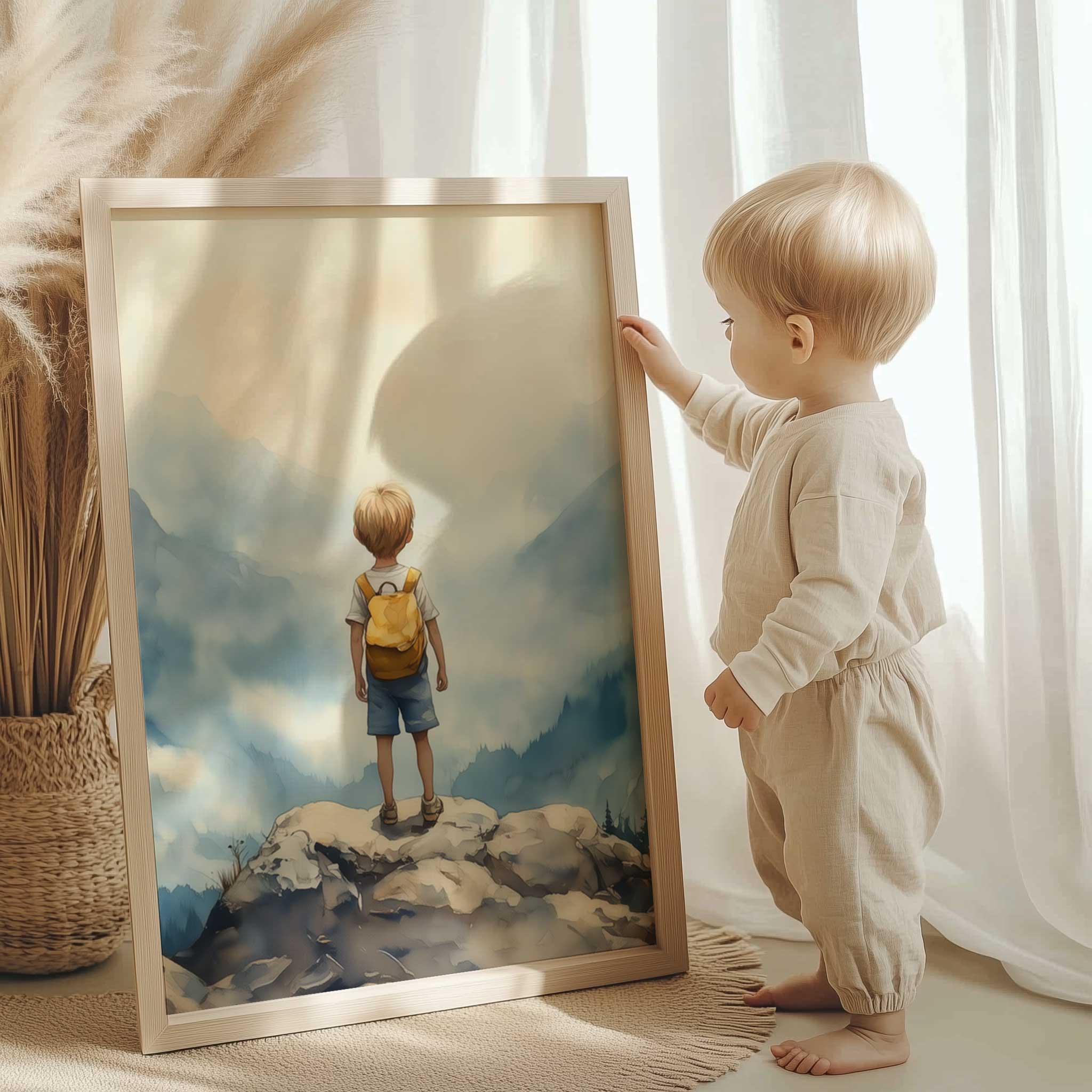 Terug naar collectie / Kinderkamer posters / Avontuurlijk posters / Dromerige Bergverkenner – Blauw-Wit Landschap voor Jongens