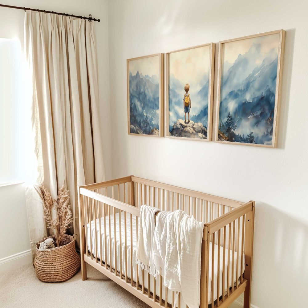 Dromerige Bergverkenner – Blauw-Wit Landschap voor Jongens