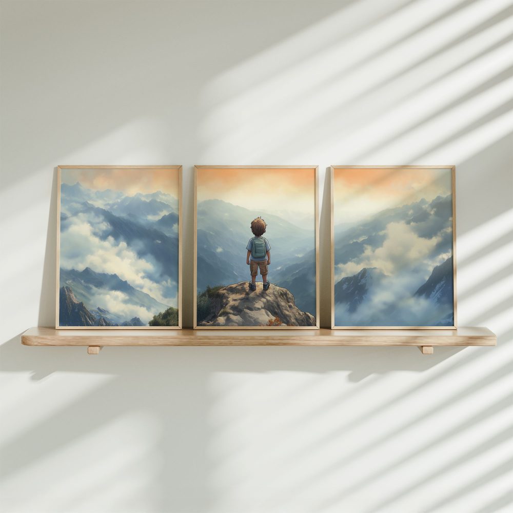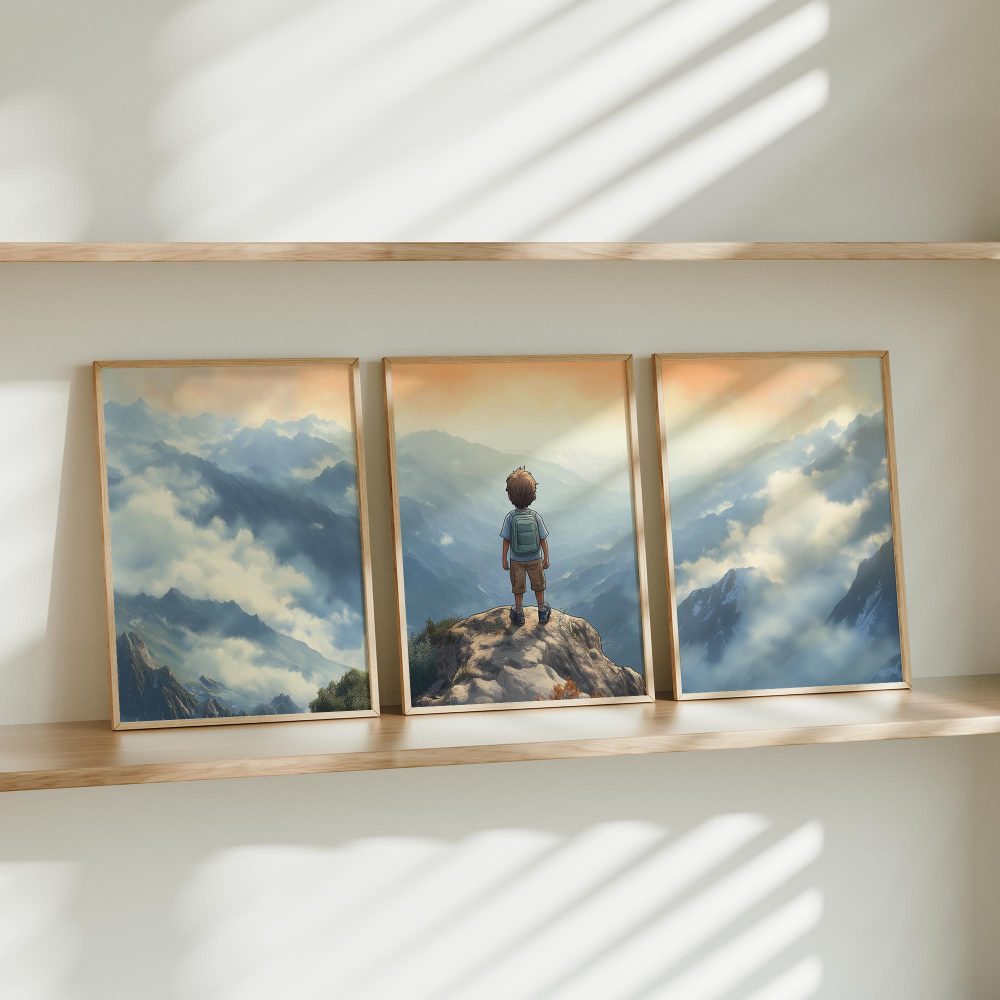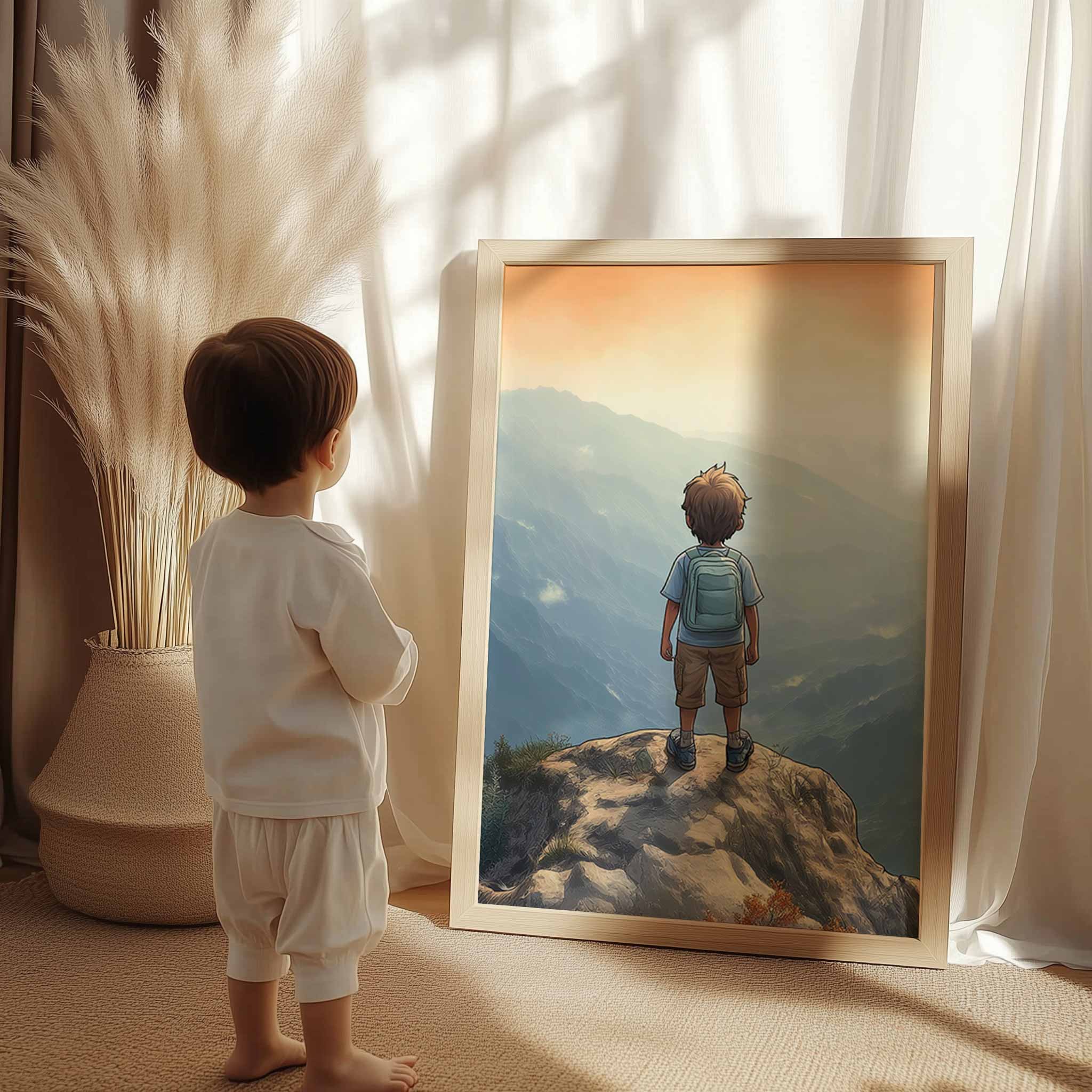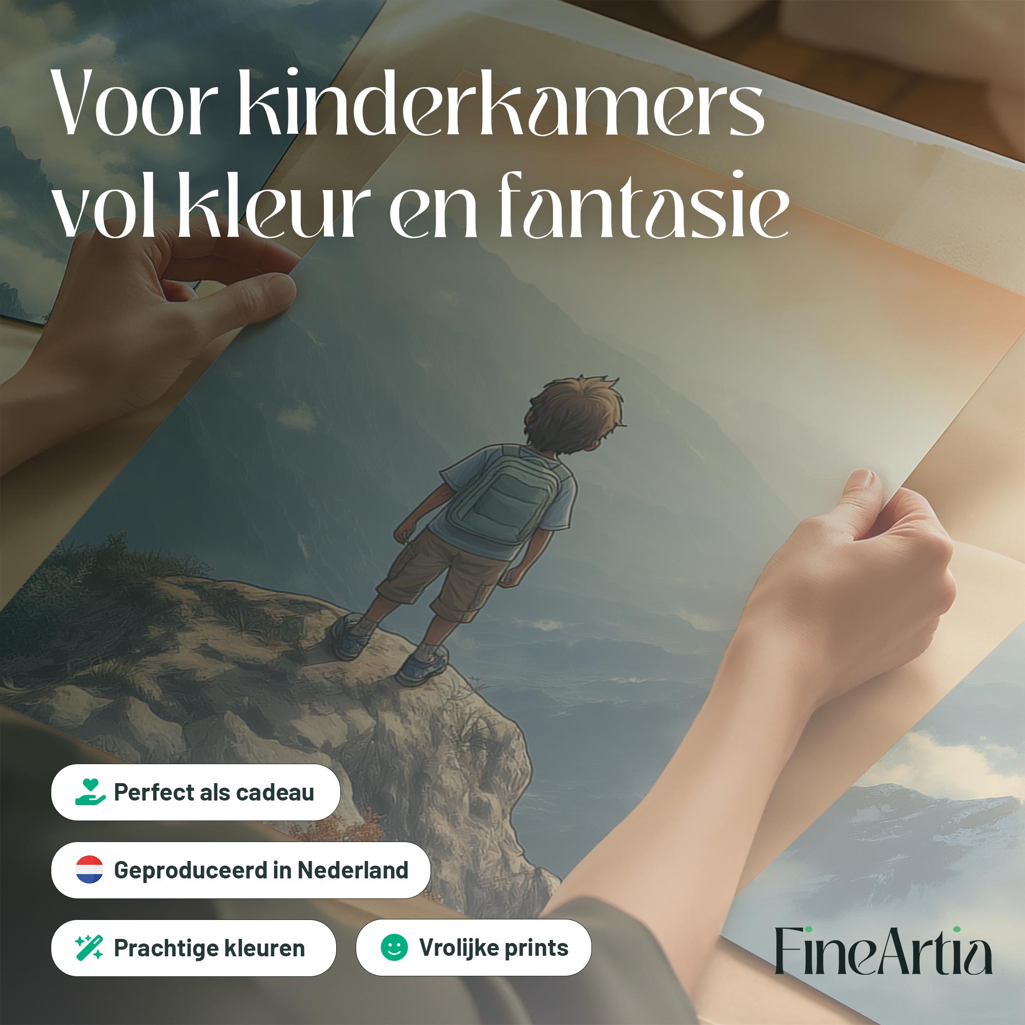 Terug naar collectie / Kinderkamer posters / Avontuurlijk posters / Dromerige Bergverkenner – Serene Illustratie voor Jongens