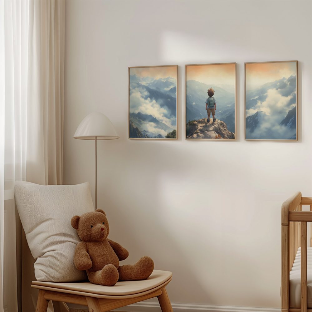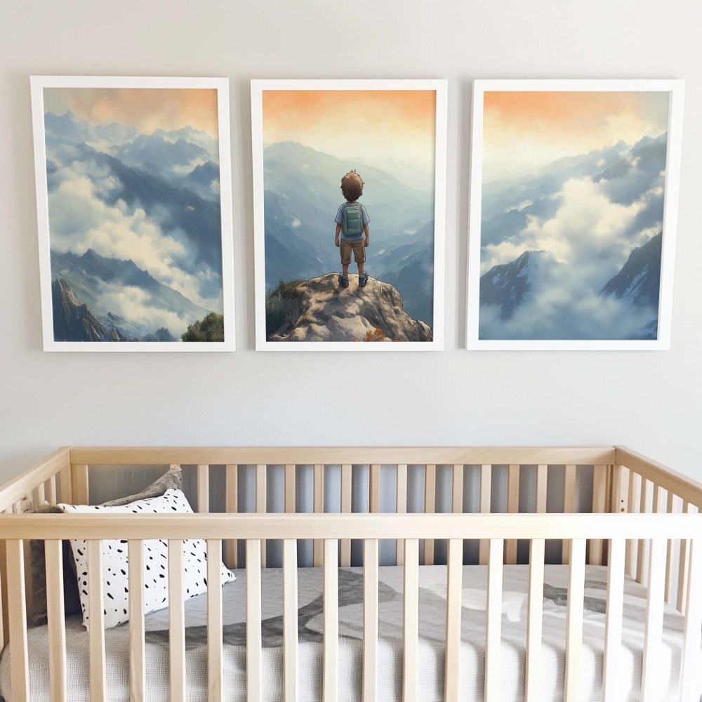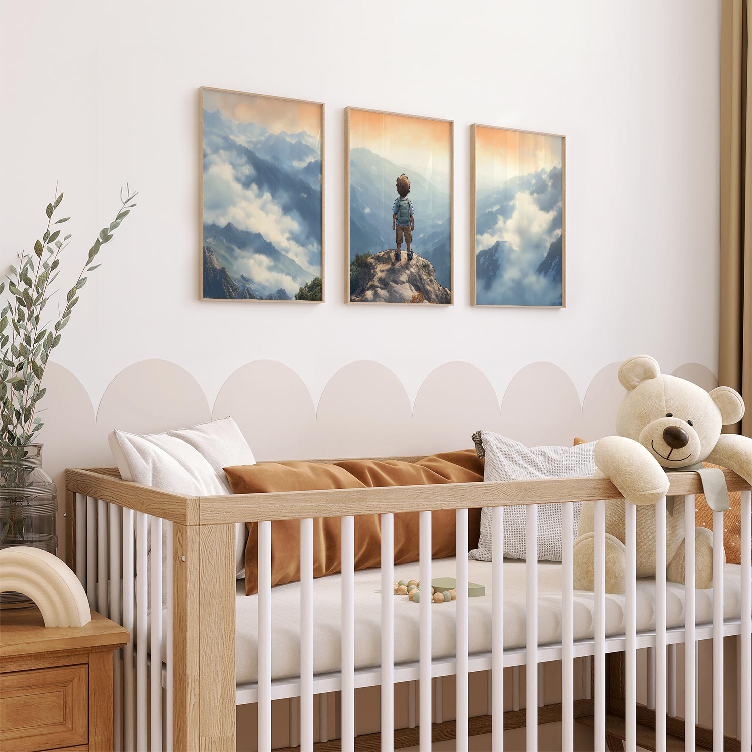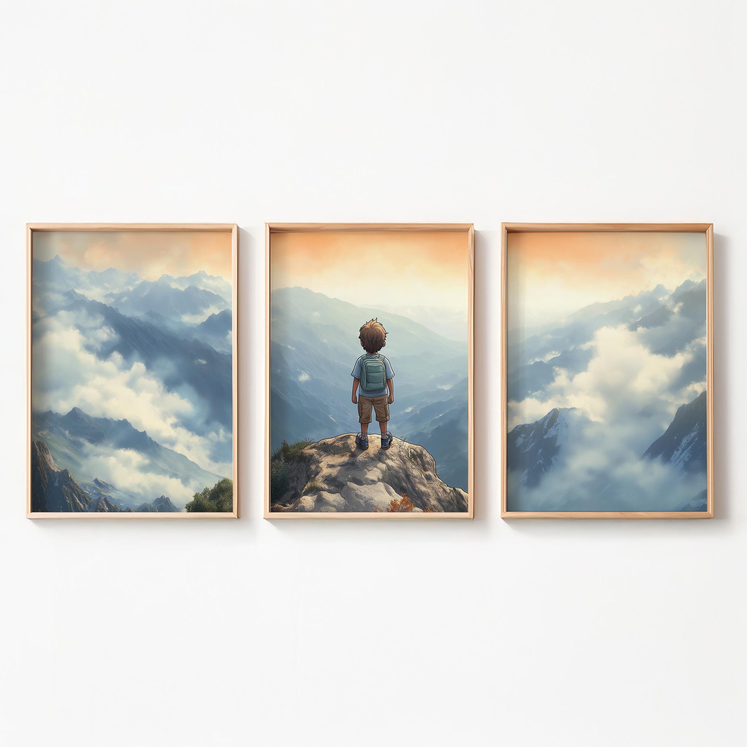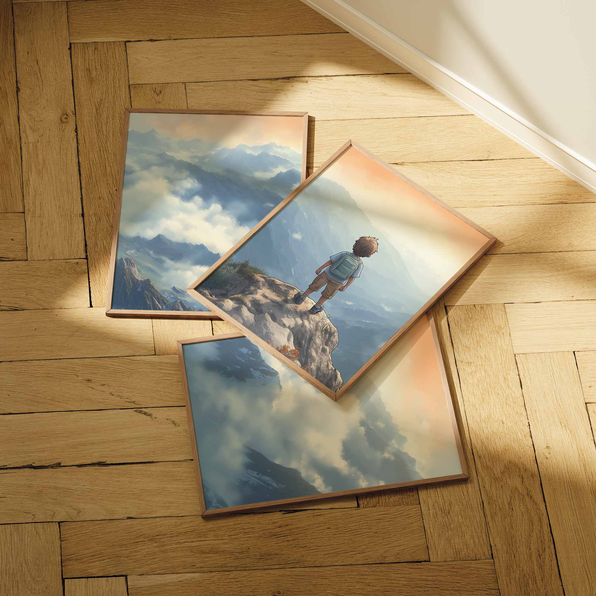 Terug naar collectie / Kinderkamer posters / Avontuurlijk posters / Dromerige Bergverkenner – Serene Illustratie voor Jongens