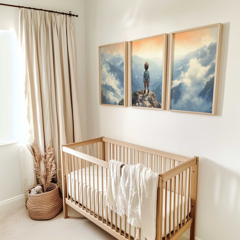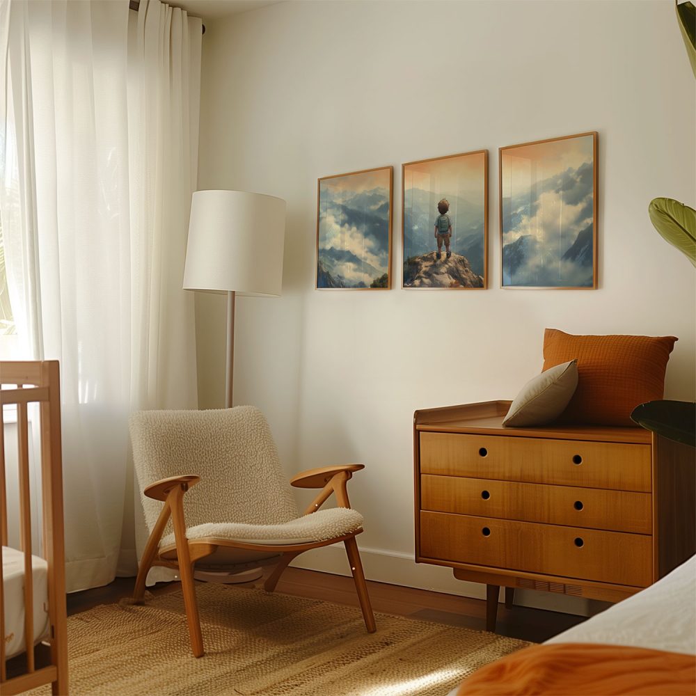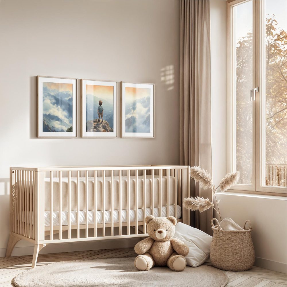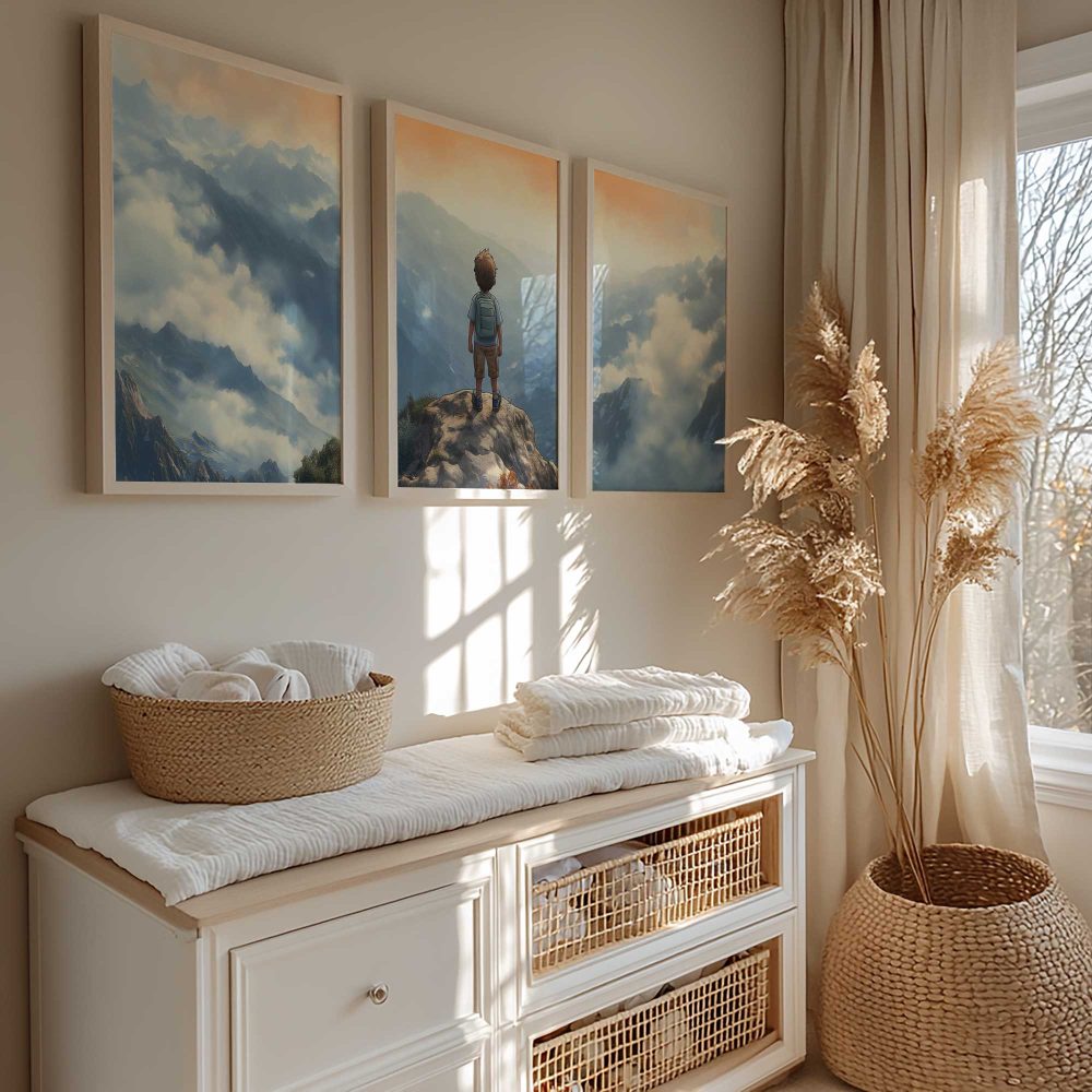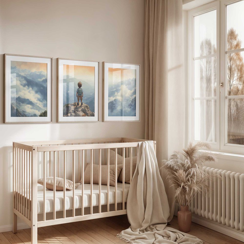 Terug naar collectie / Kinderkamer posters / Avontuurlijk posters / Dromerige Bergverkenner – Serene Illustratie voor Jongens