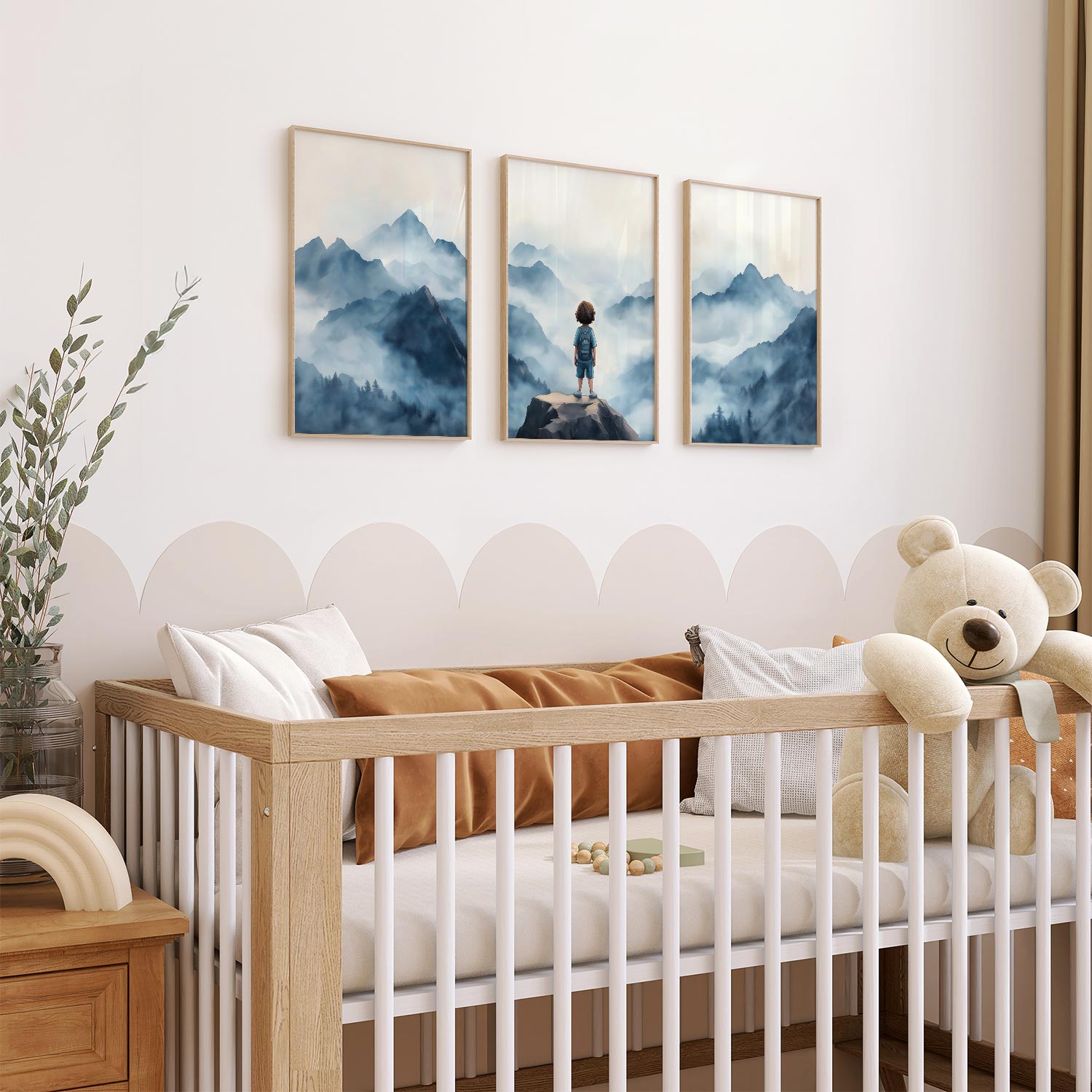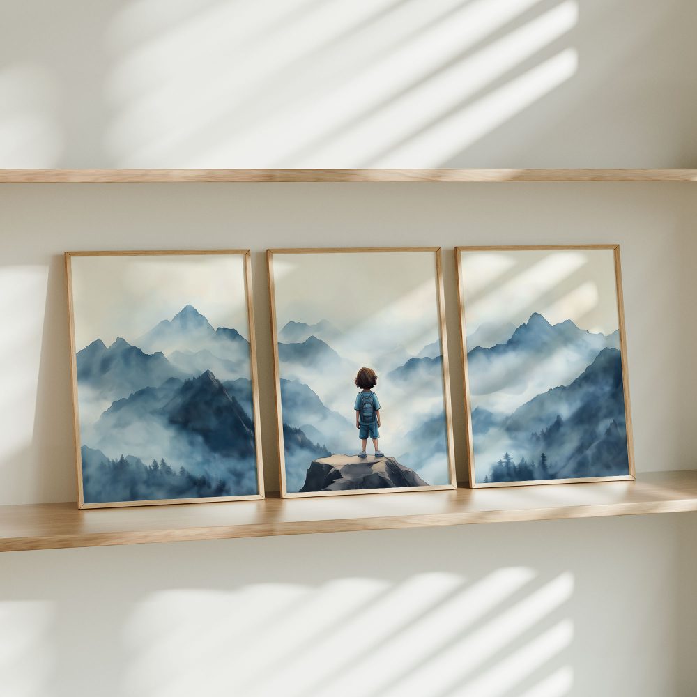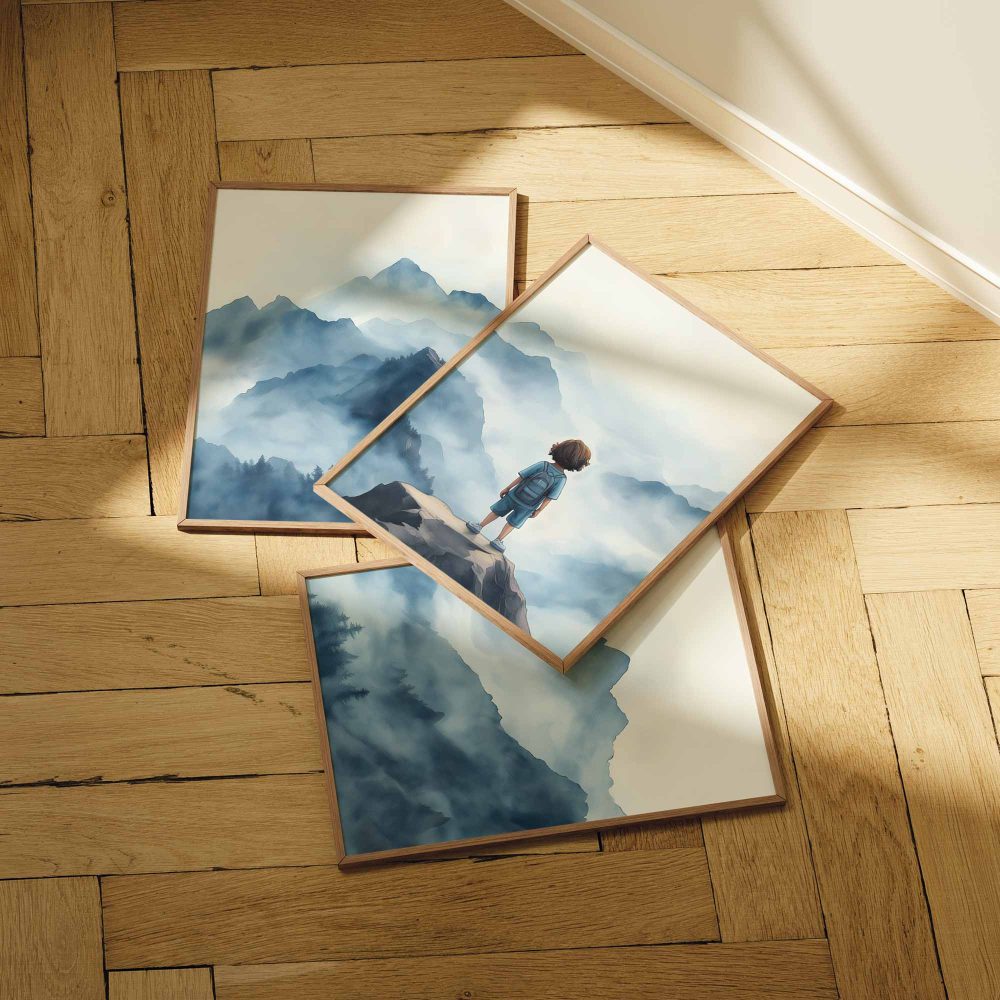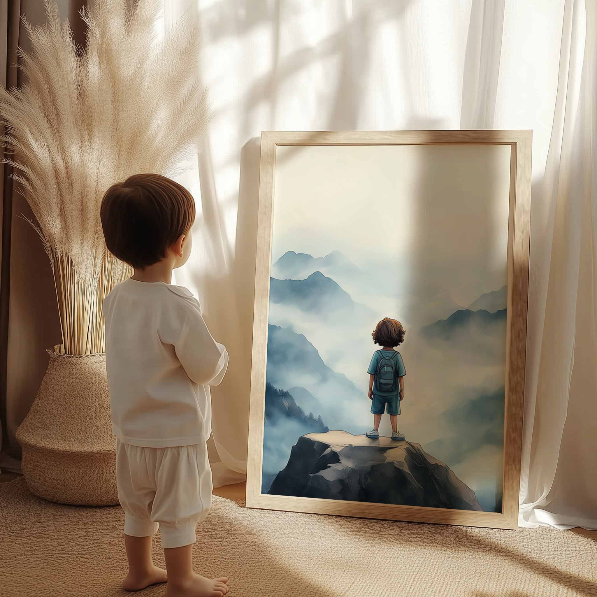 Terug naar collectie / Kinderkamer posters / Avontuurlijk posters / Dromerige Bergverkenner – Serene Illustratie voor Jongens