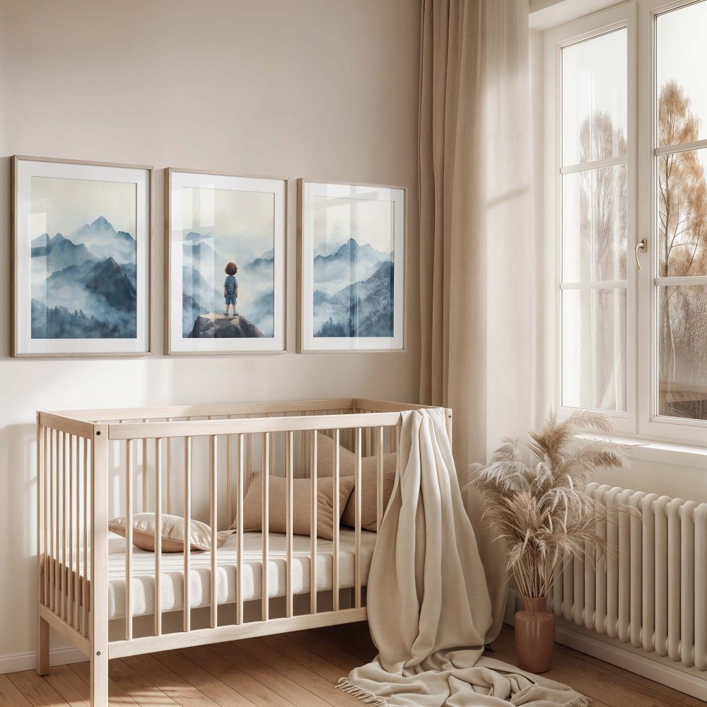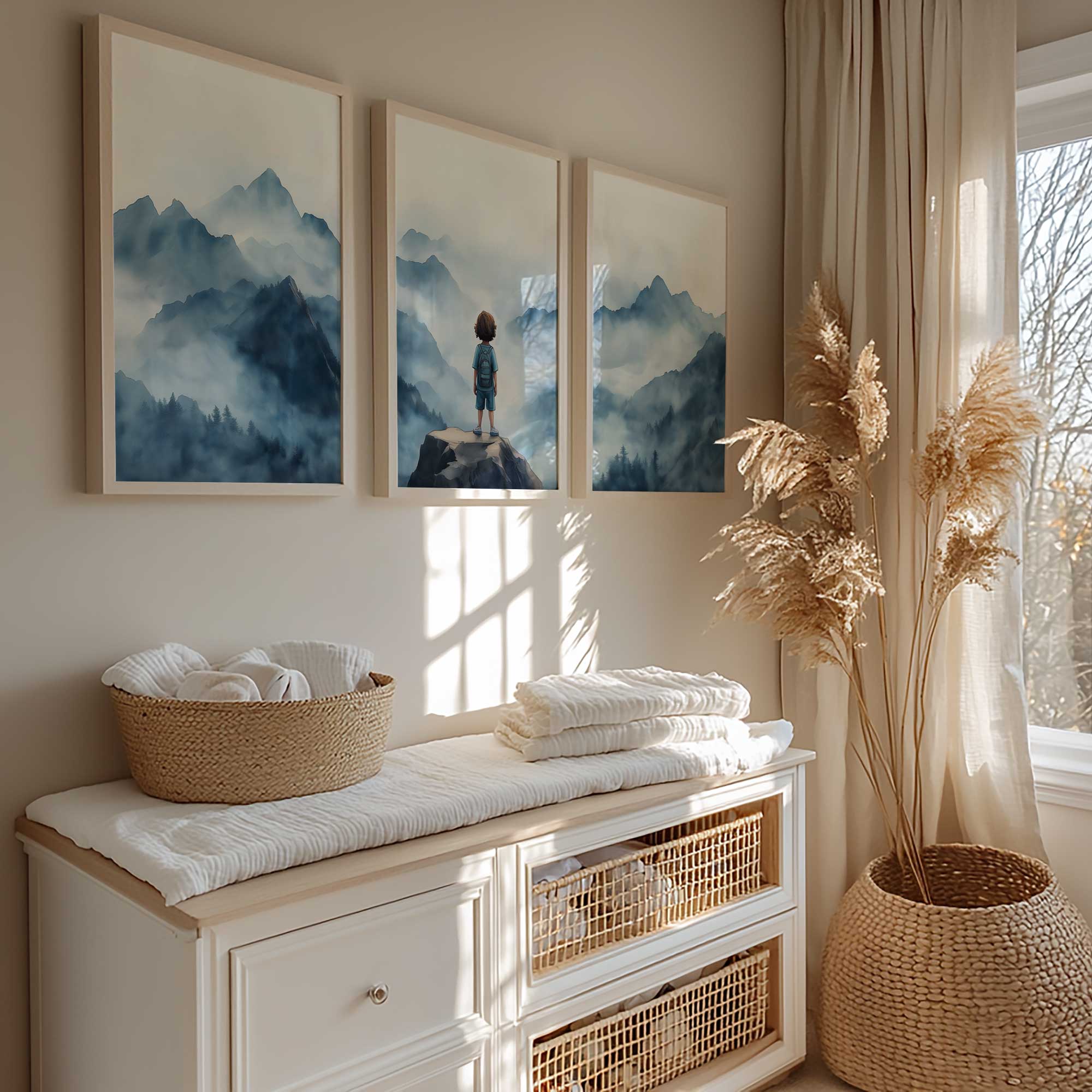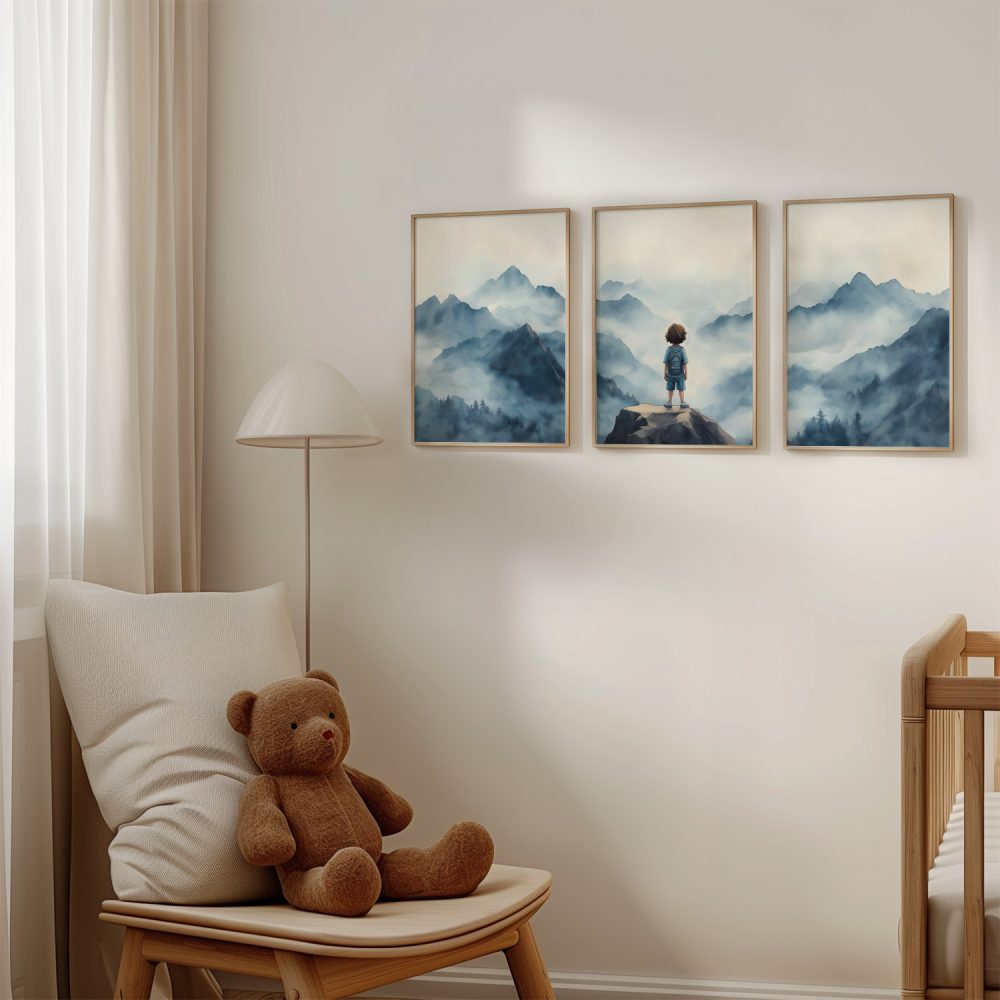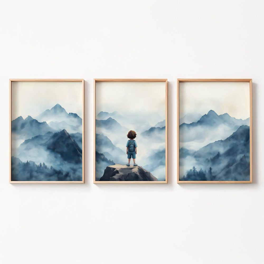Terug naar collectie / Kinderkamer posters / Avontuurlijk posters / Dromerige Bergverkenner – Serene Illustratie voor Jongens