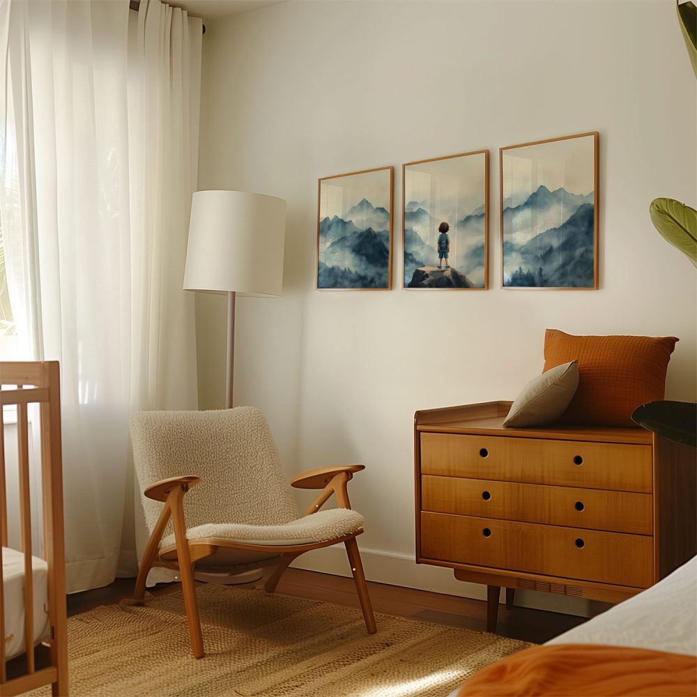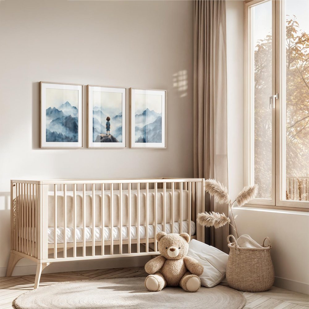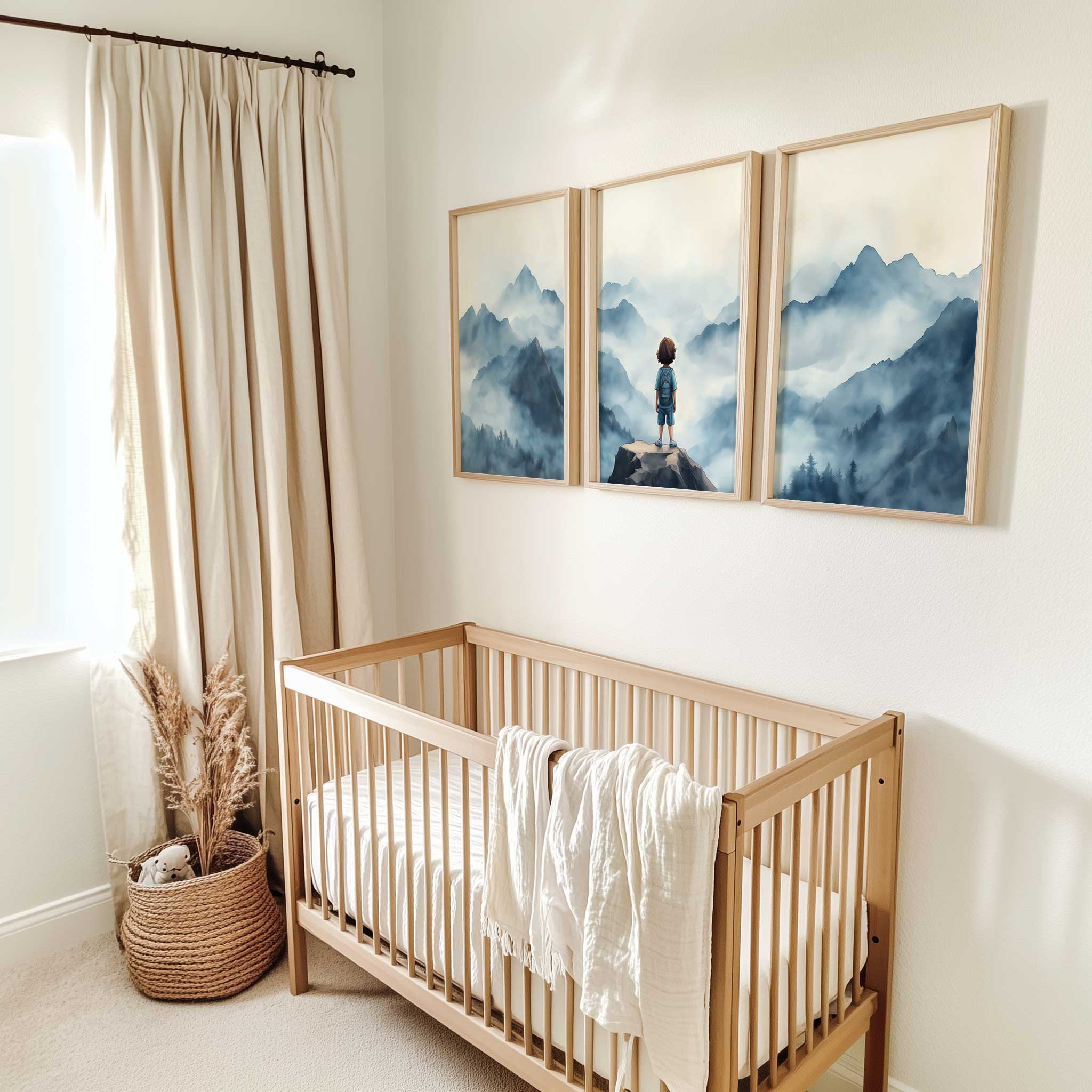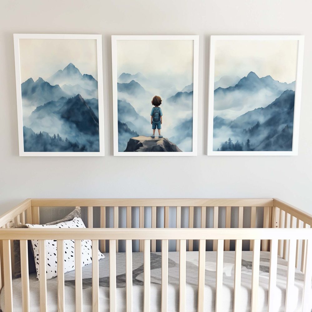 Terug naar collectie / Kinderkamer posters / Avontuurlijk posters / Dromerige Bergverkenner – Serene Illustratie voor Jongens