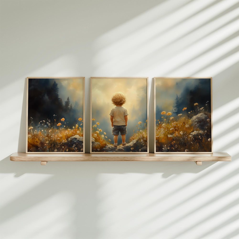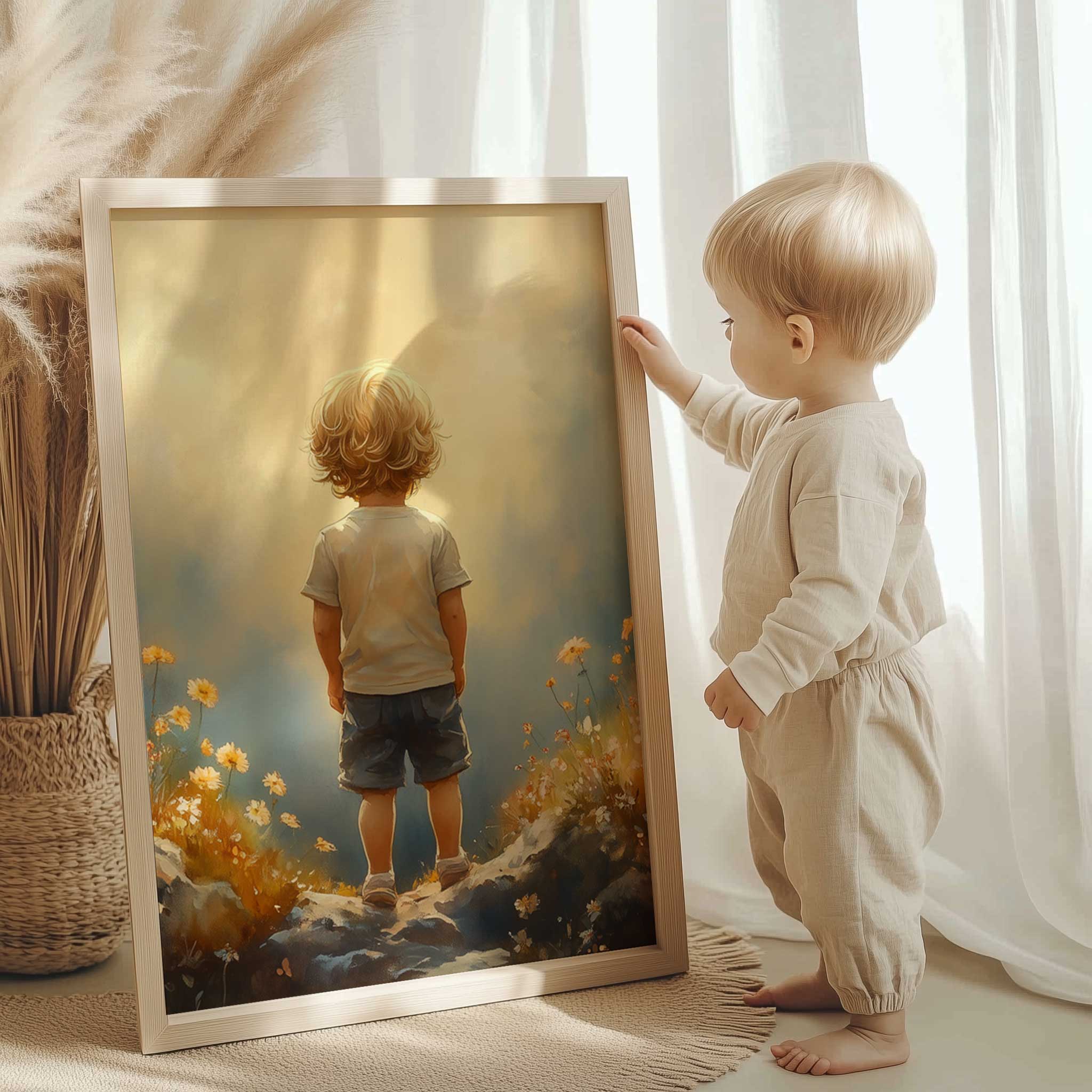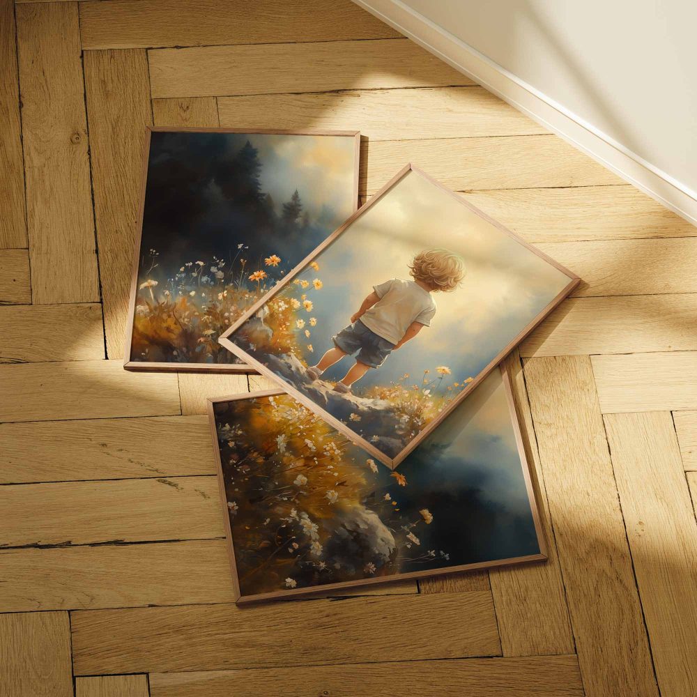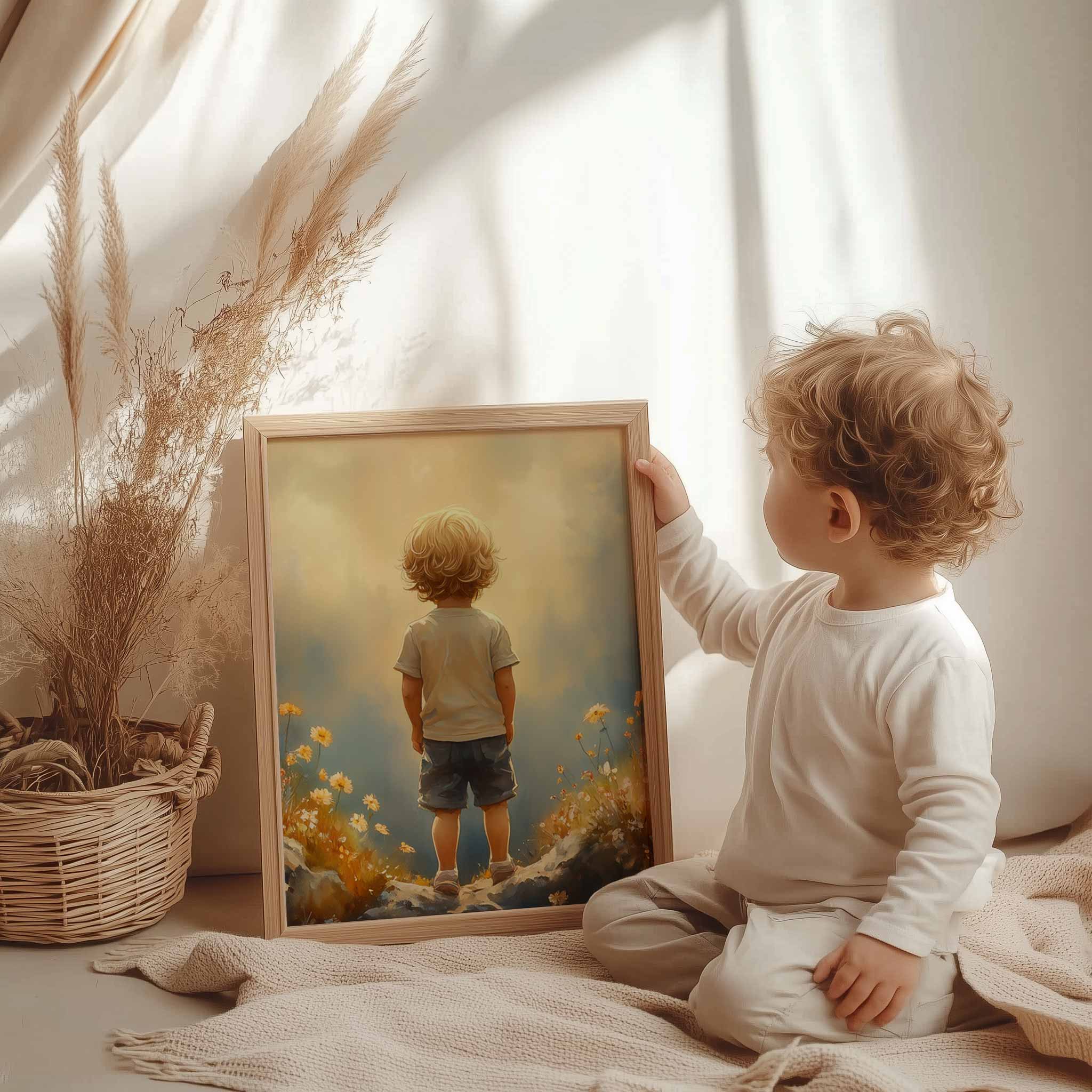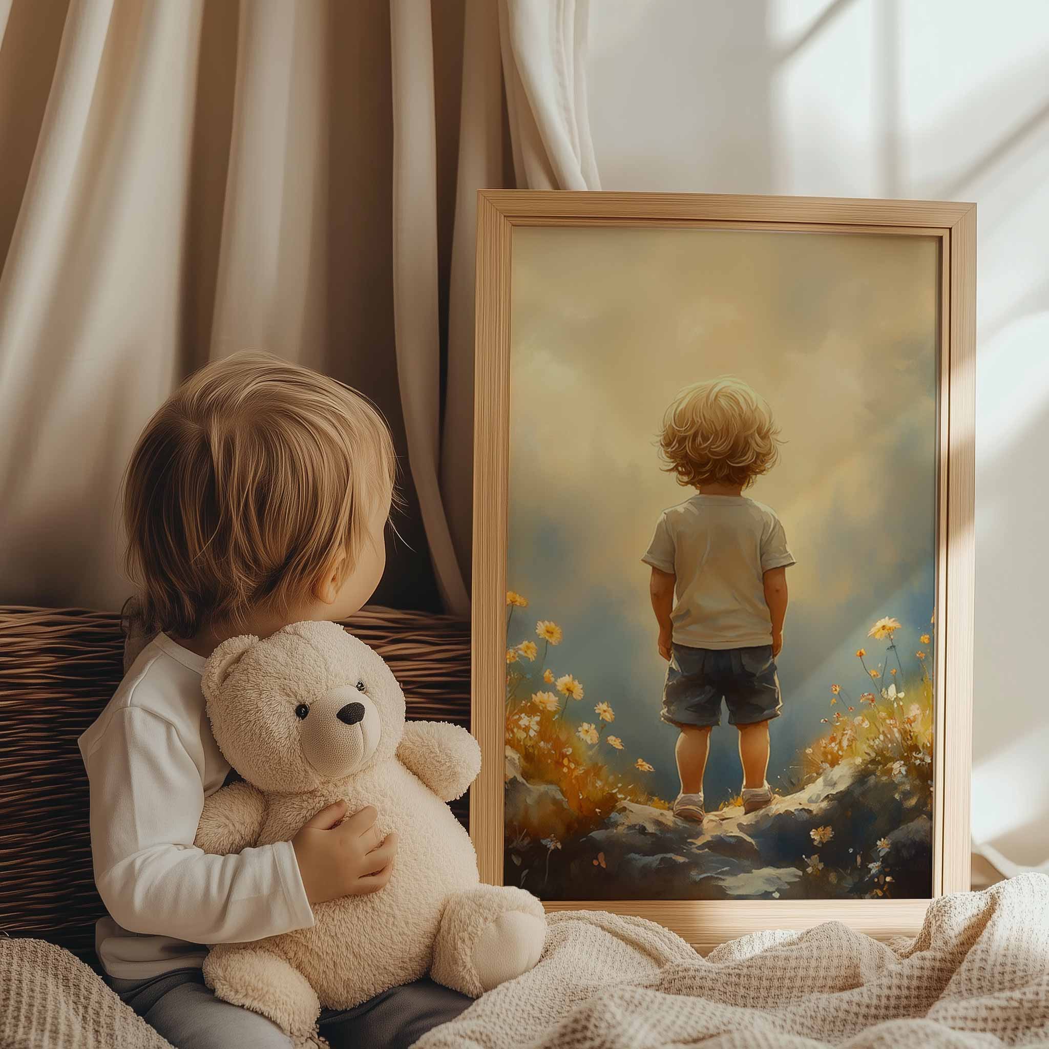 Terug naar collectie / Kinderkamer posters / Bloemen posters / Dromerige Jongen in Bloeiend Bloemenveld