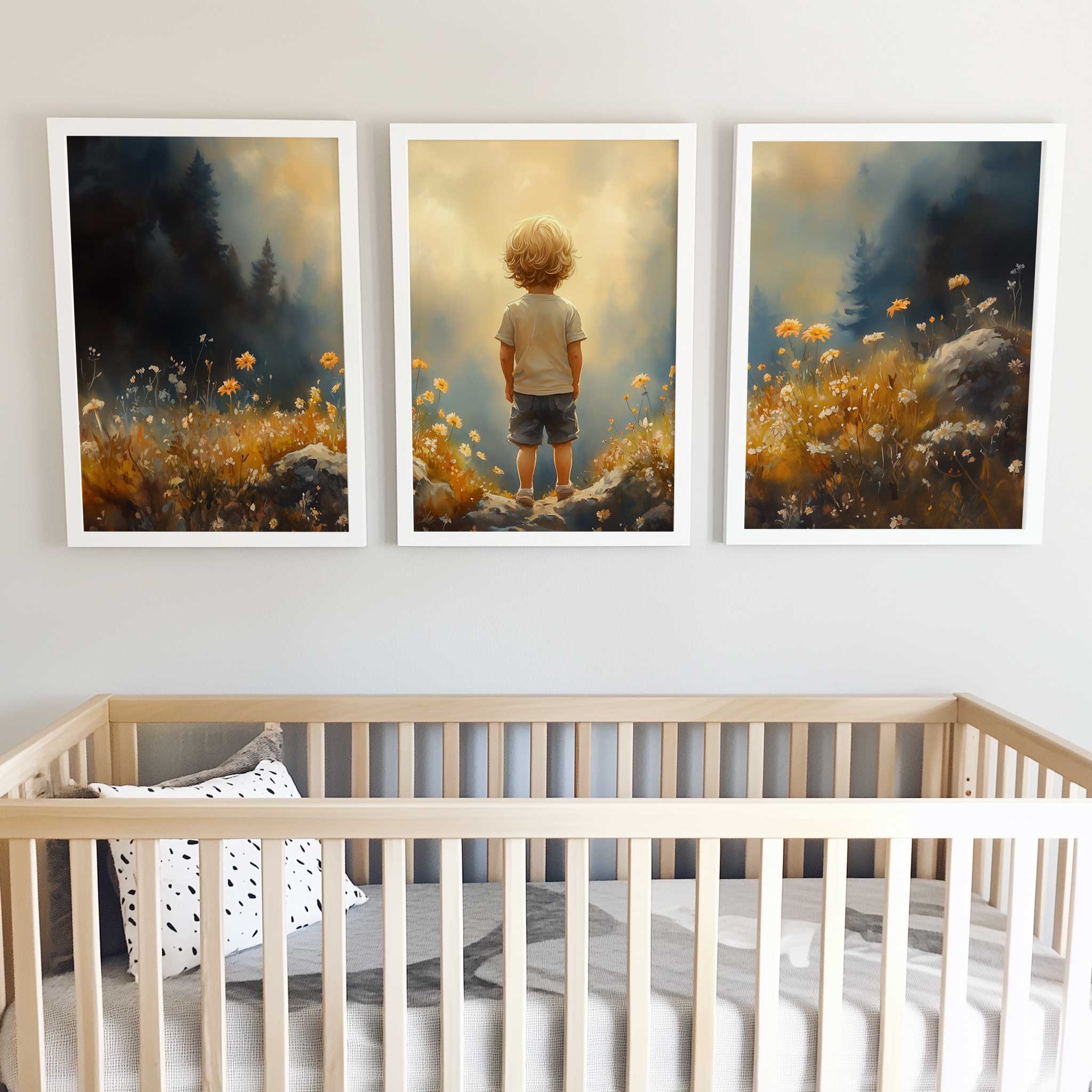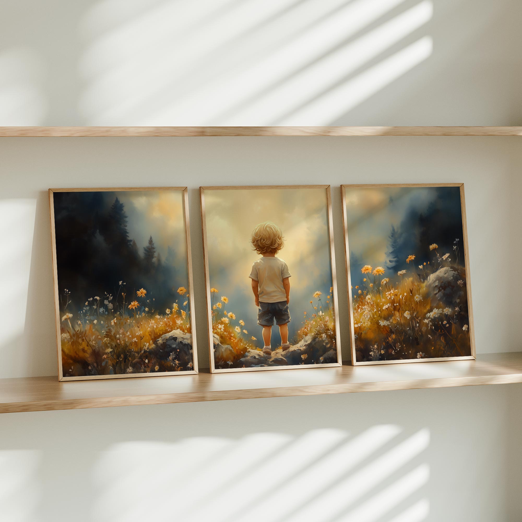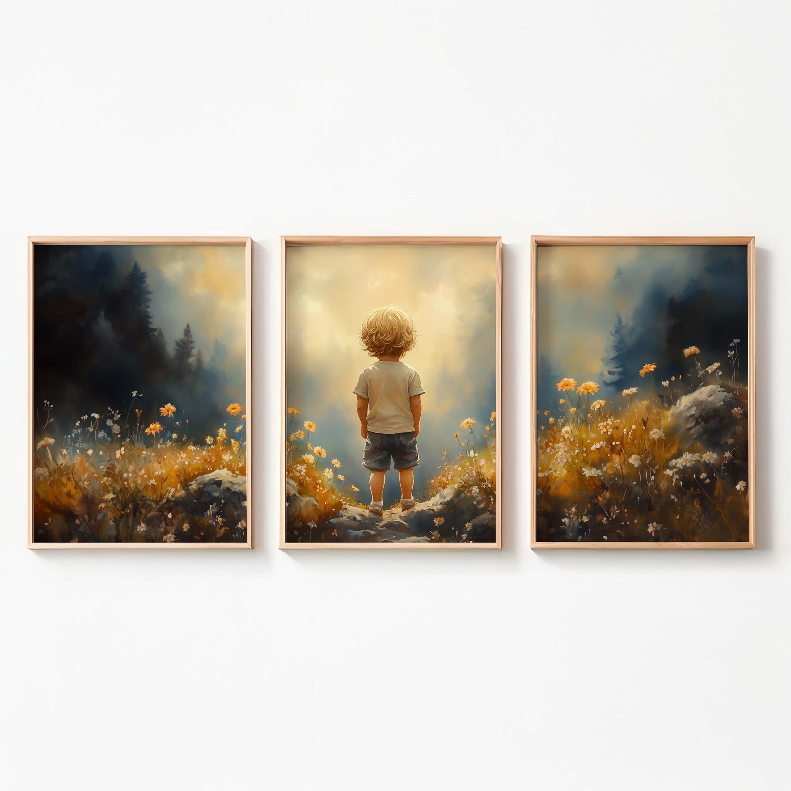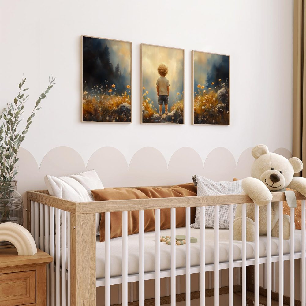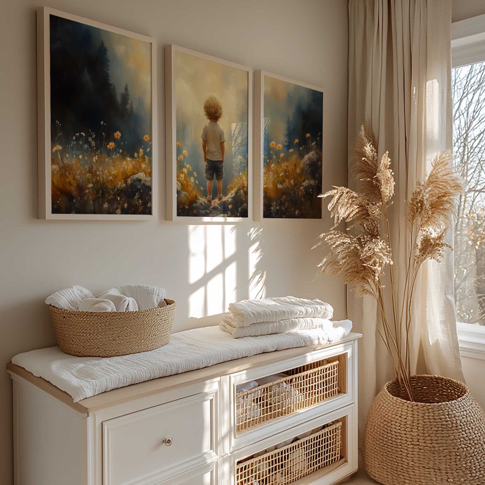 Terug naar collectie / Kinderkamer posters / Bloemen posters / Dromerige Jongen in Bloeiend Bloemenveld