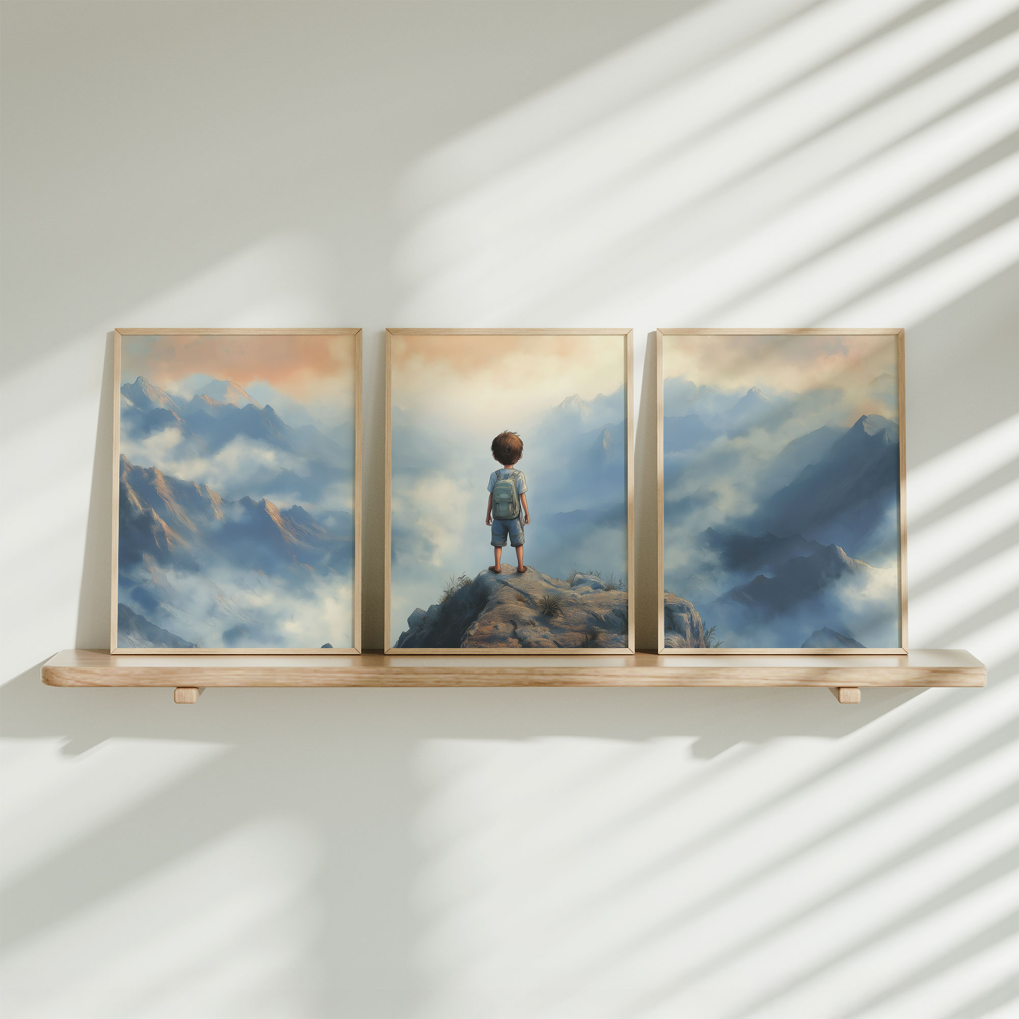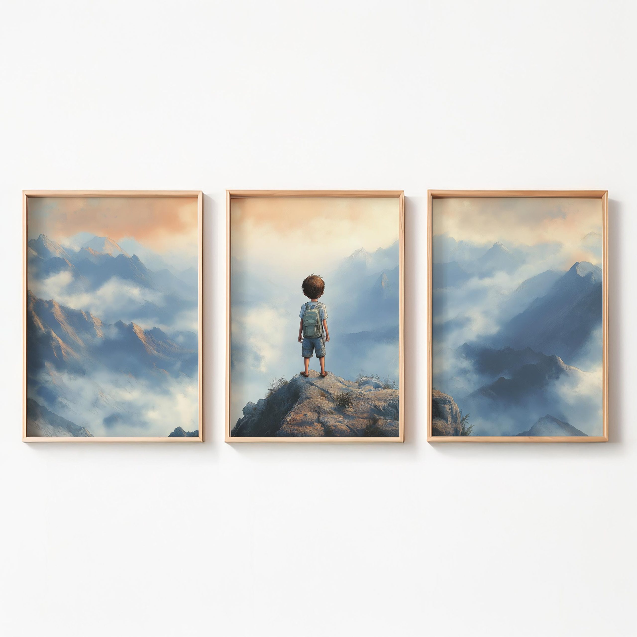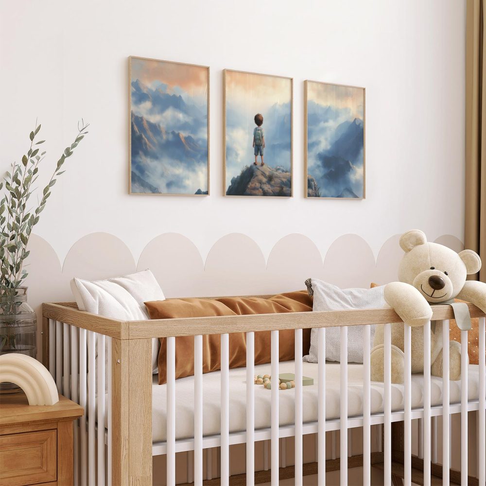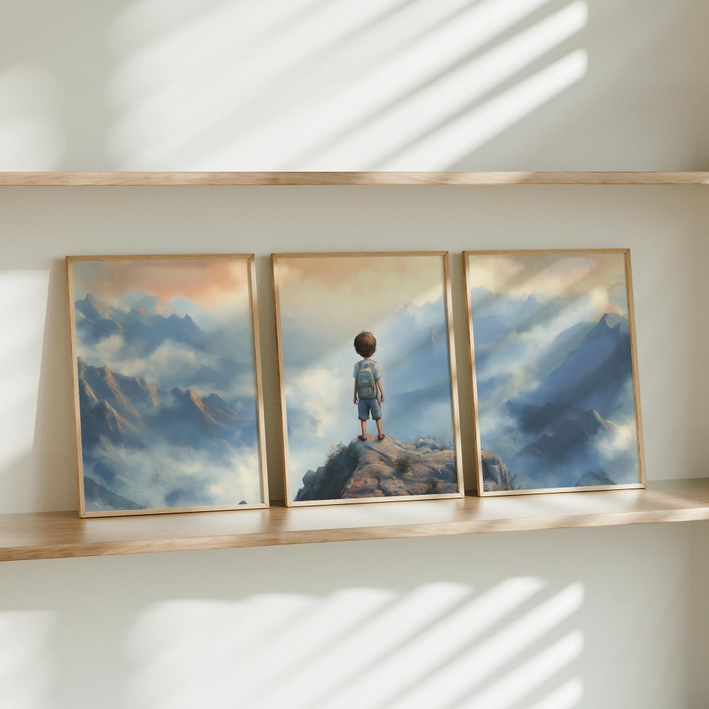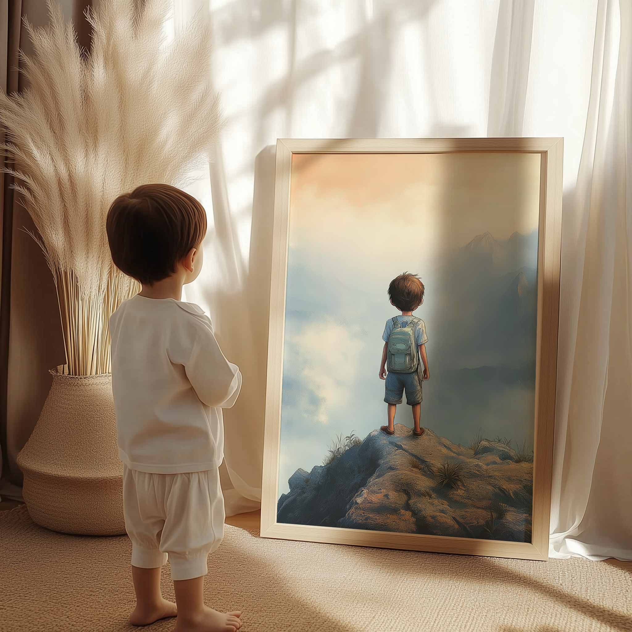 Terug naar collectie / Kinderkamer posters / Avontuurlijk posters / Dromerige jongen op rots met berguitzicht