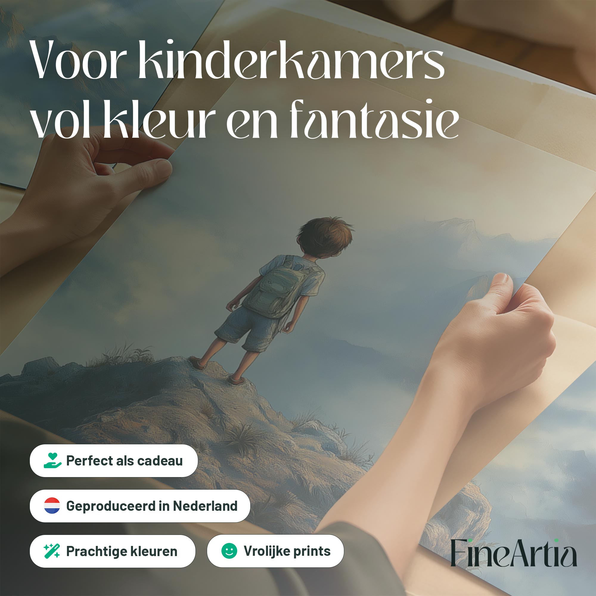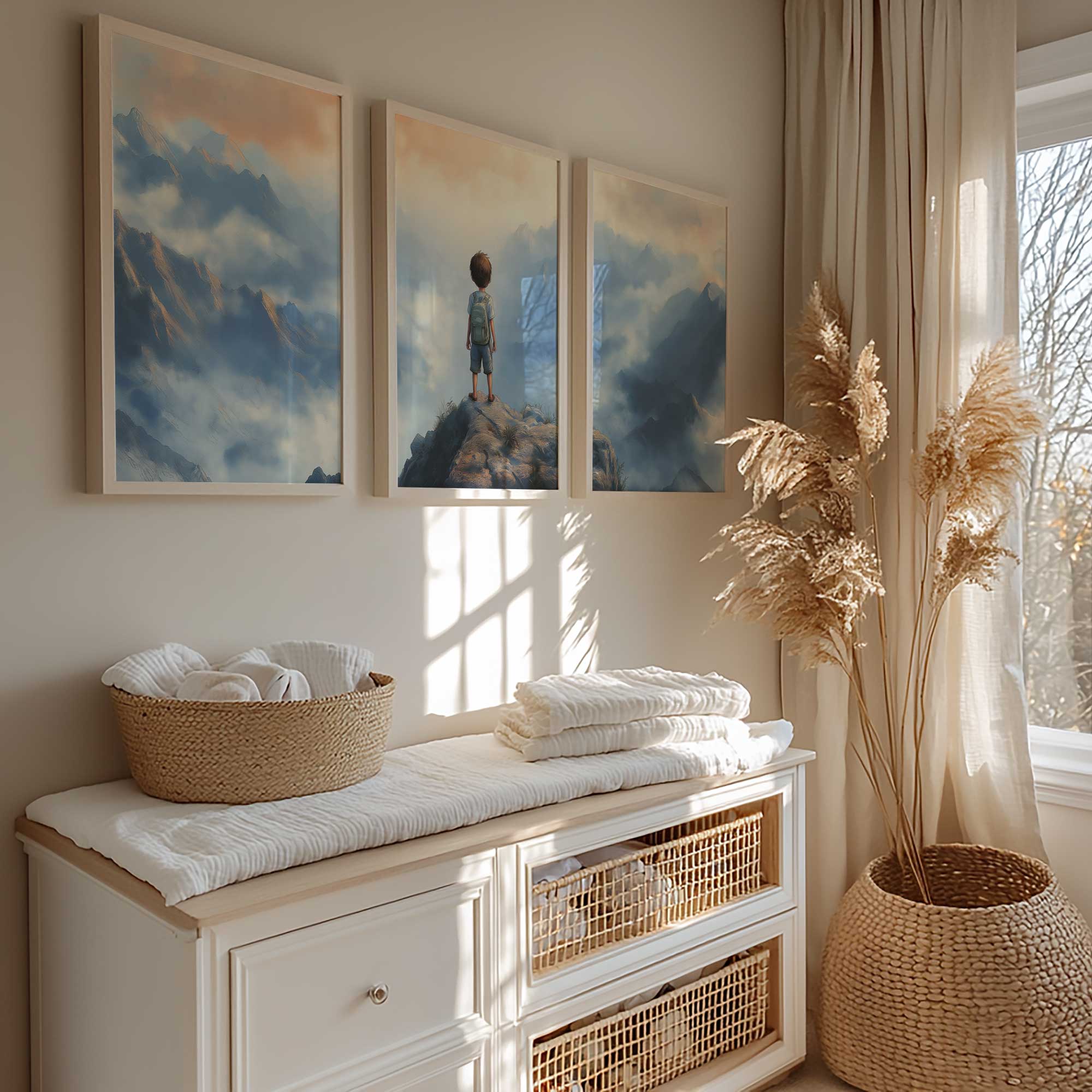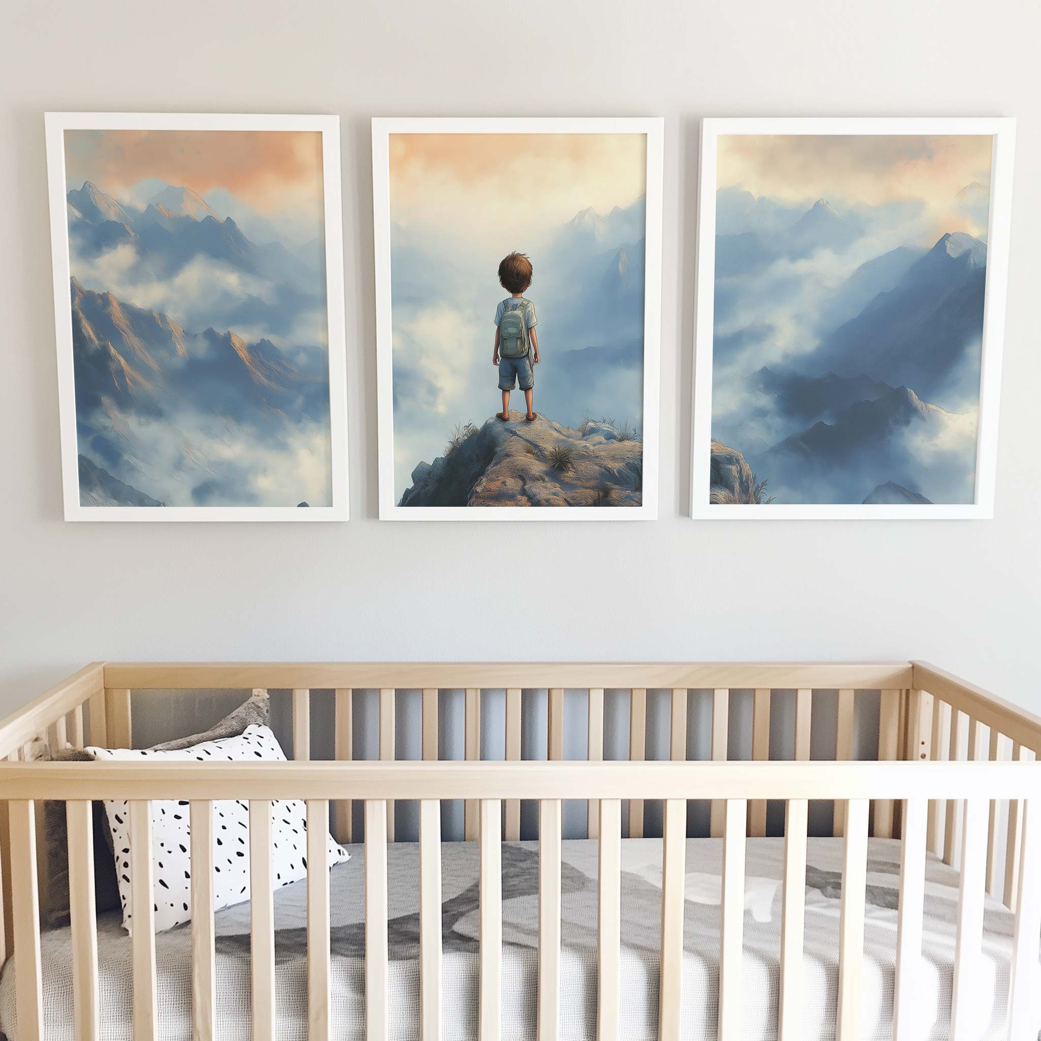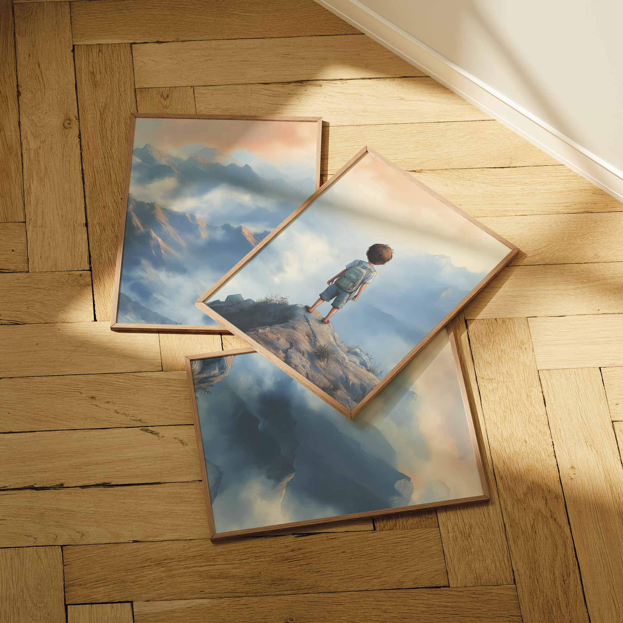 Terug naar collectie / Kinderkamer posters / Avontuurlijk posters / Dromerige jongen op rots met berguitzicht