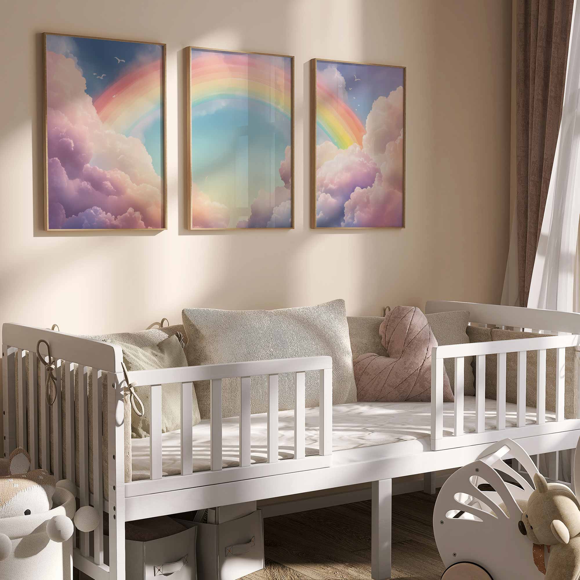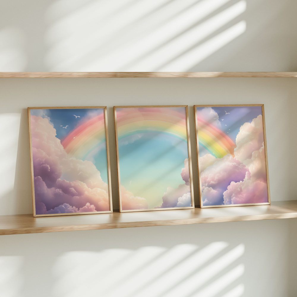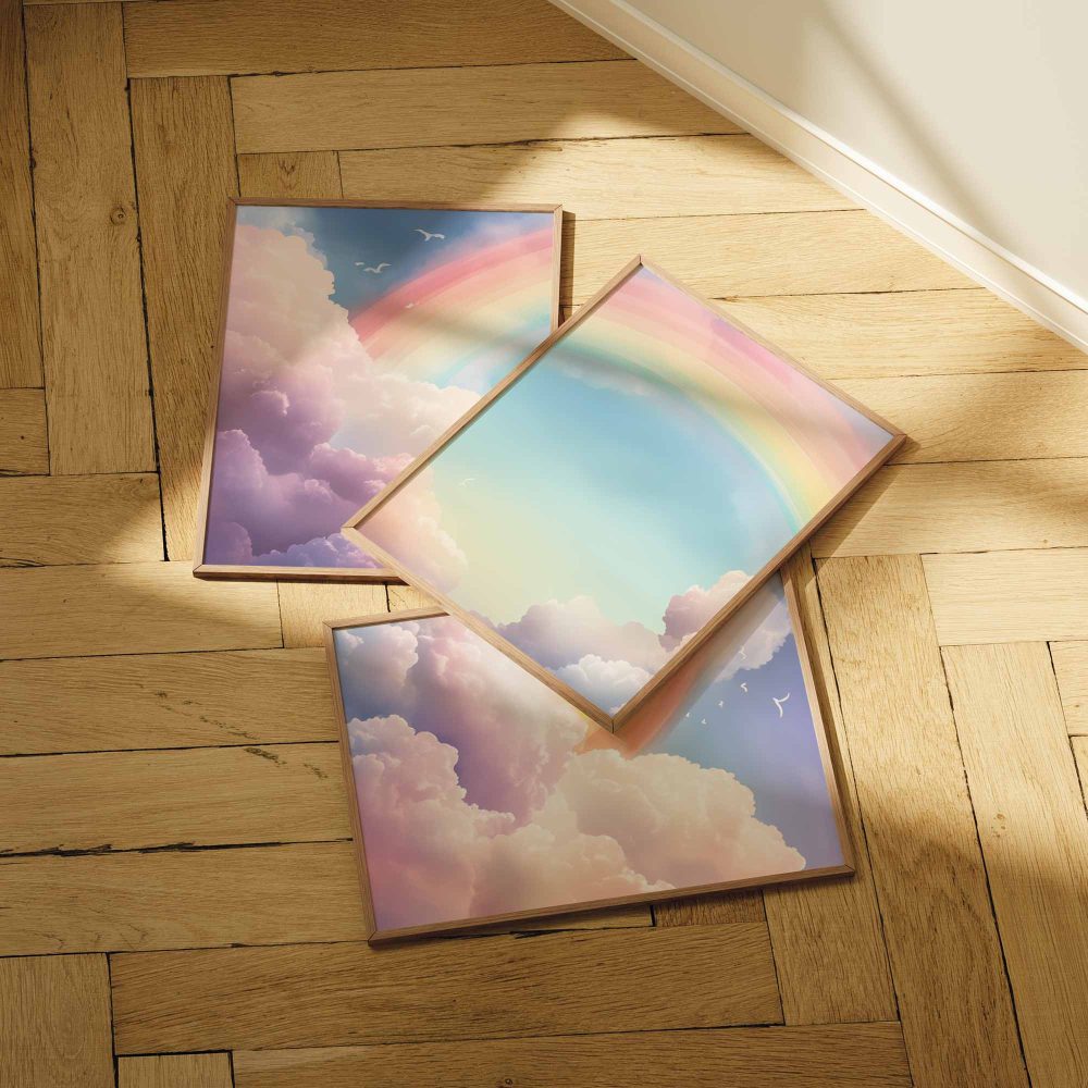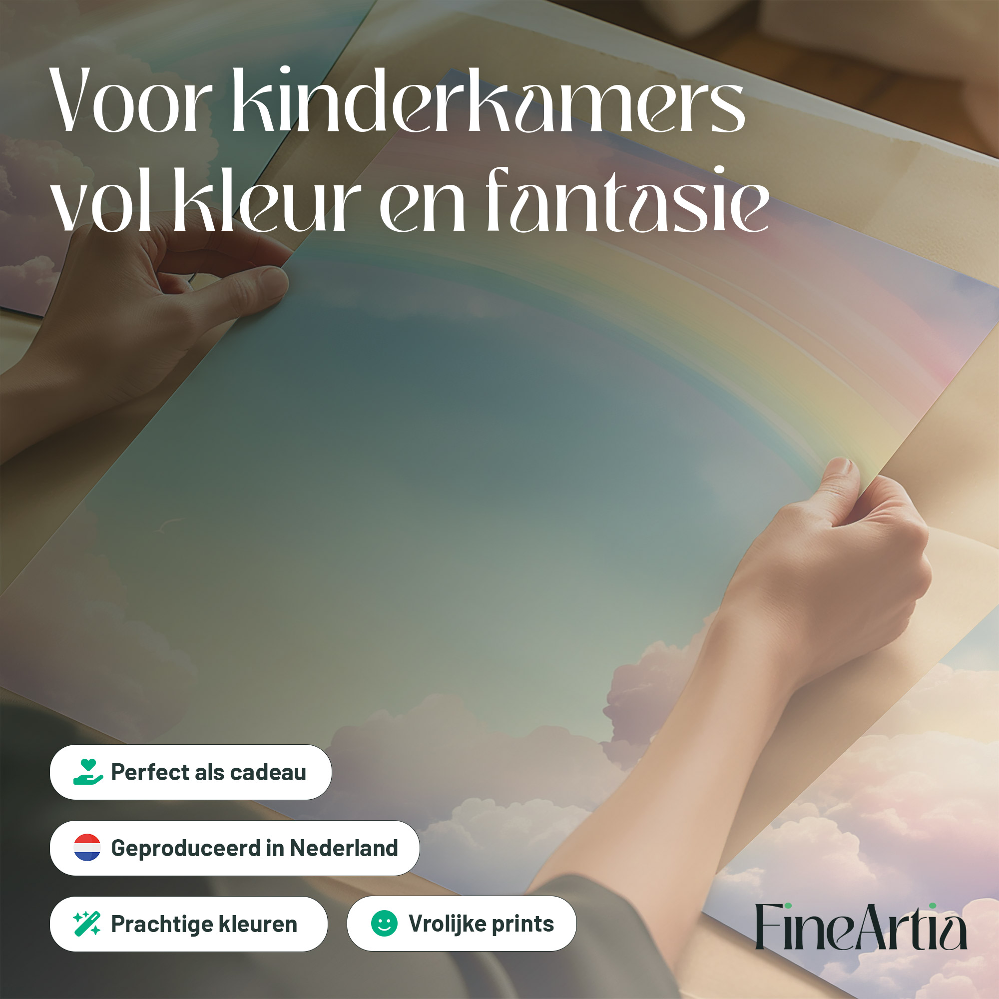 Terug naar collectie / Kinderkamer posters / Dromerige Regenboog met Fluffy Wolken en Vogels