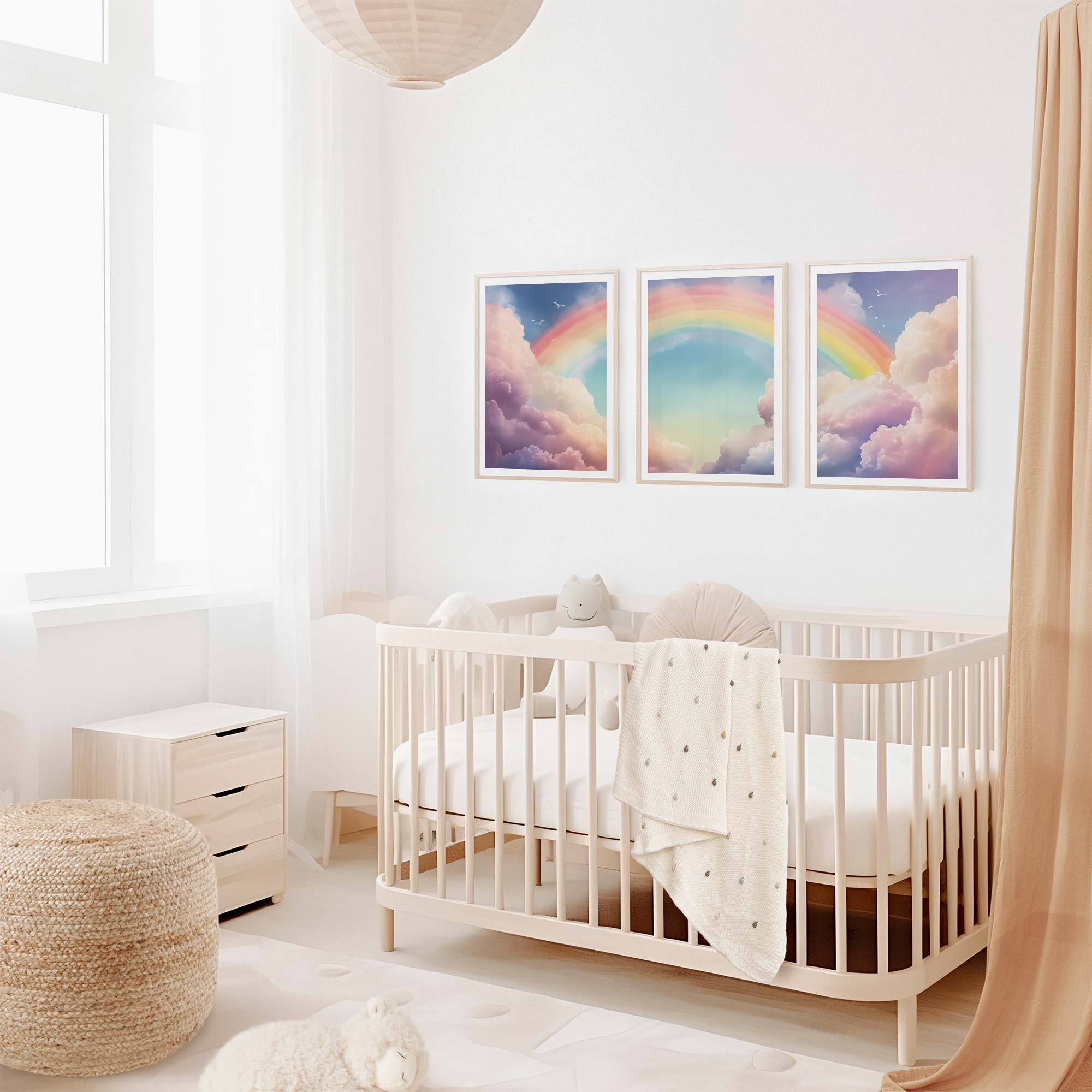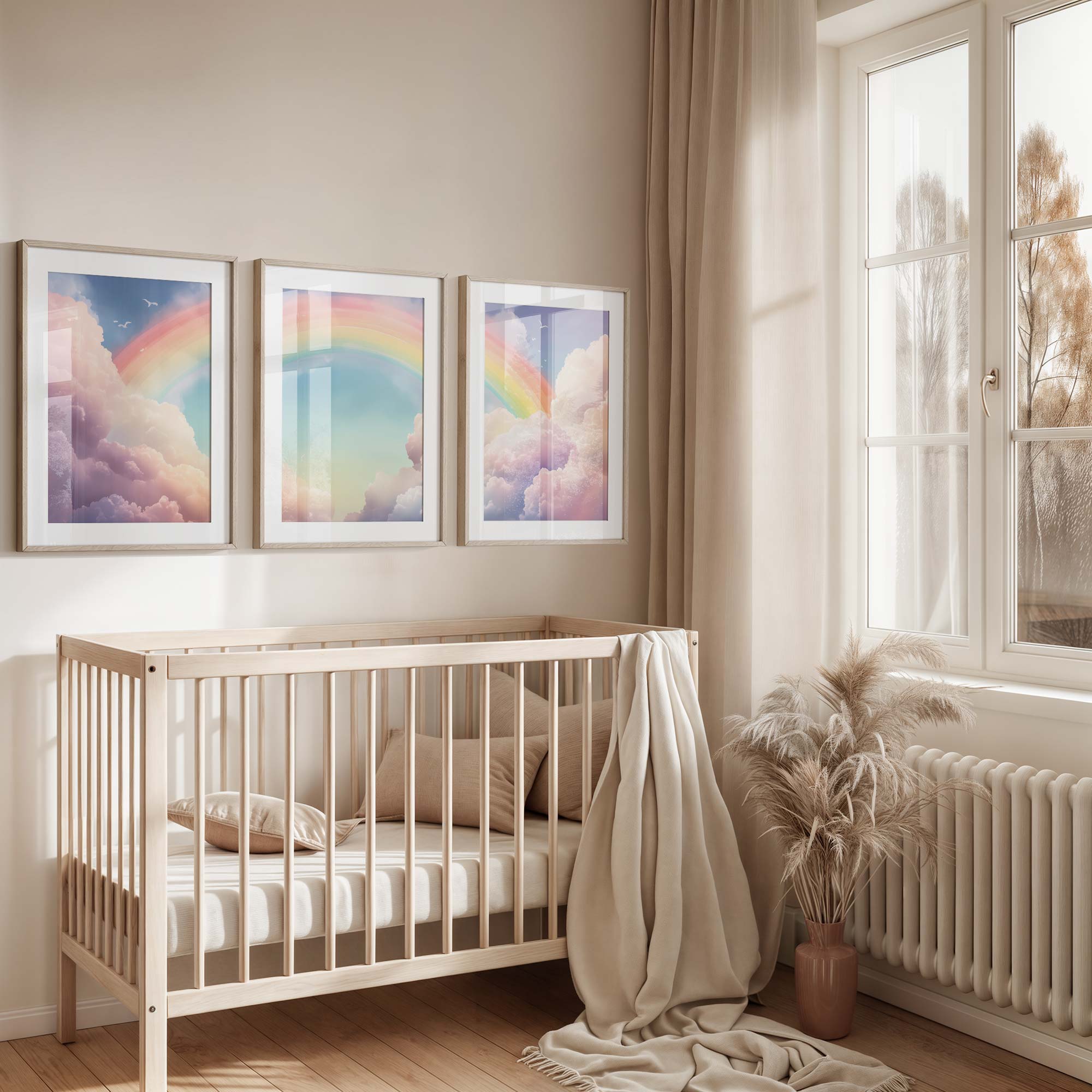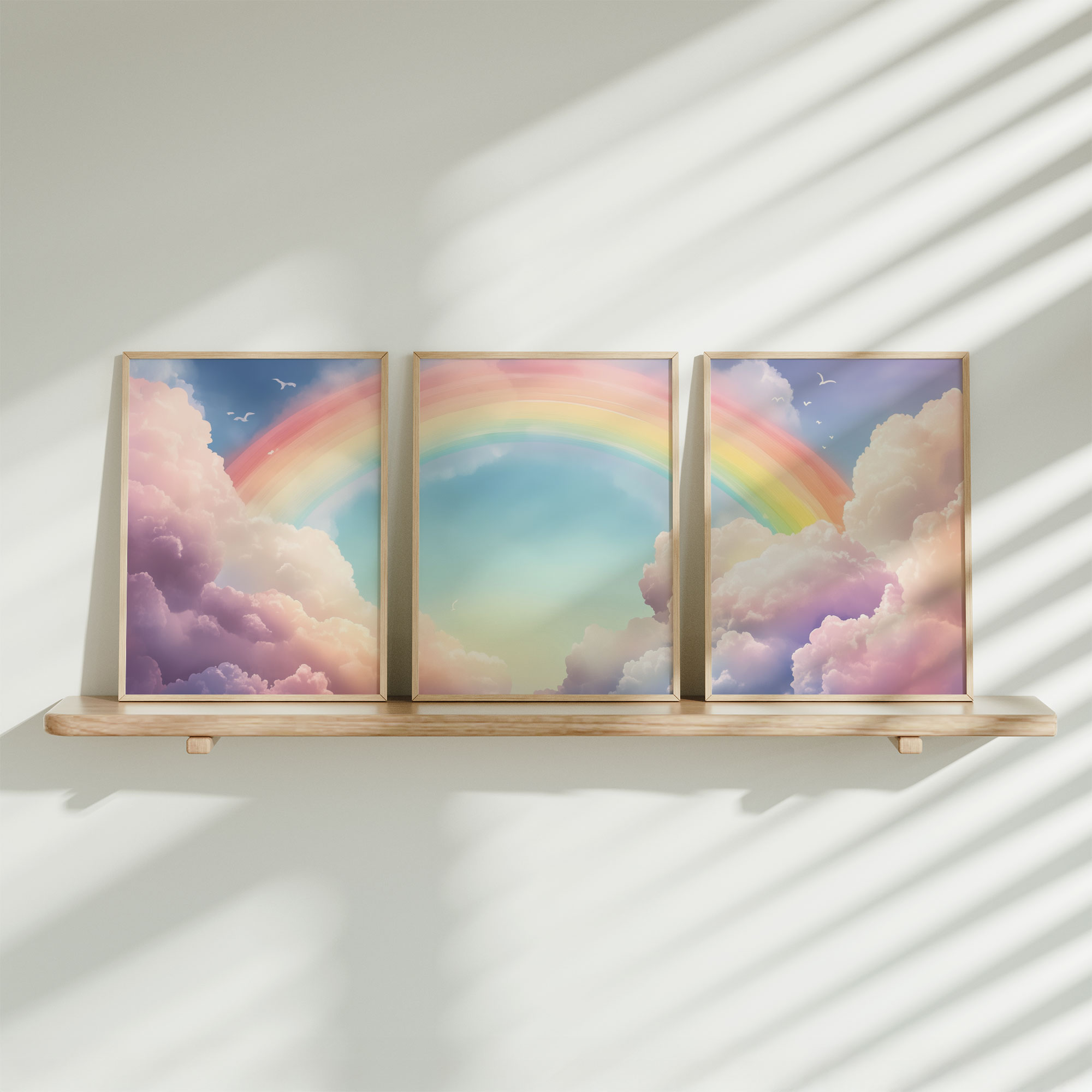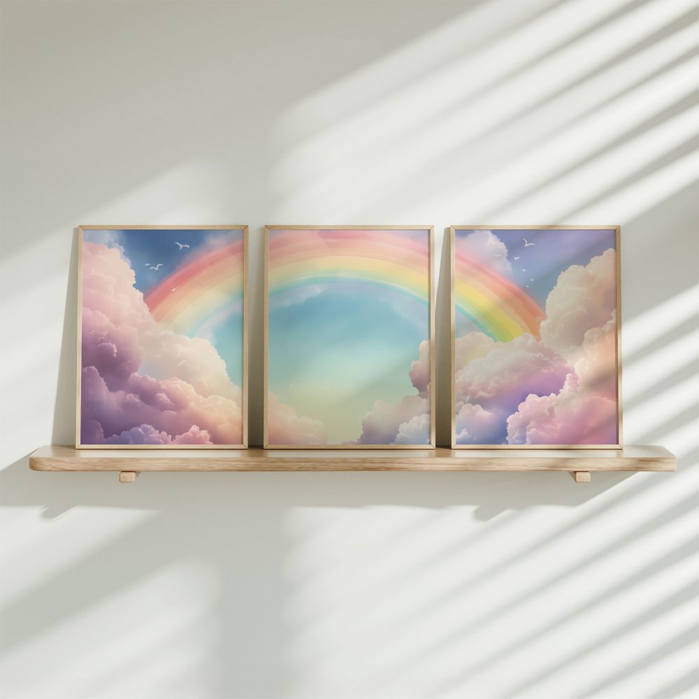 Terug naar collectie / Kinderkamer posters / Dromerige Regenboog met Fluffy Wolken en Vogels