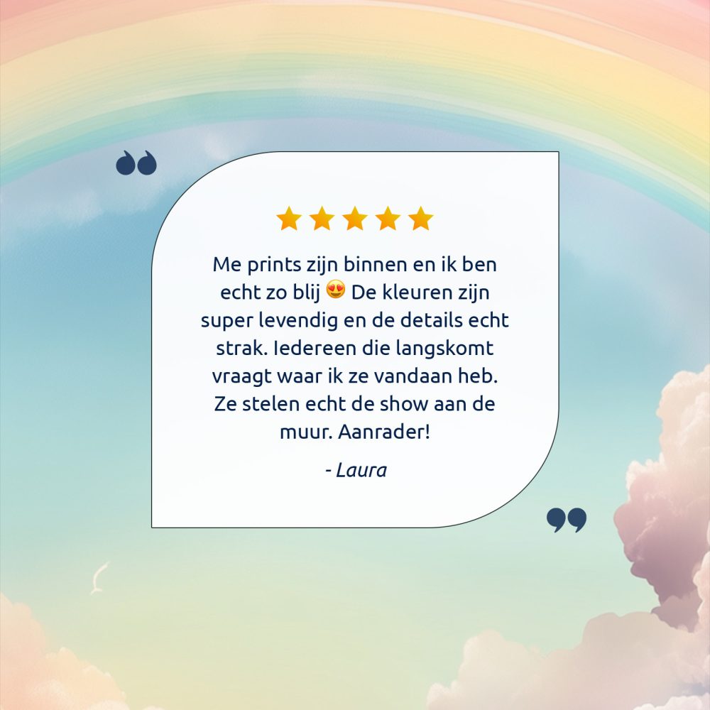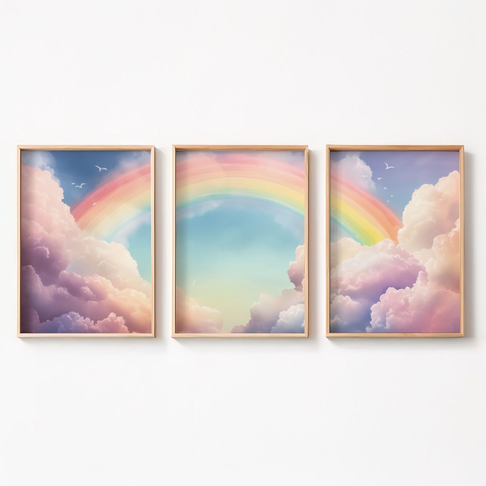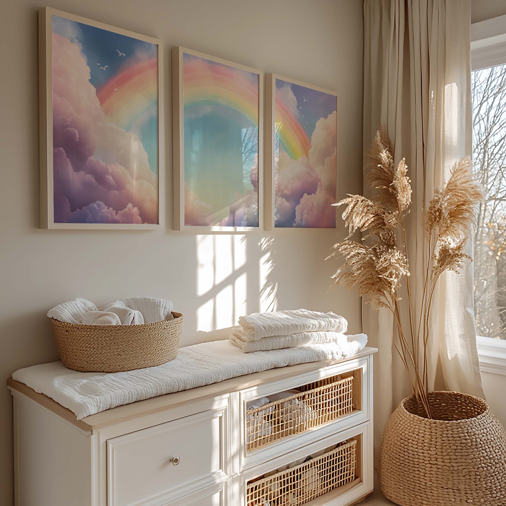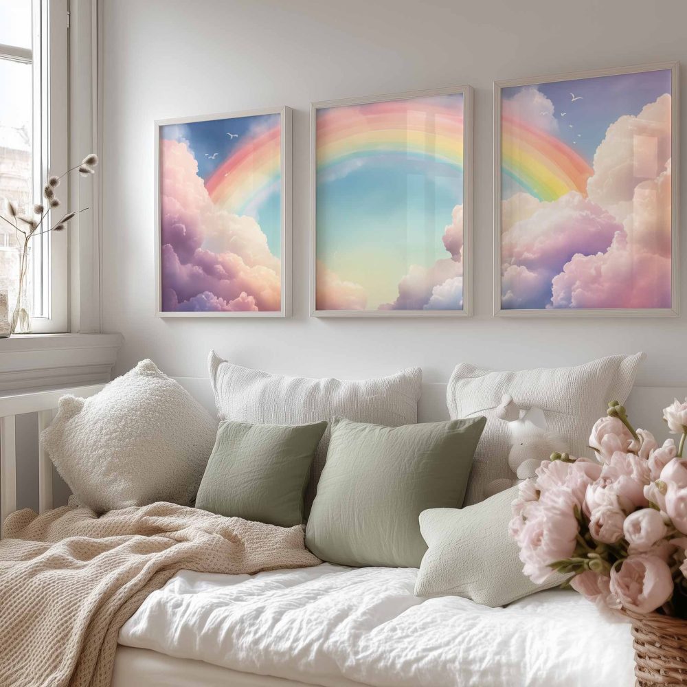 Terug naar collectie / Kinderkamer posters / Dromerige Regenboog met Fluffy Wolken en Vogels