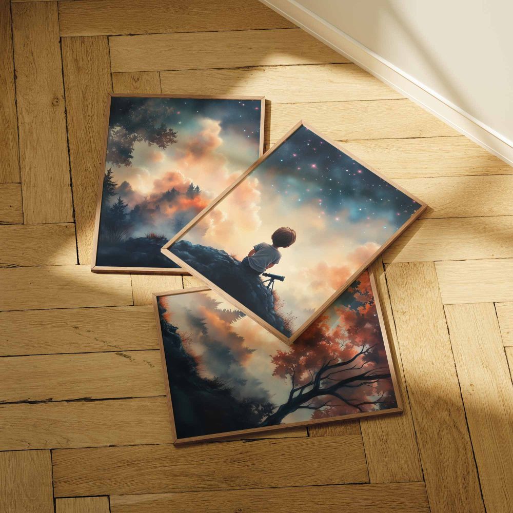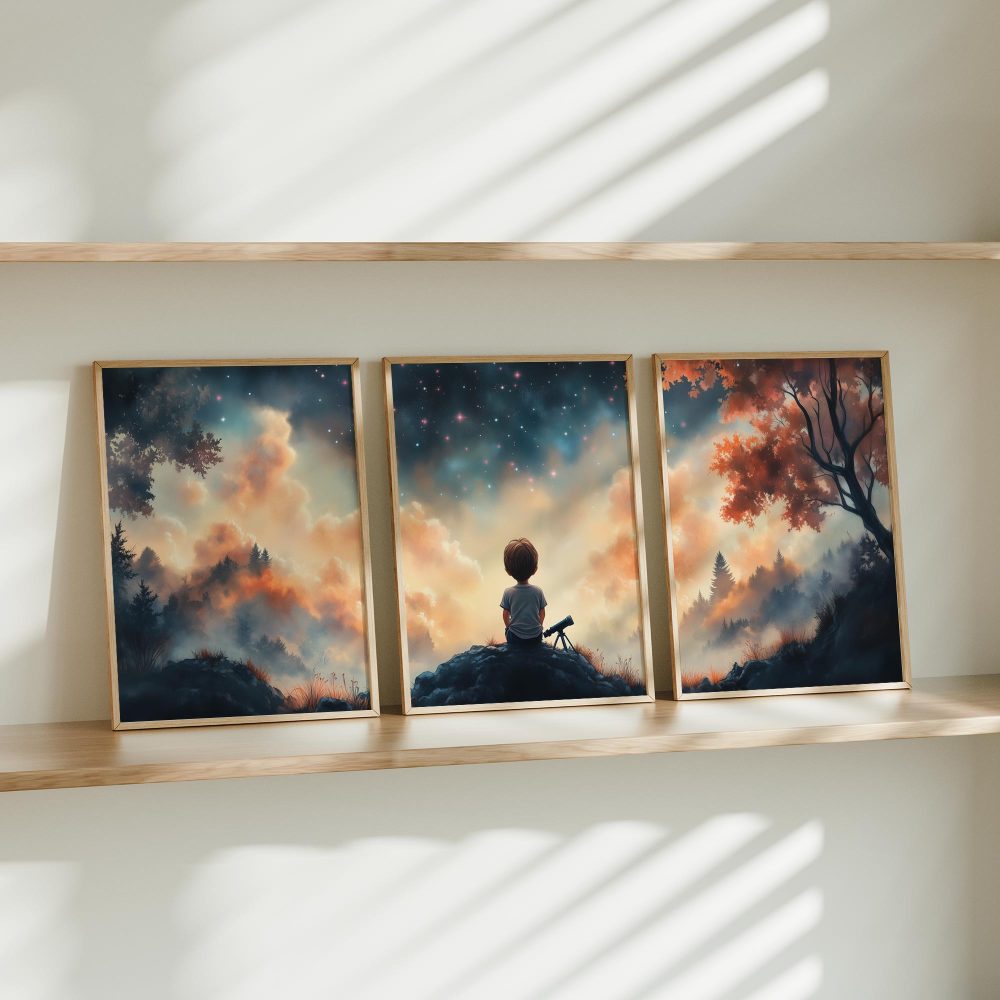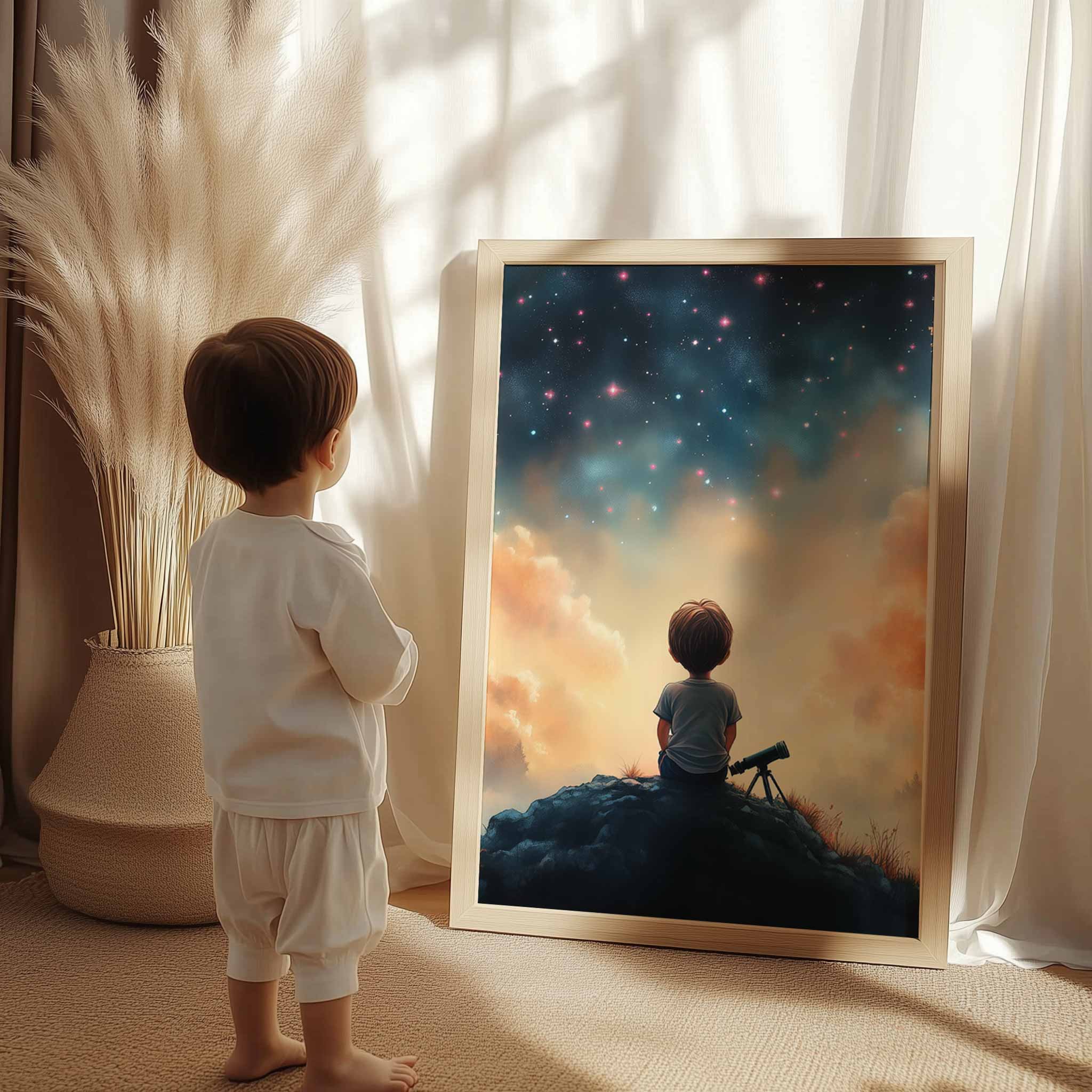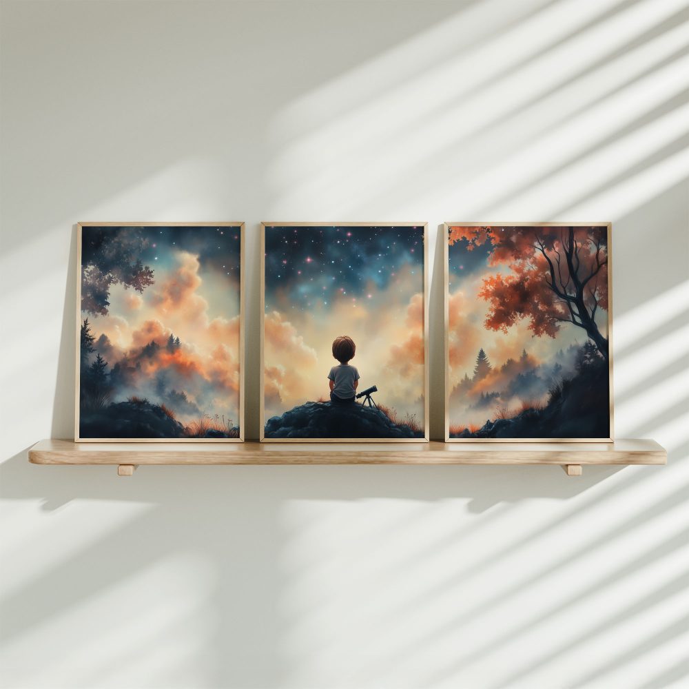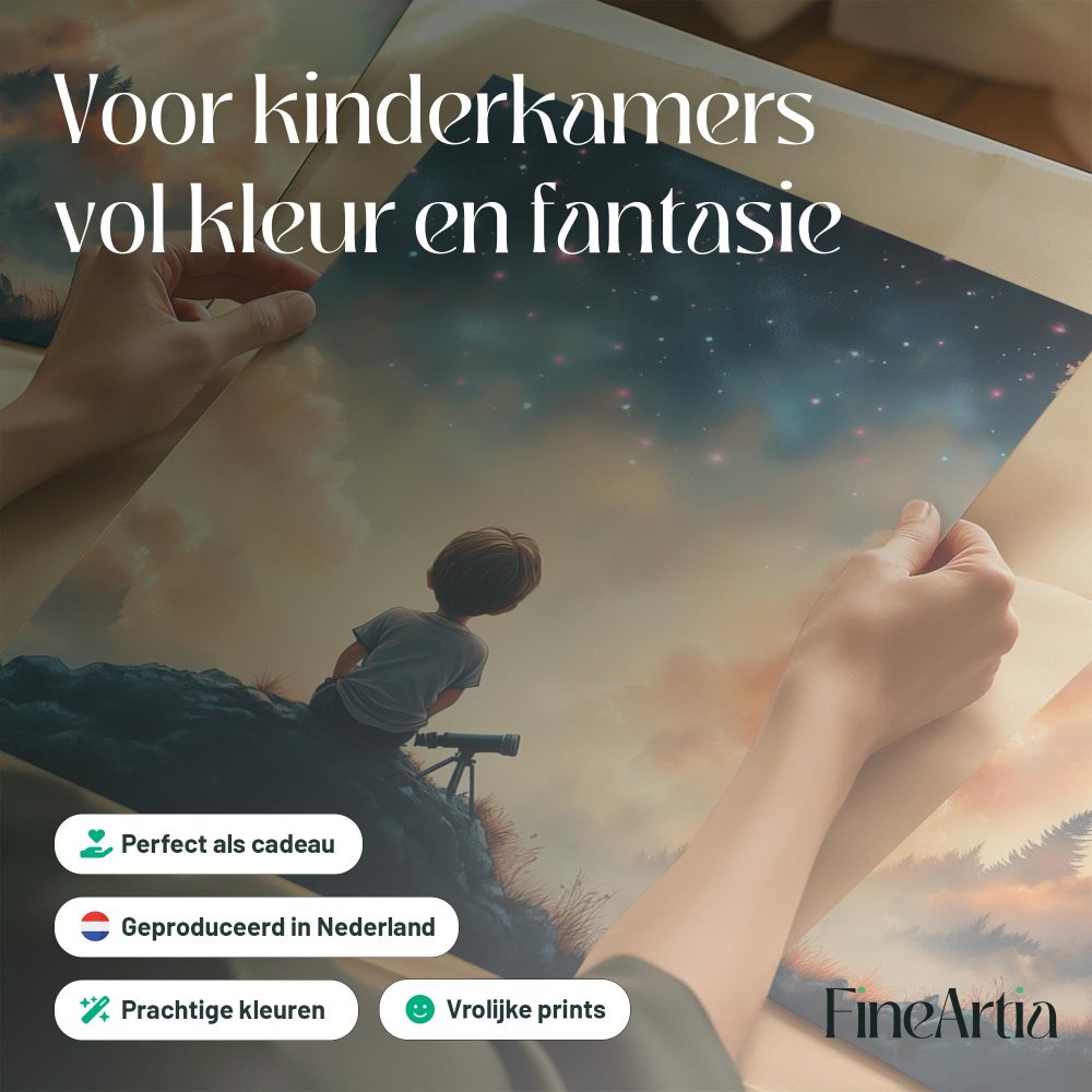 Terug naar collectie / Kinderkamer posters / Avontuurlijk posters / Dromerige Sterrenkijker – Nachtelijke Avonturen aan de Hemel