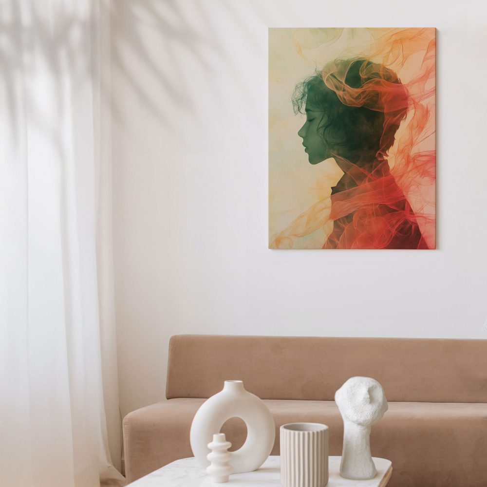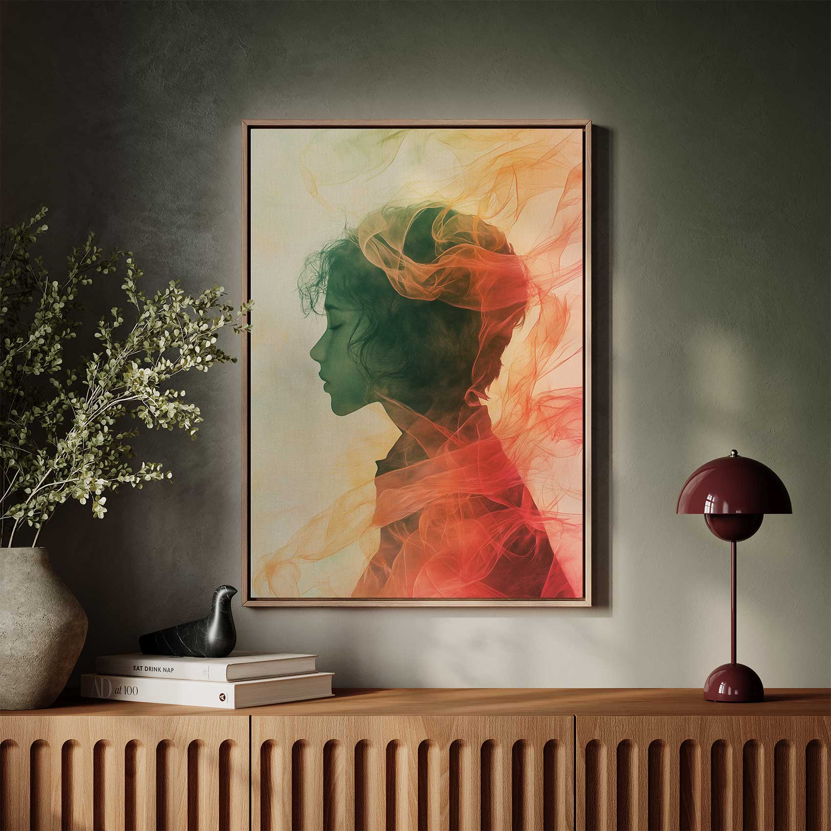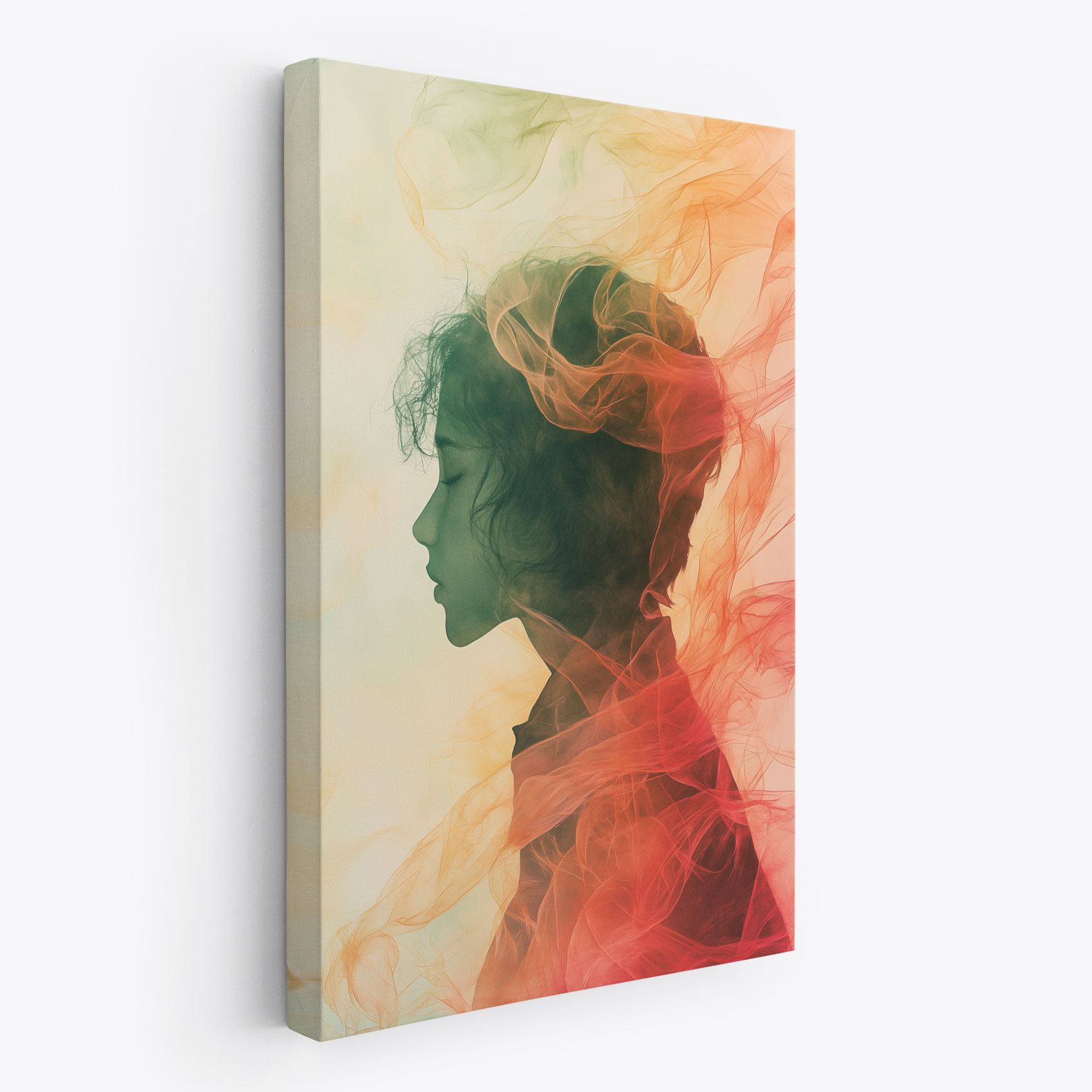 Terug naar collectie / Schilderijen / Abstract Schilderij / Dromerige vrouw met kleurige rook