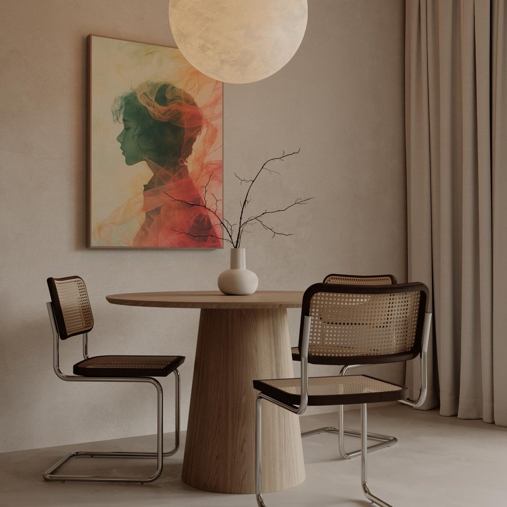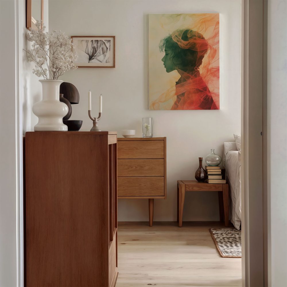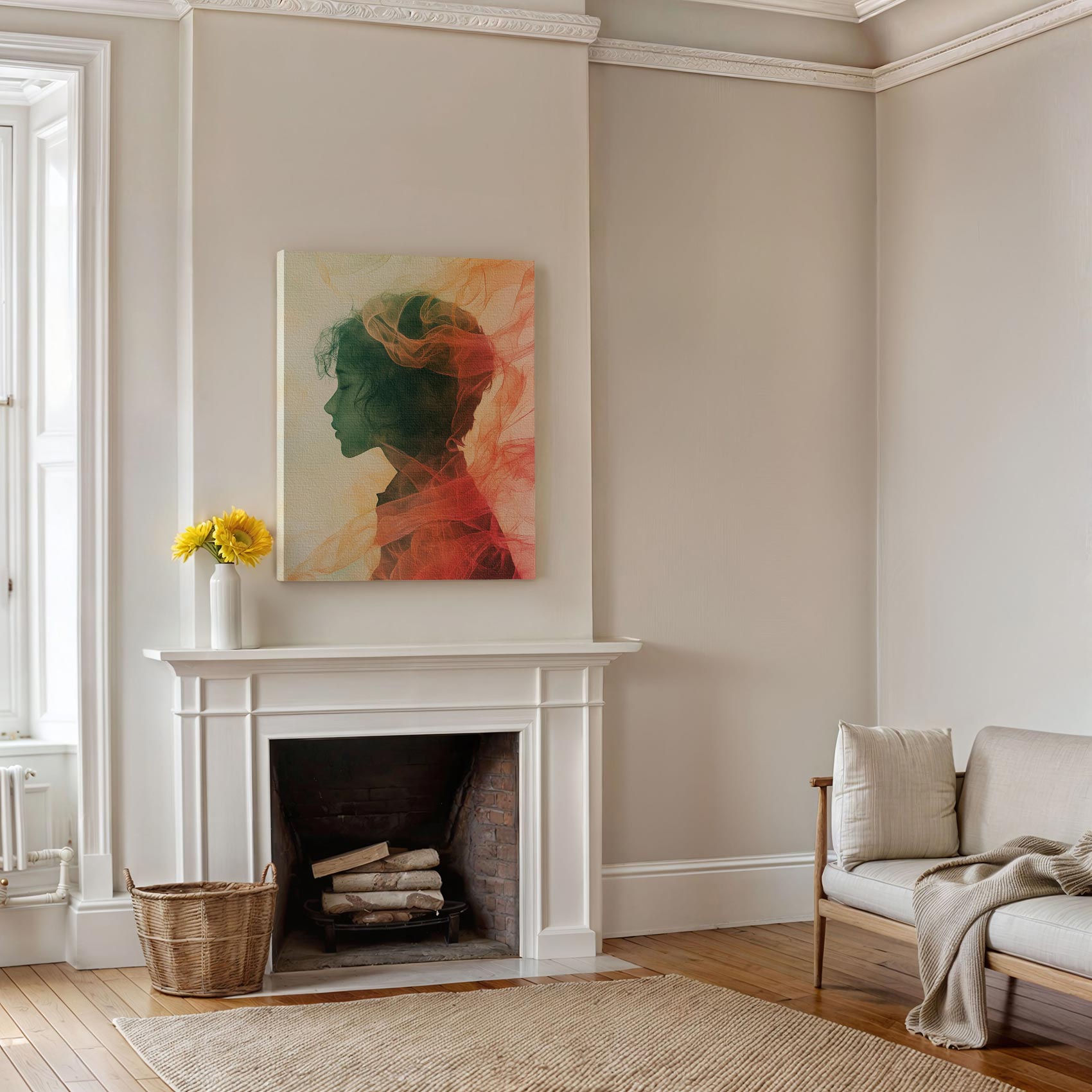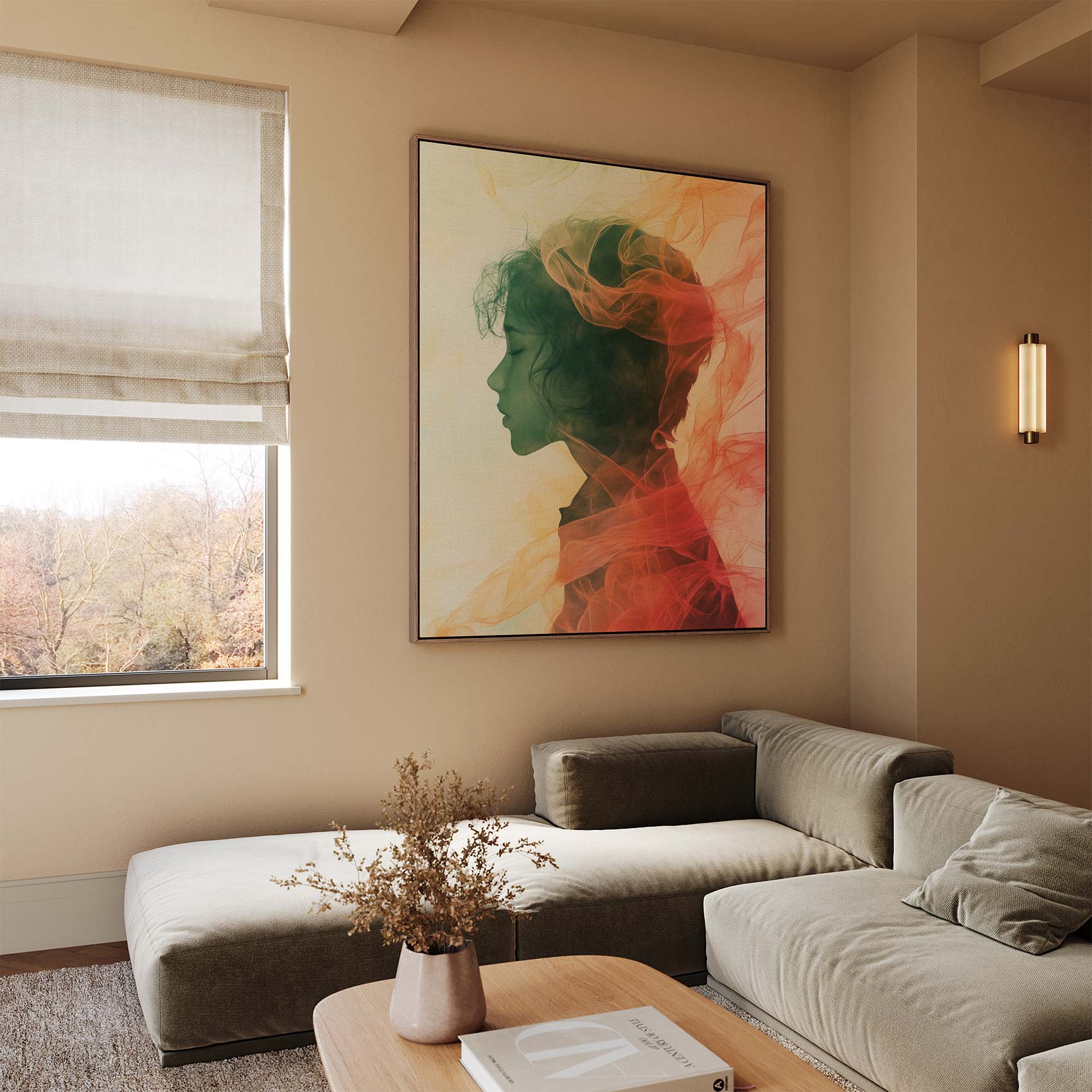 Terug naar collectie / Schilderijen / Abstract Schilderij / Dromerige vrouw met kleurige rook