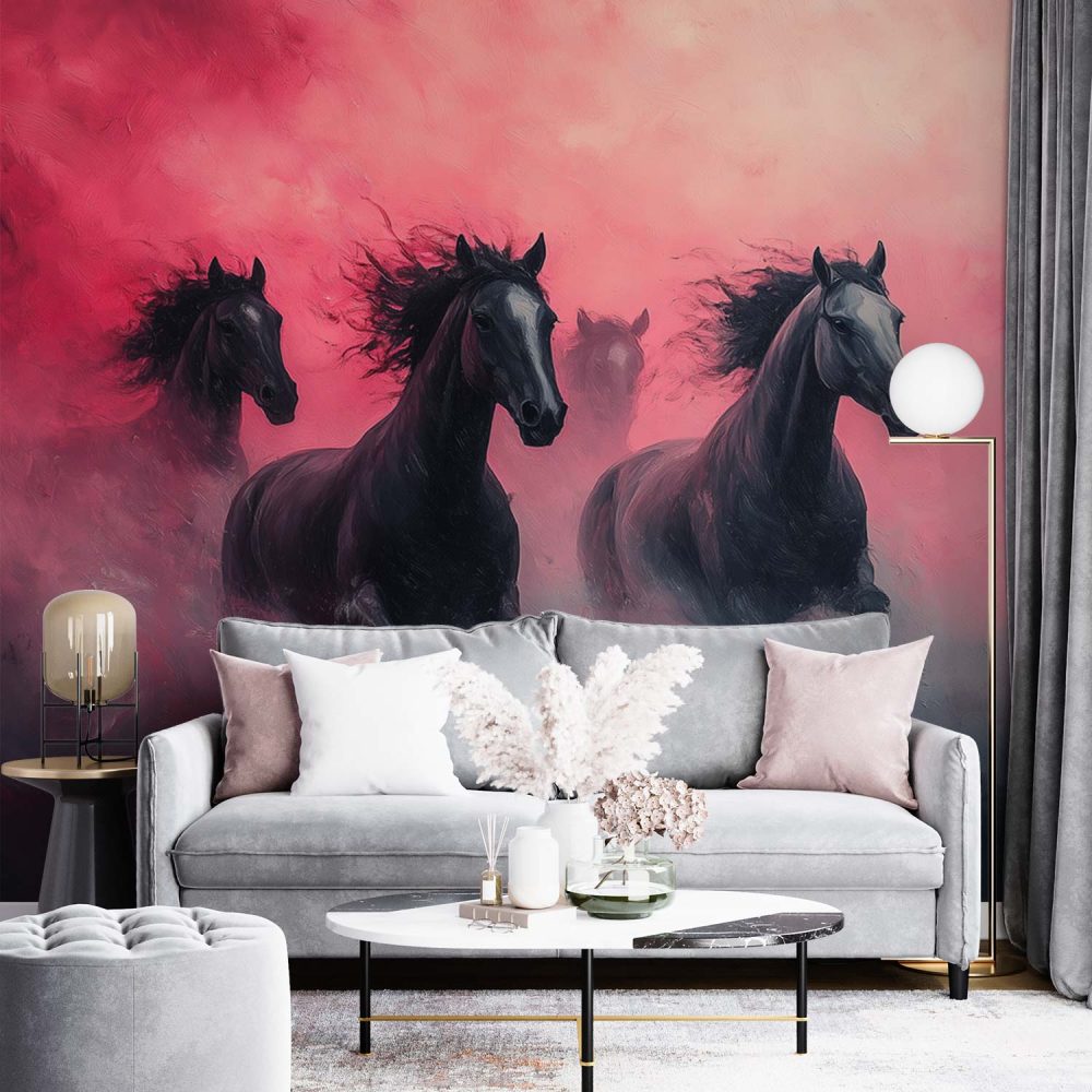 Terug naar collectie / Behang / Abstract behang / Dynamische galopperende zwarte paarden behang