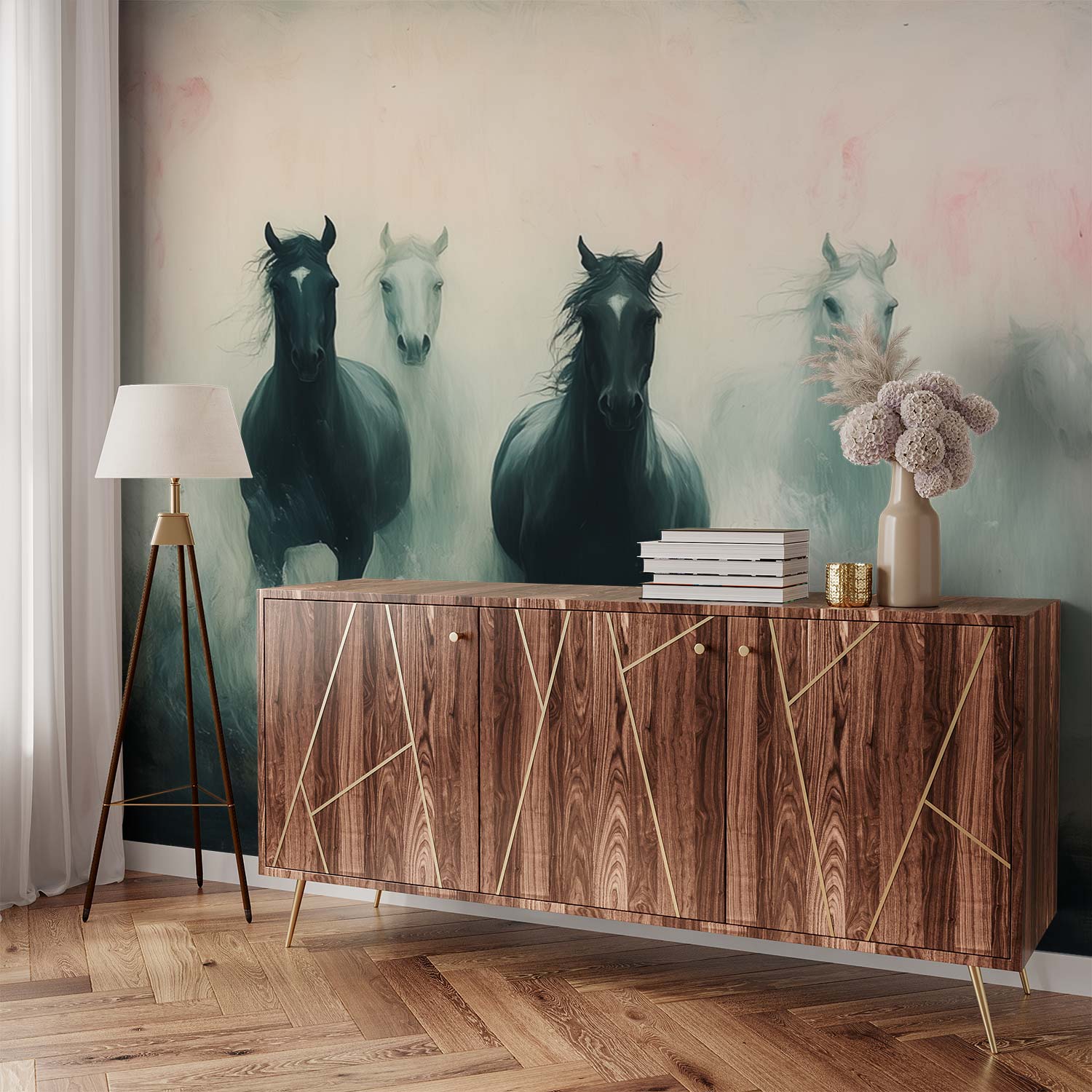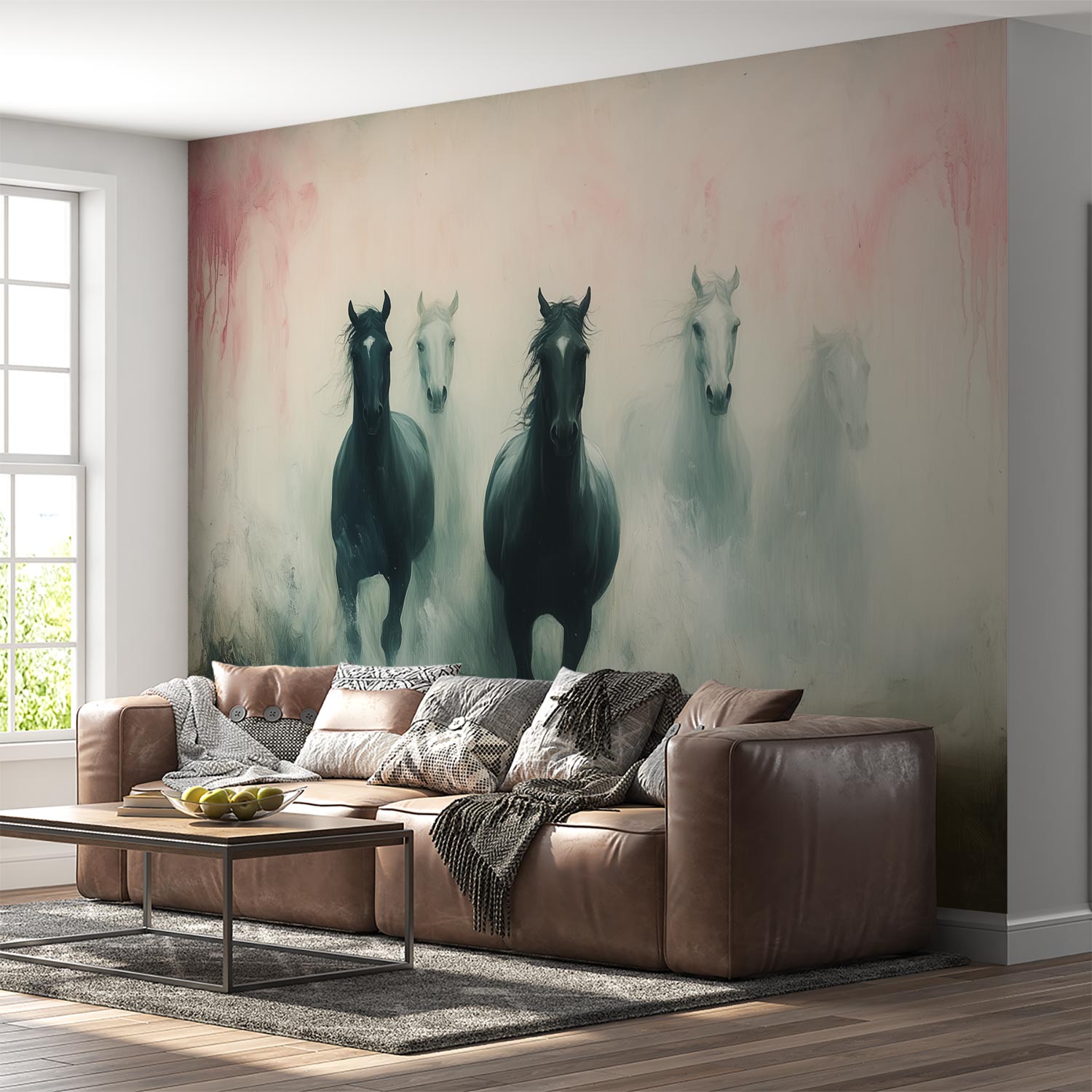 Terug naar collectie / Behang / Dynamische Roze Galopperende Paarden behang