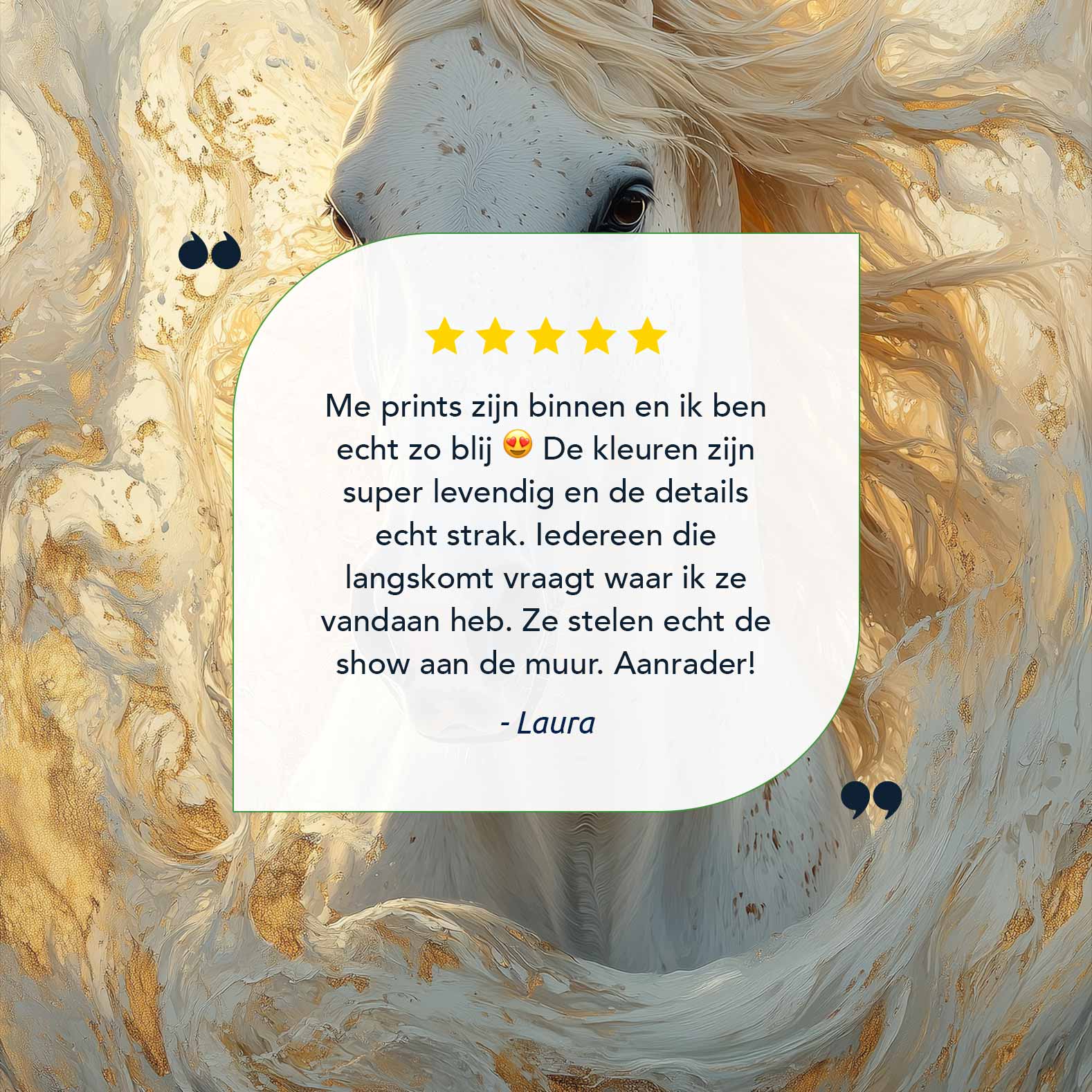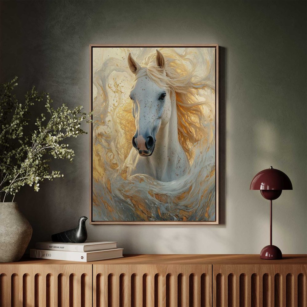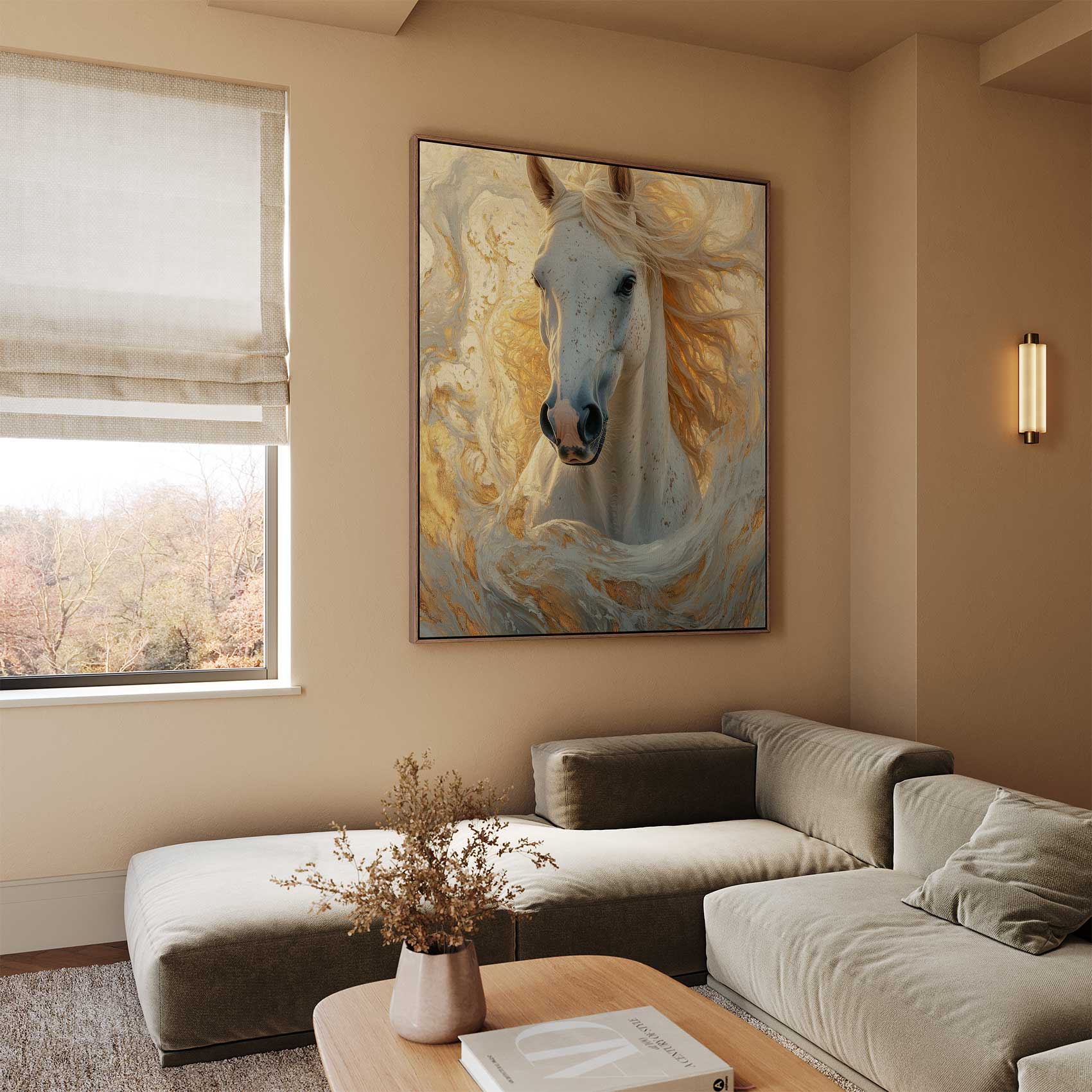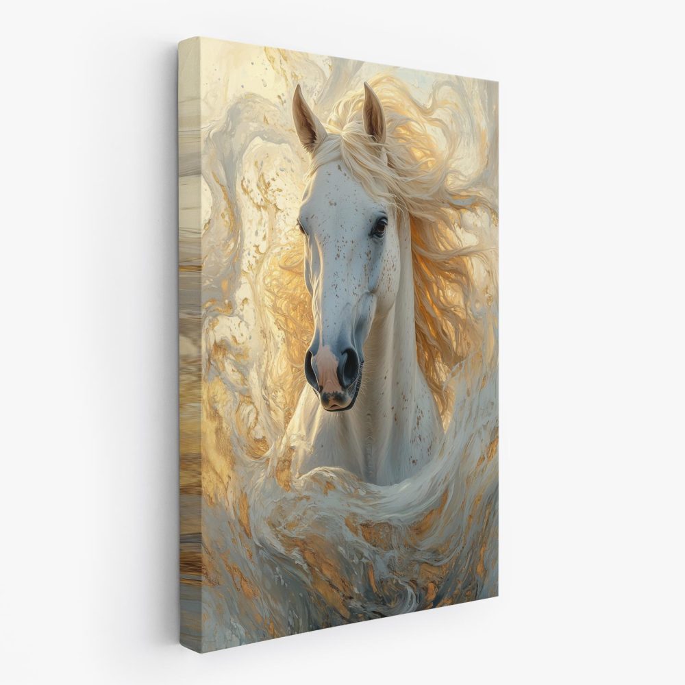 Terug naar collectie / Schilderijen / Abstract Schilderij / Elegant wit paard in goud