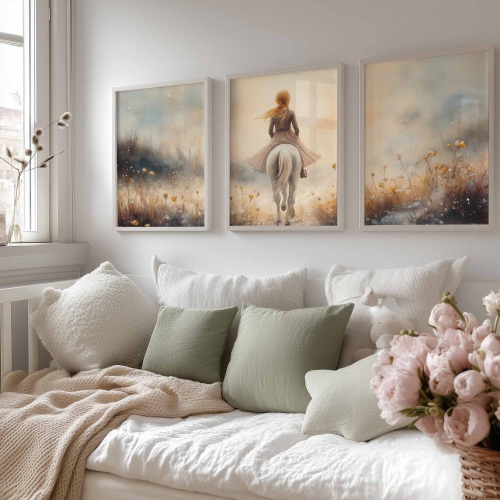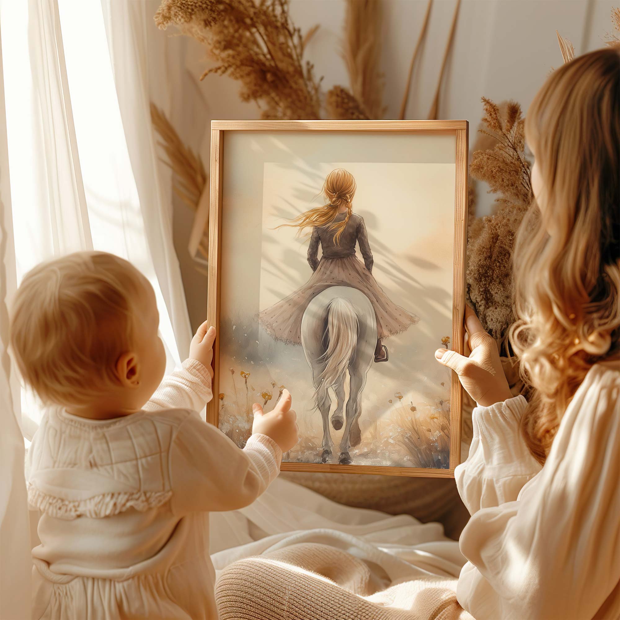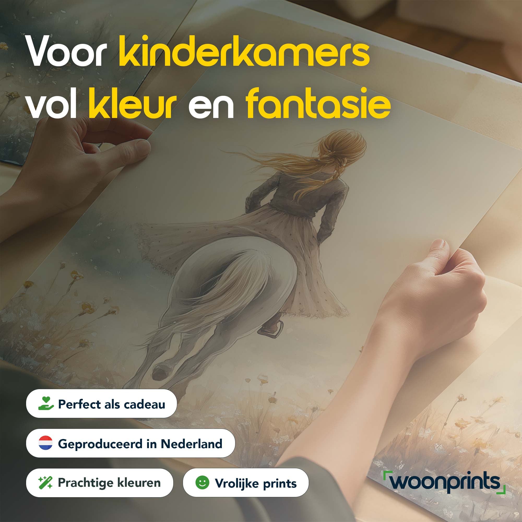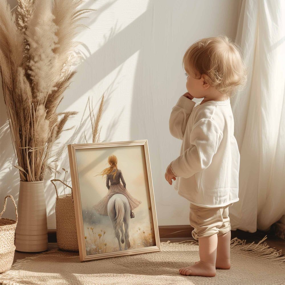 Terug naar collectie / Kinderkamer posters / Bloemen posters / Elegante Dame op Wit Paard in Bloemenveld
