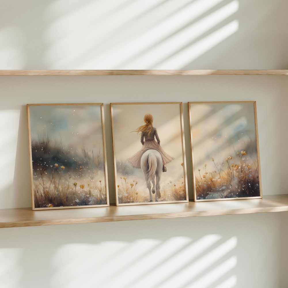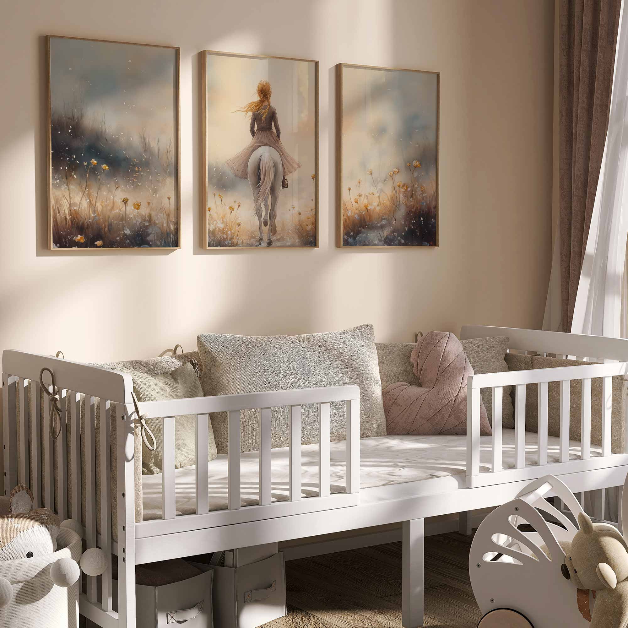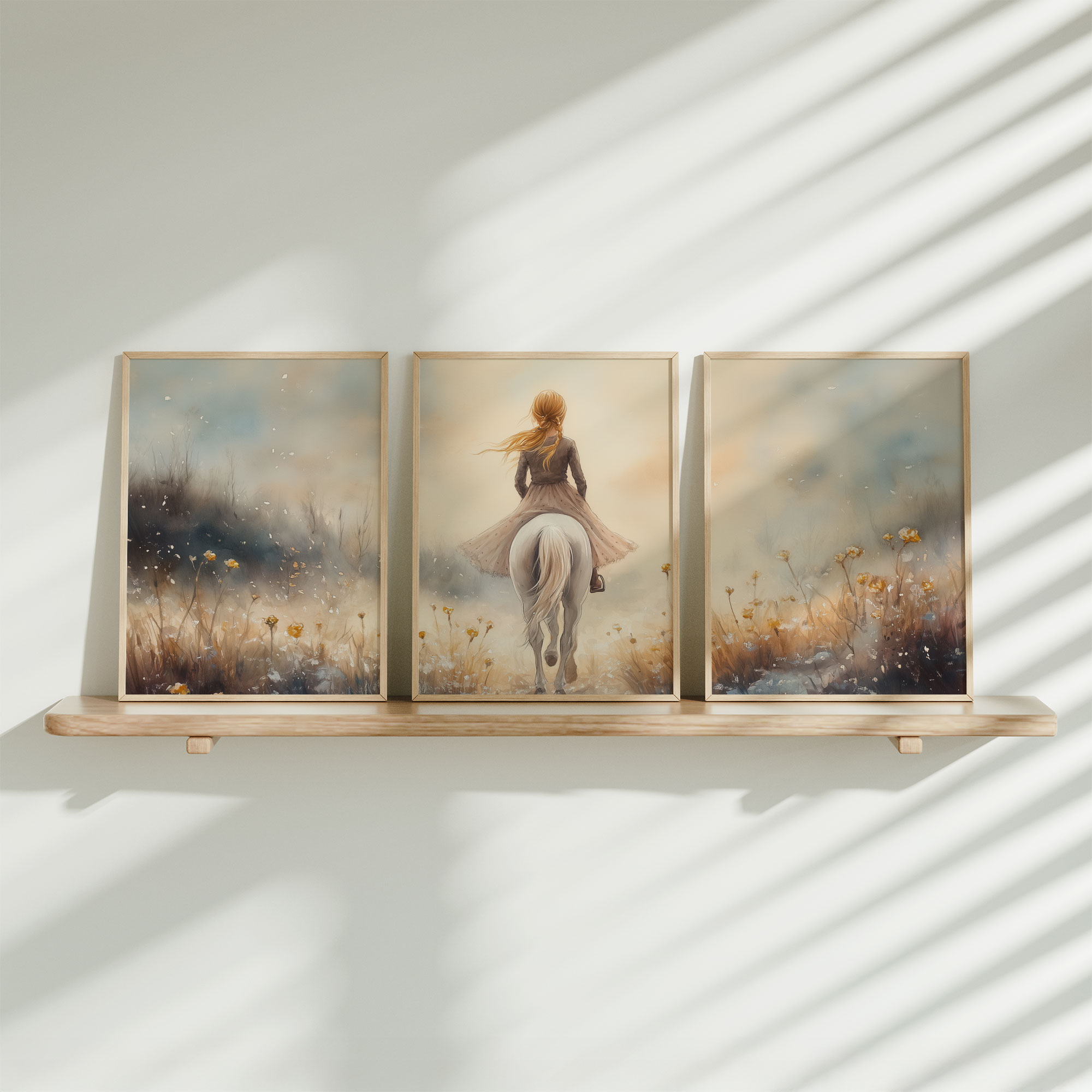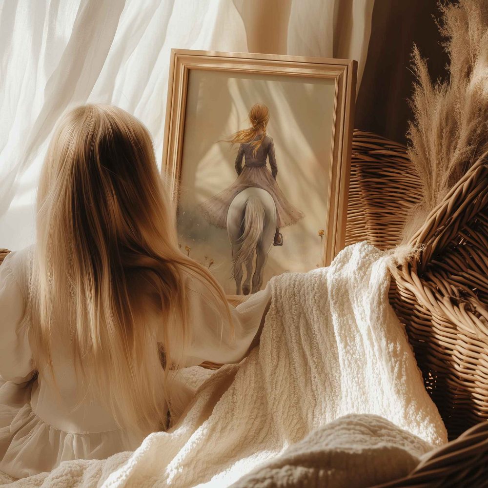 Terug naar collectie / Kinderkamer posters / Bloemen posters / Elegante Dame op Wit Paard in Bloemenveld