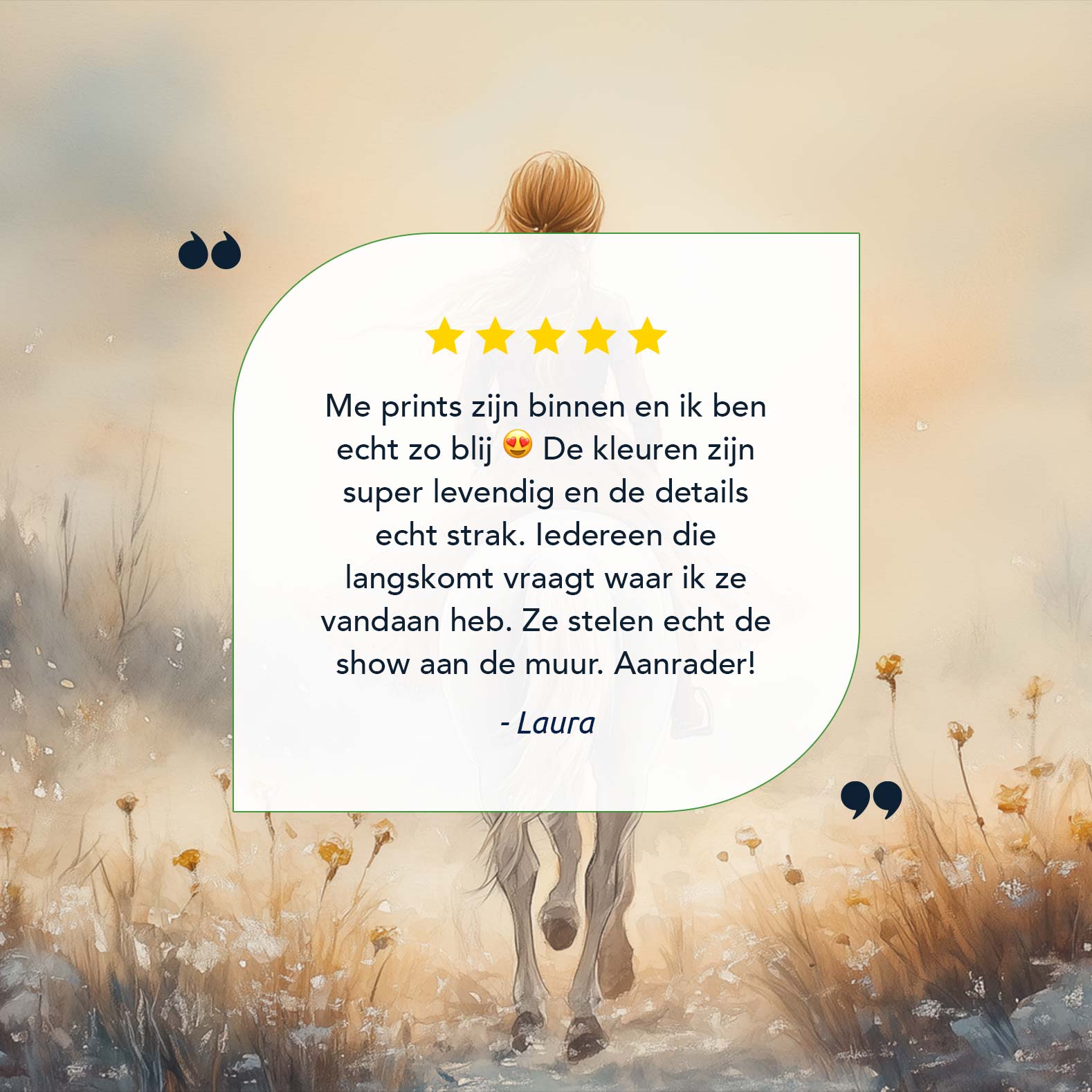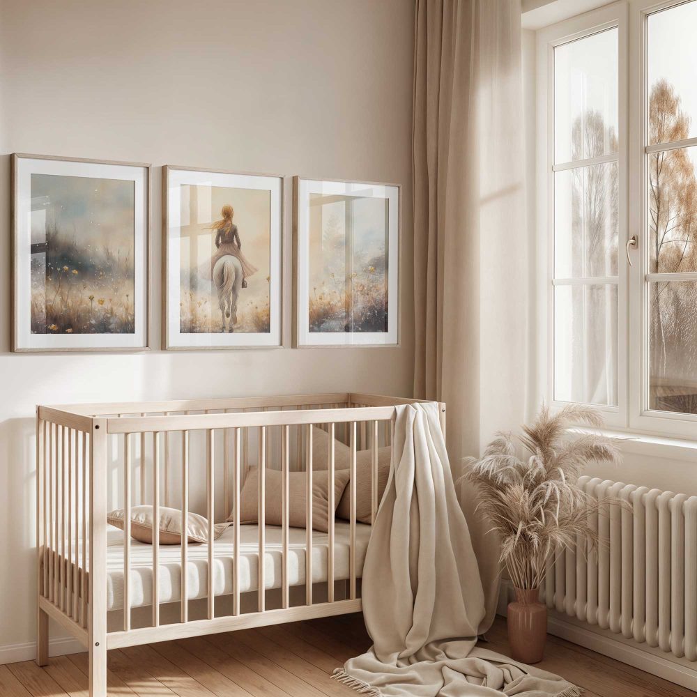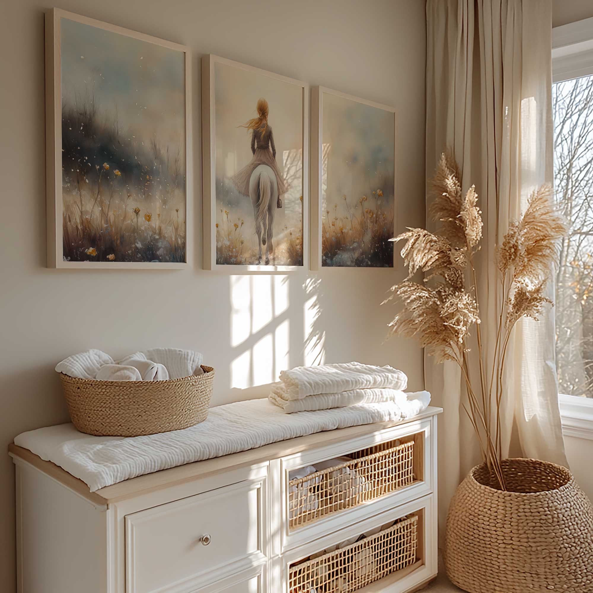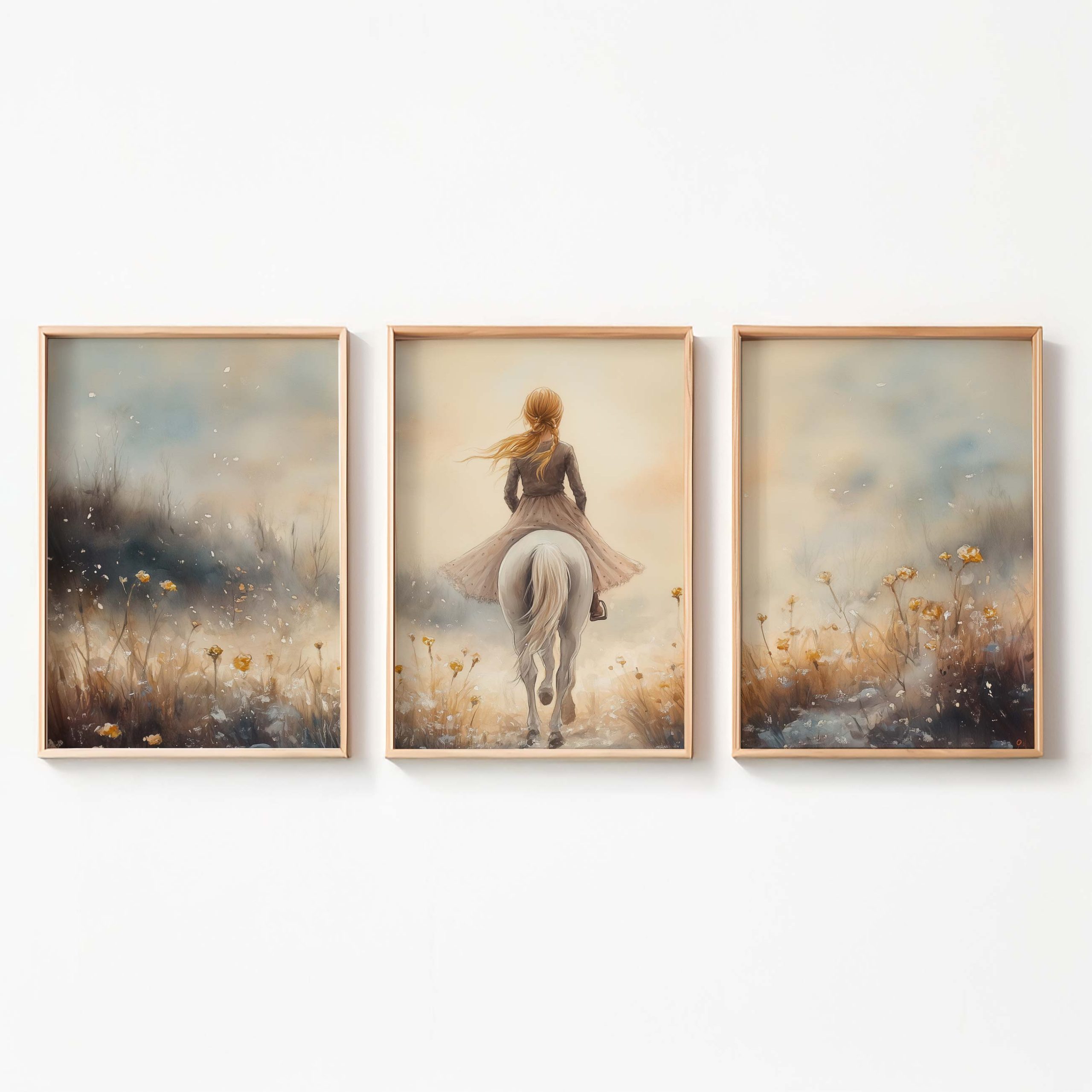 Terug naar collectie / Kinderkamer posters / Bloemen posters / Elegante Dame op Wit Paard in Bloemenveld
