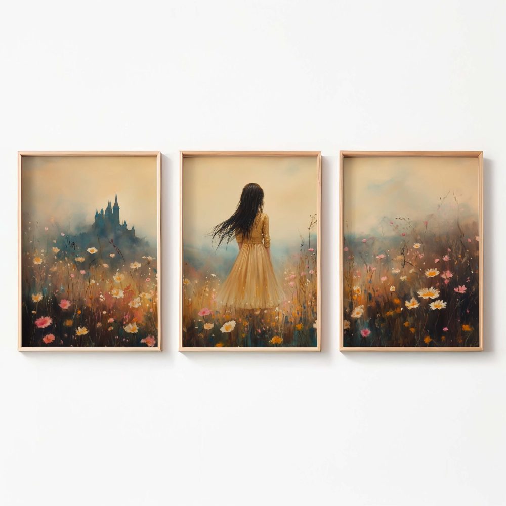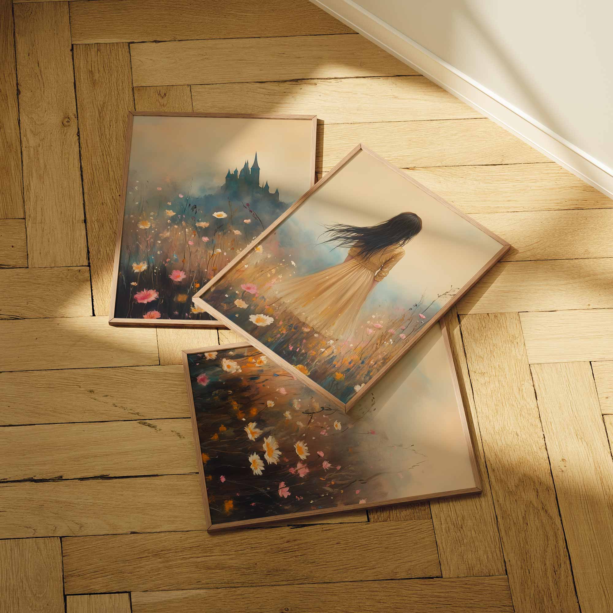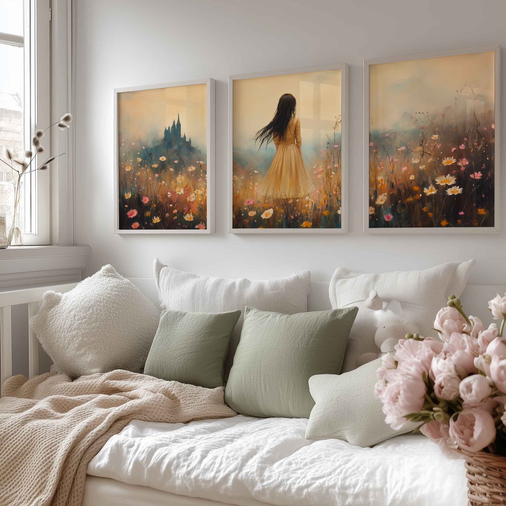 Terug naar collectie / Kinderkamer posters / Bloemen posters / Feeëriek bloemenveld met kasteel op de achtergrond