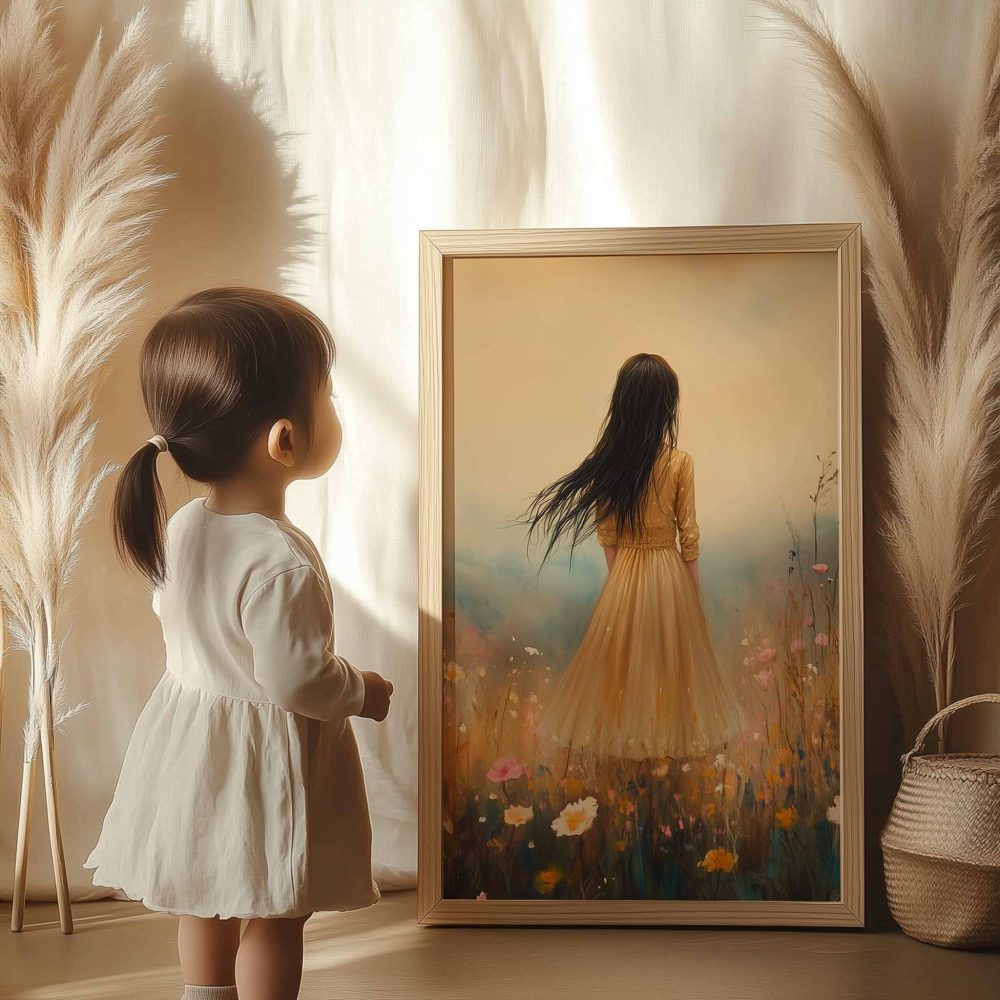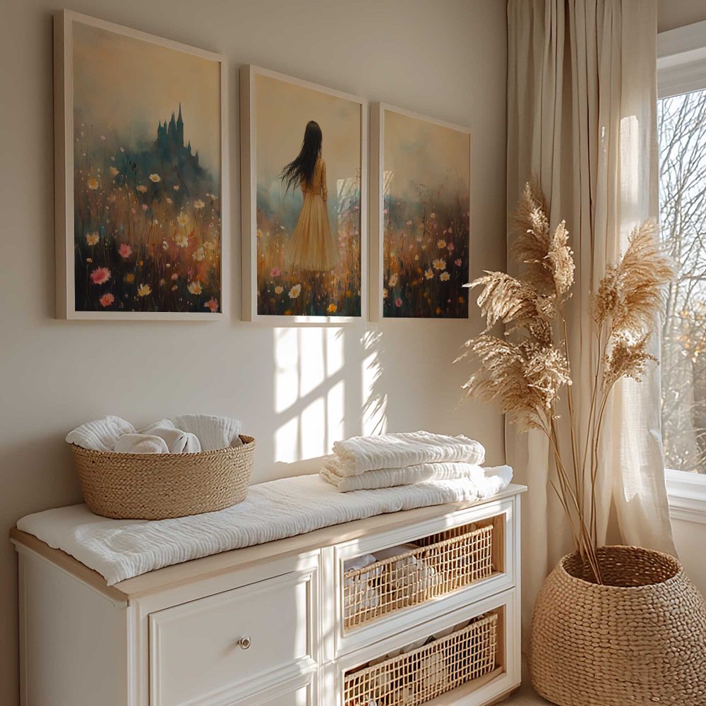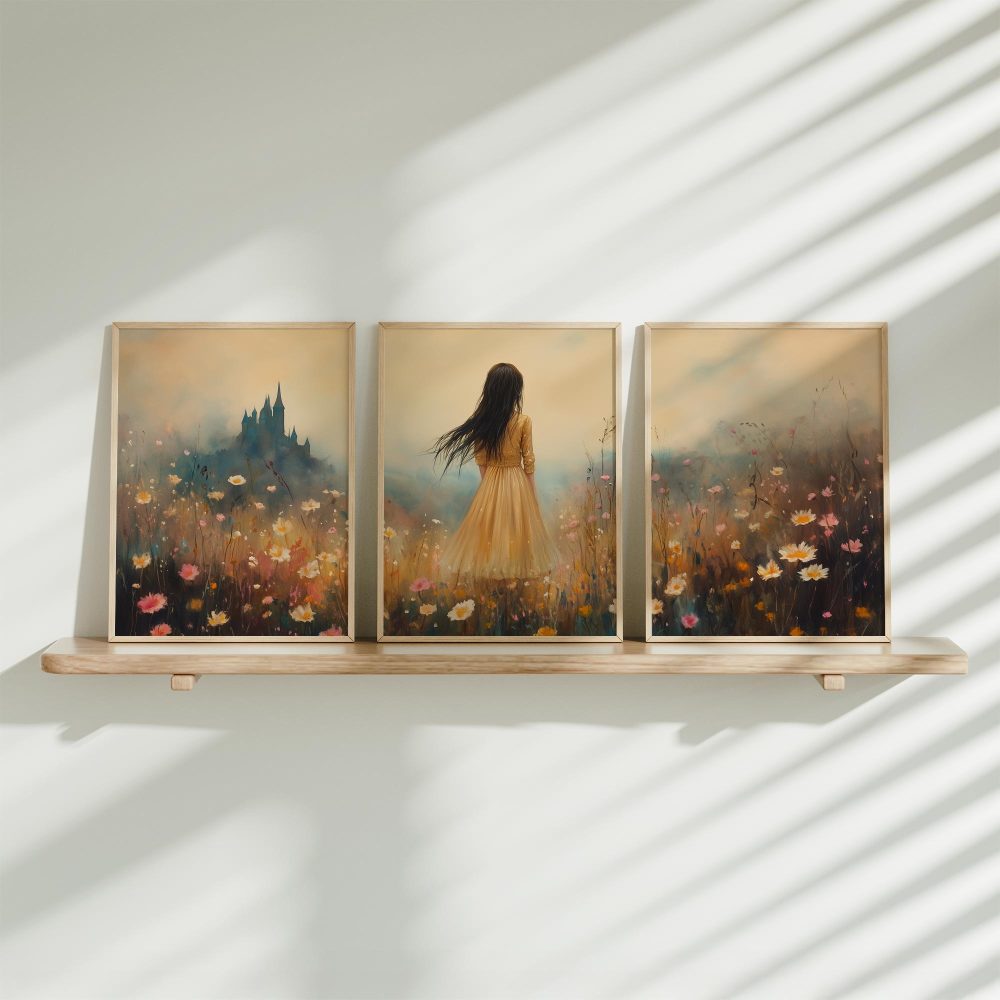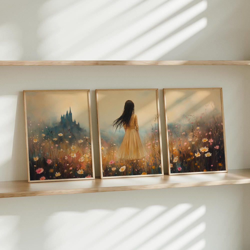 Terug naar collectie / Kinderkamer posters / Bloemen posters / Feeëriek bloemenveld met kasteel op de achtergrond
