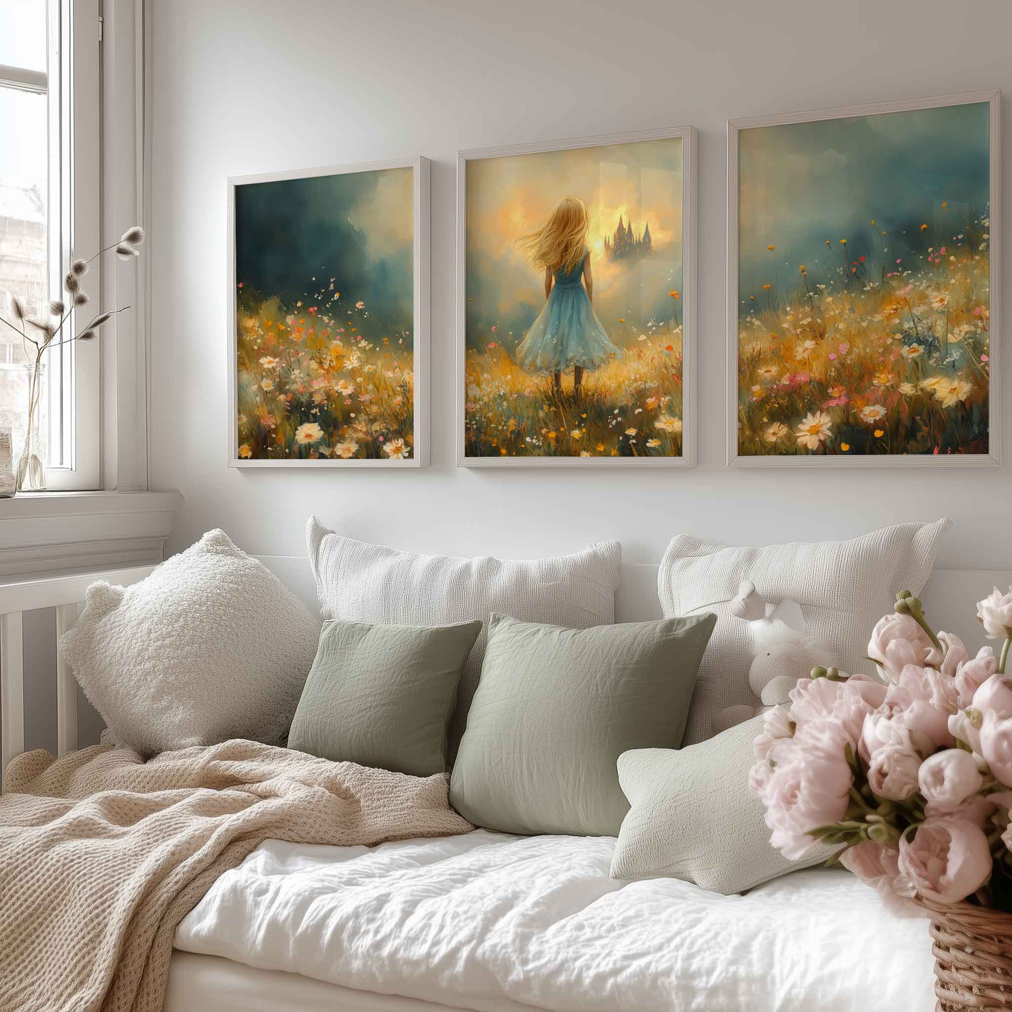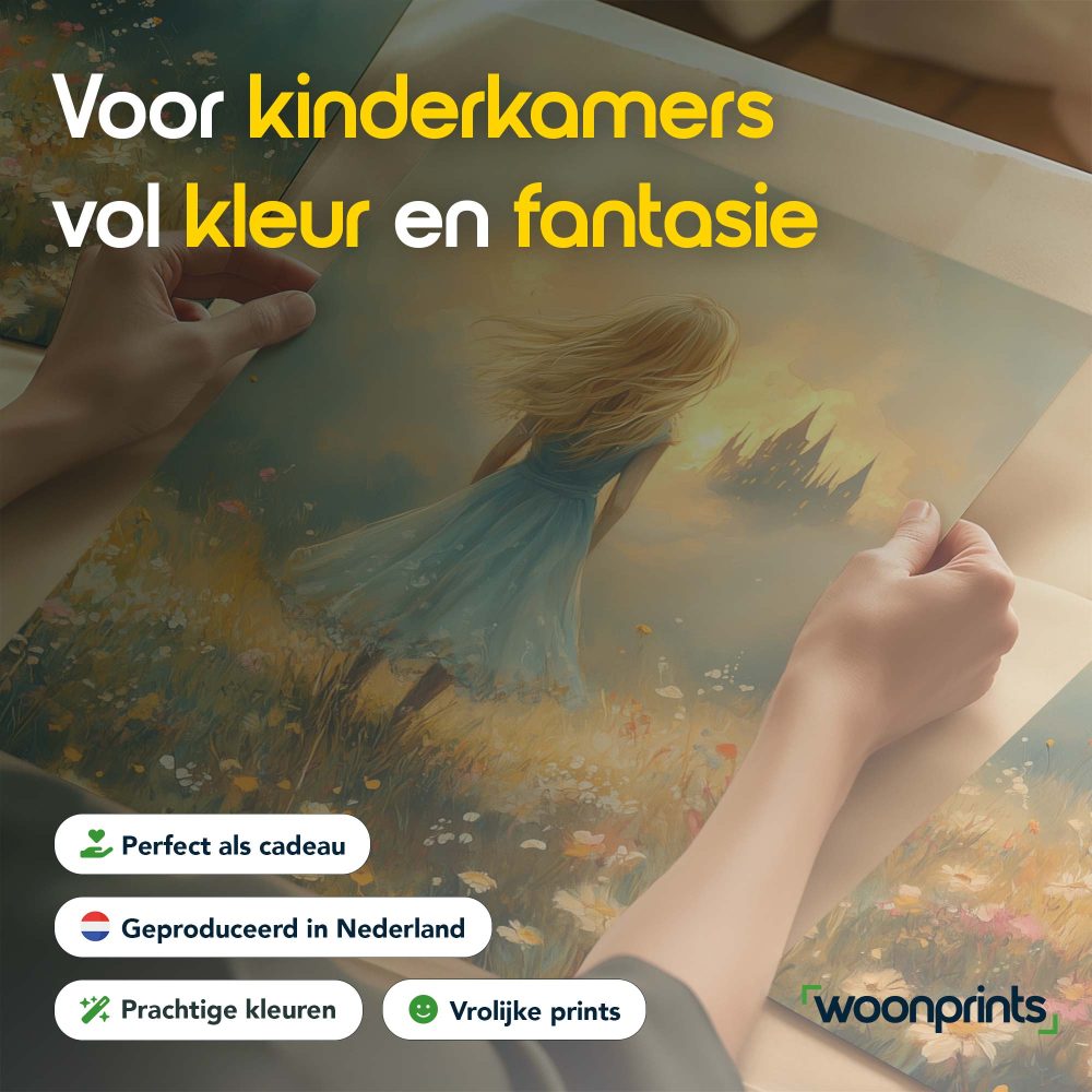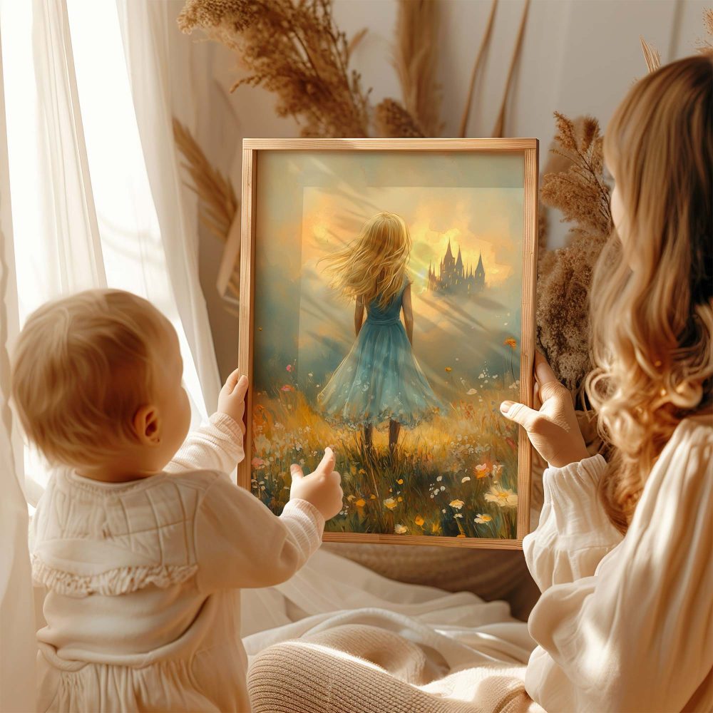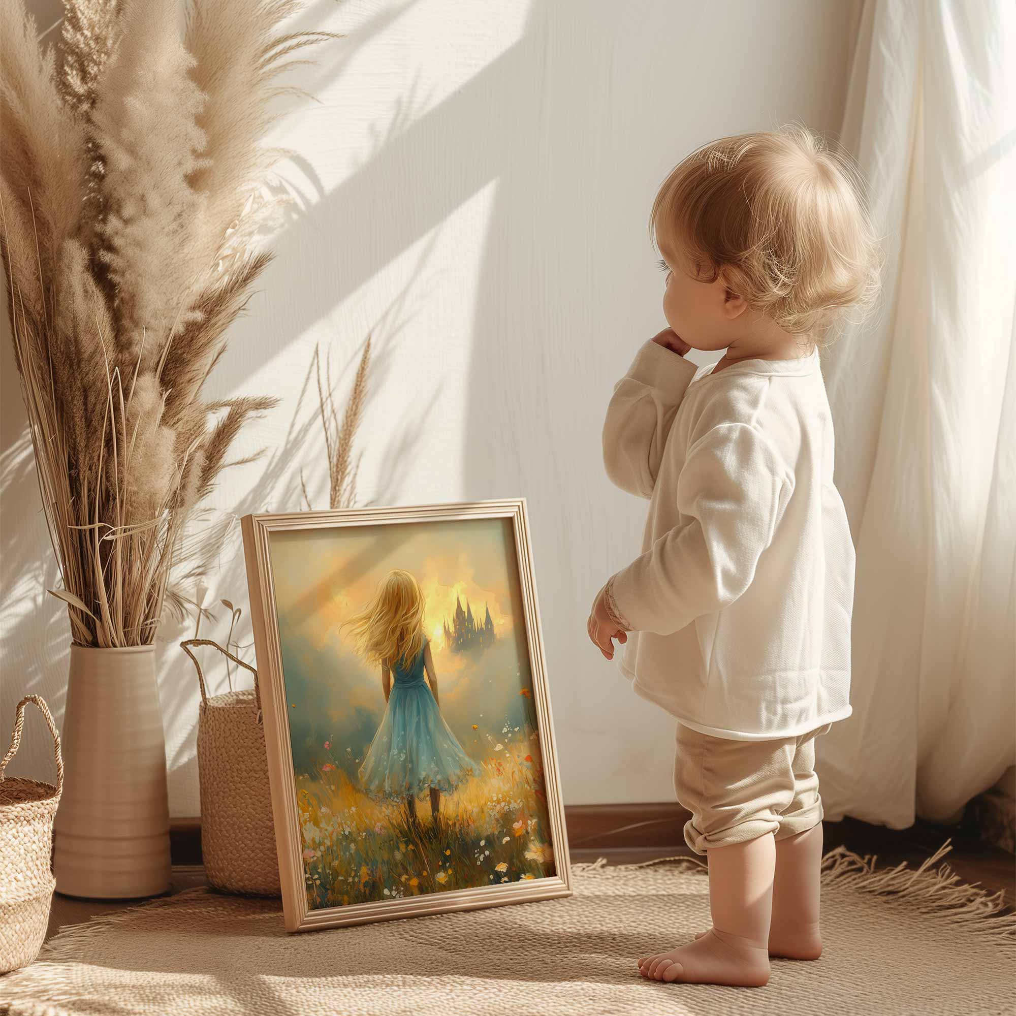 Terug naar collectie / Kinderkamer posters / Bloemen posters / Feeëriek Meisje in Bloeiend Bloemenveld met Kasteel