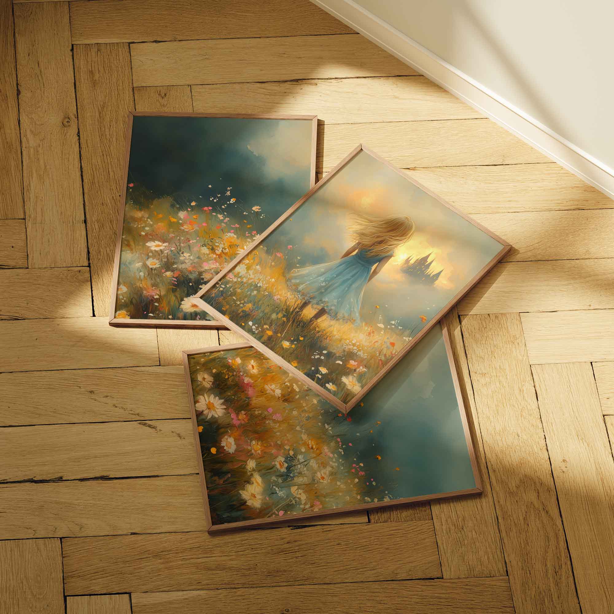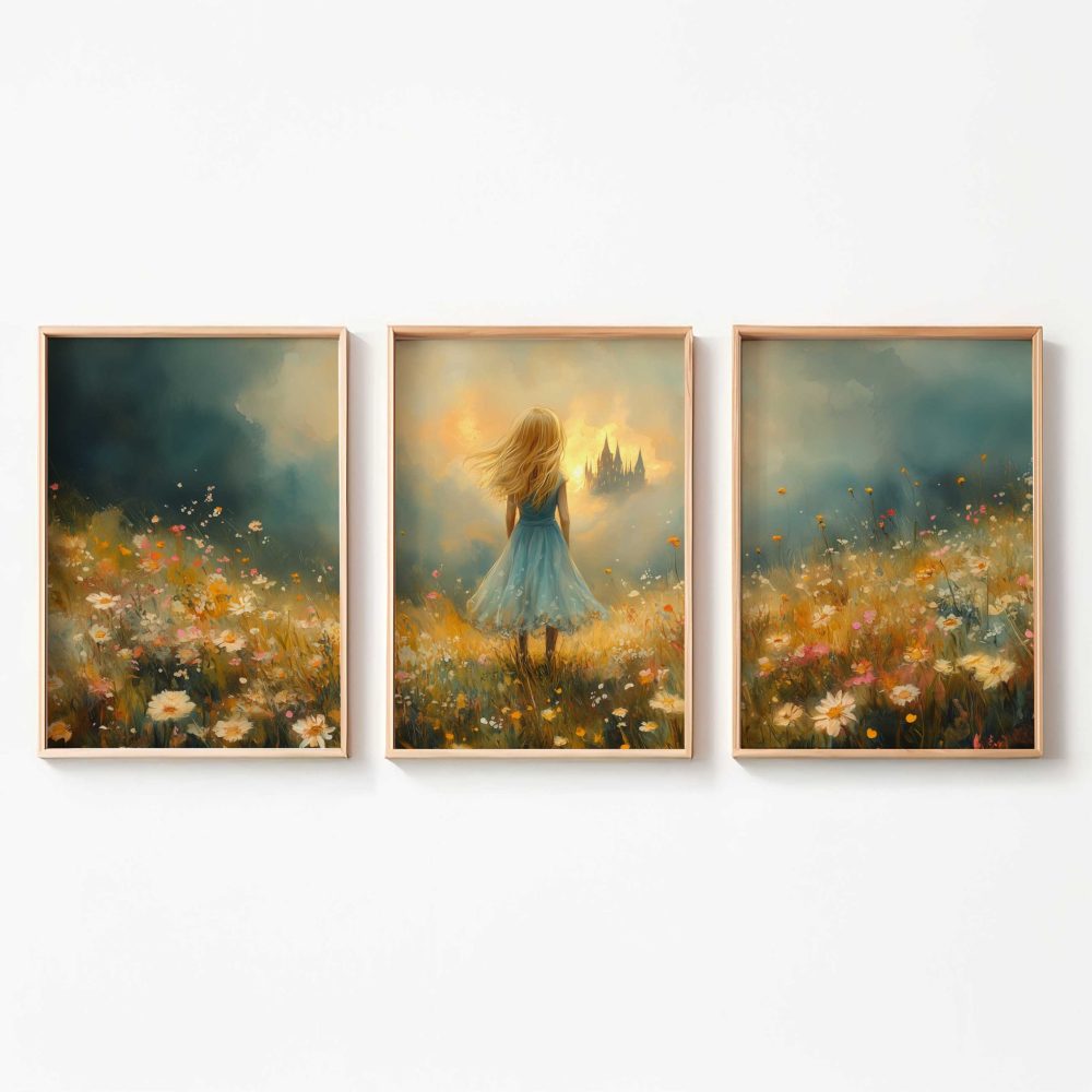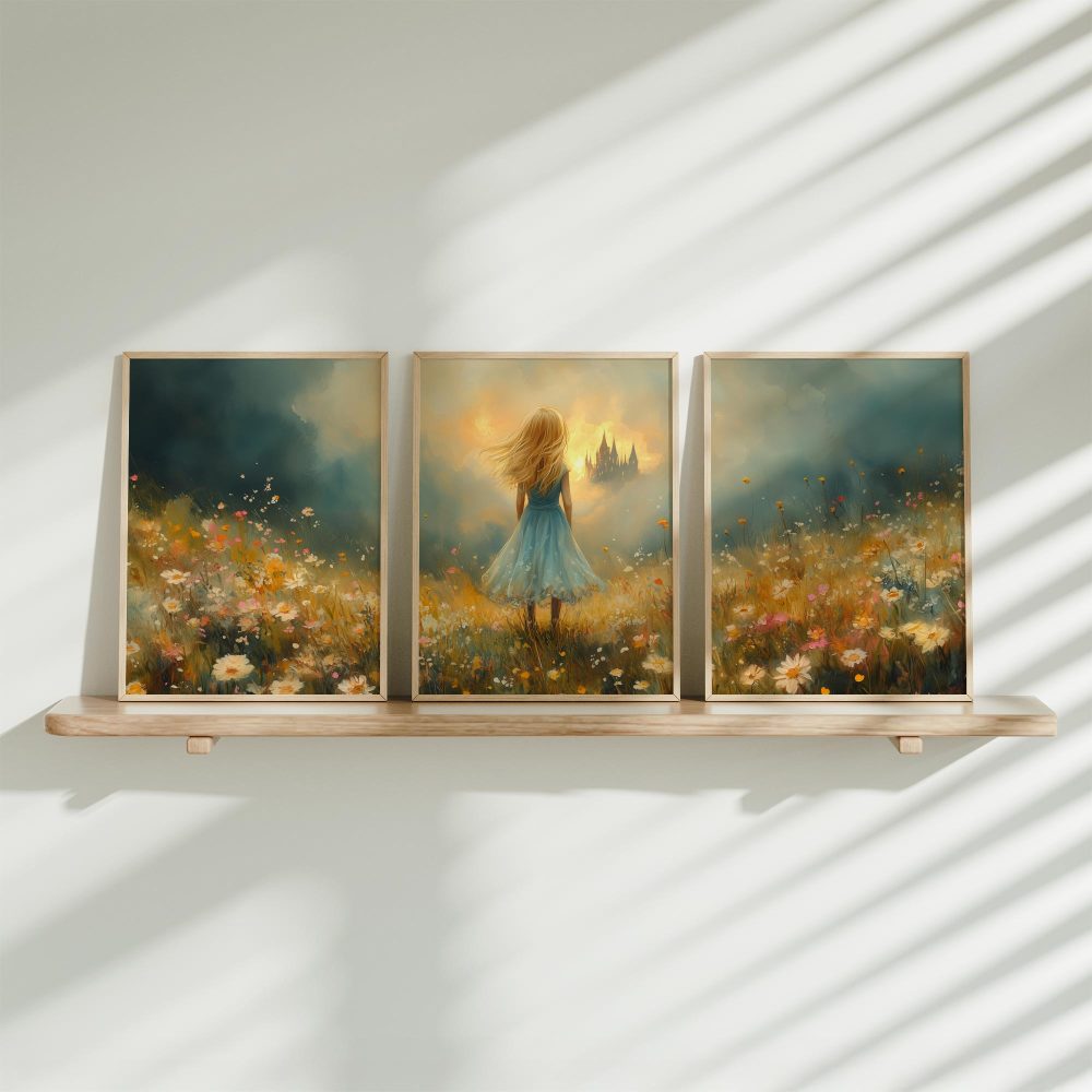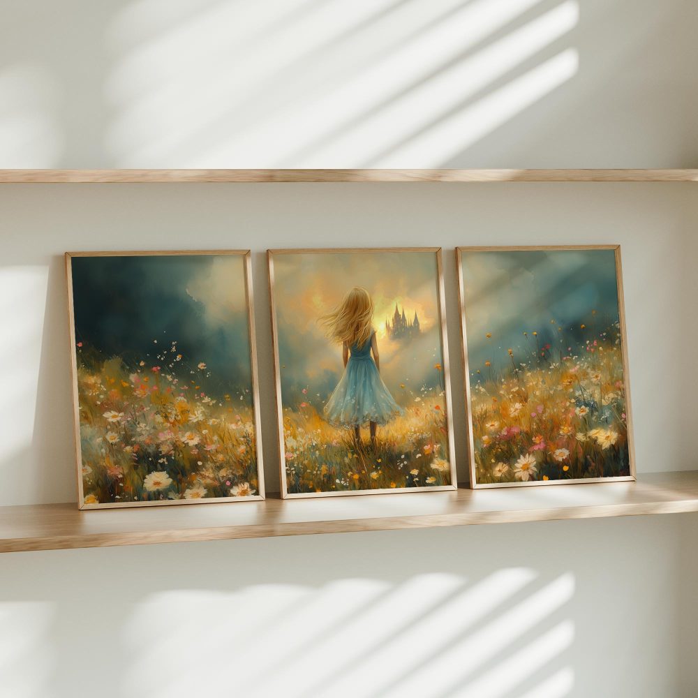 Terug naar collectie / Kinderkamer posters / Bloemen posters / Feeëriek Meisje in Bloeiend Bloemenveld met Kasteel