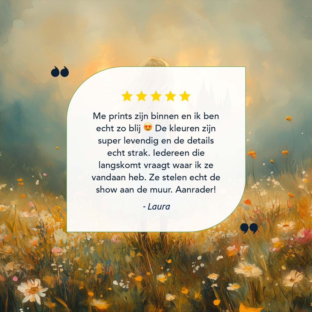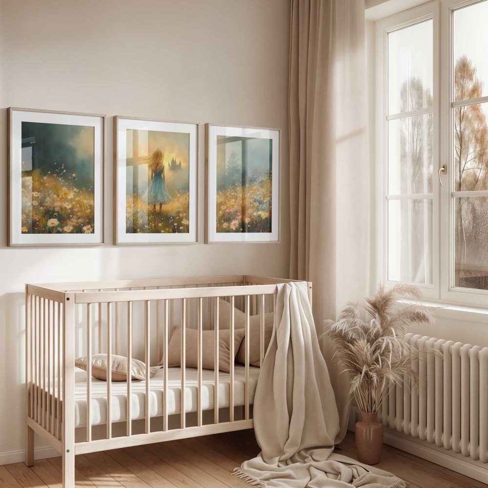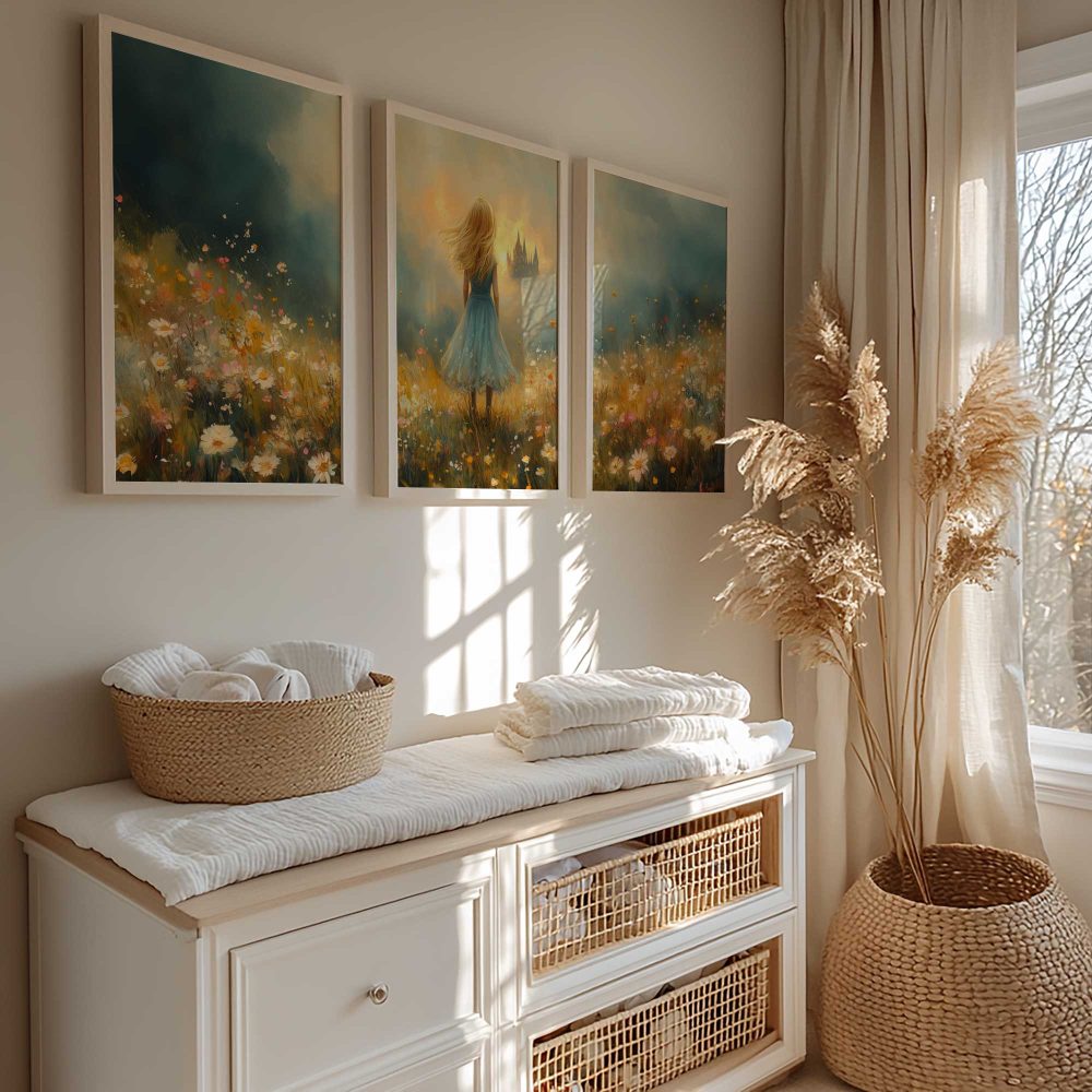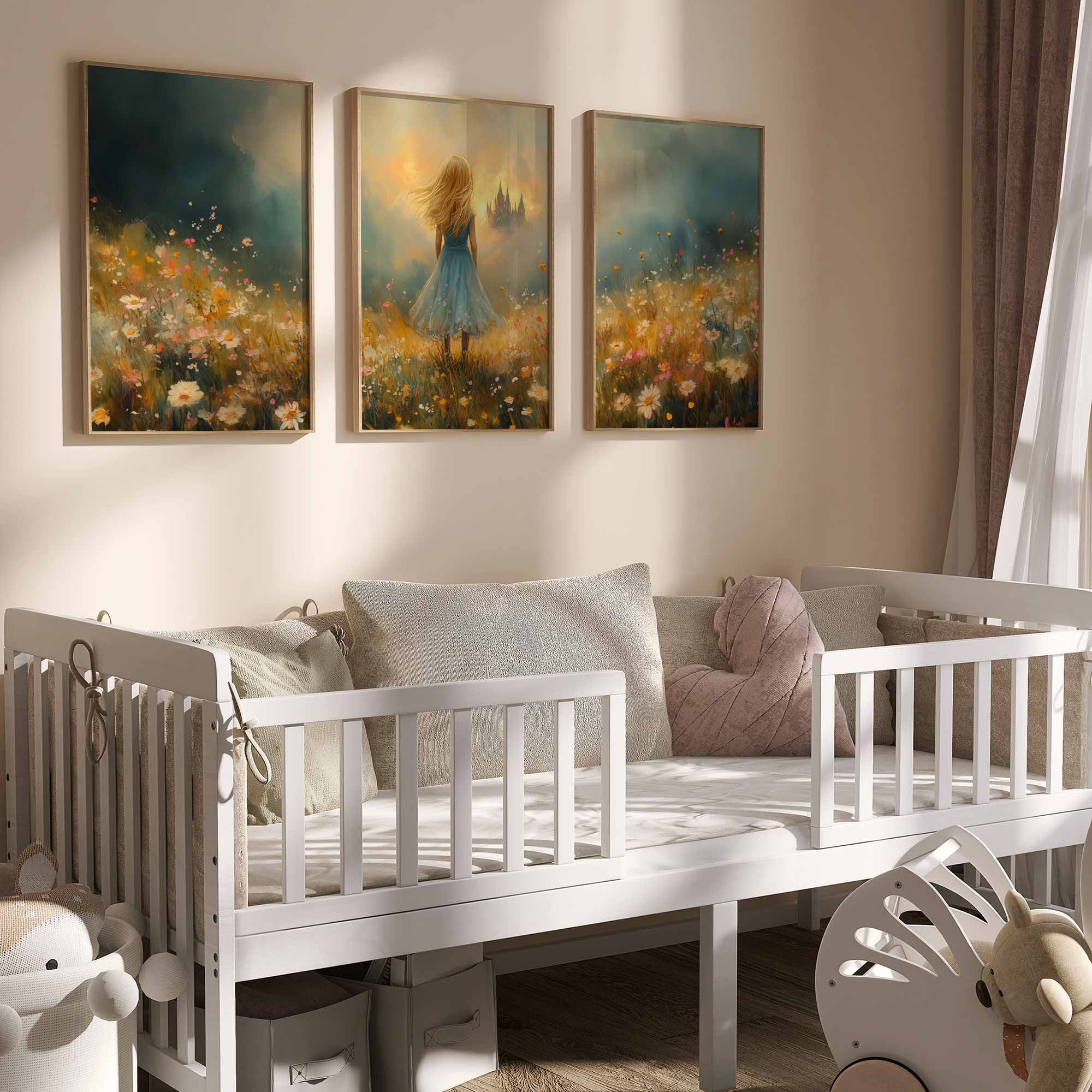 Terug naar collectie / Kinderkamer posters / Bloemen posters / Feeëriek Meisje in Bloeiend Bloemenveld met Kasteel