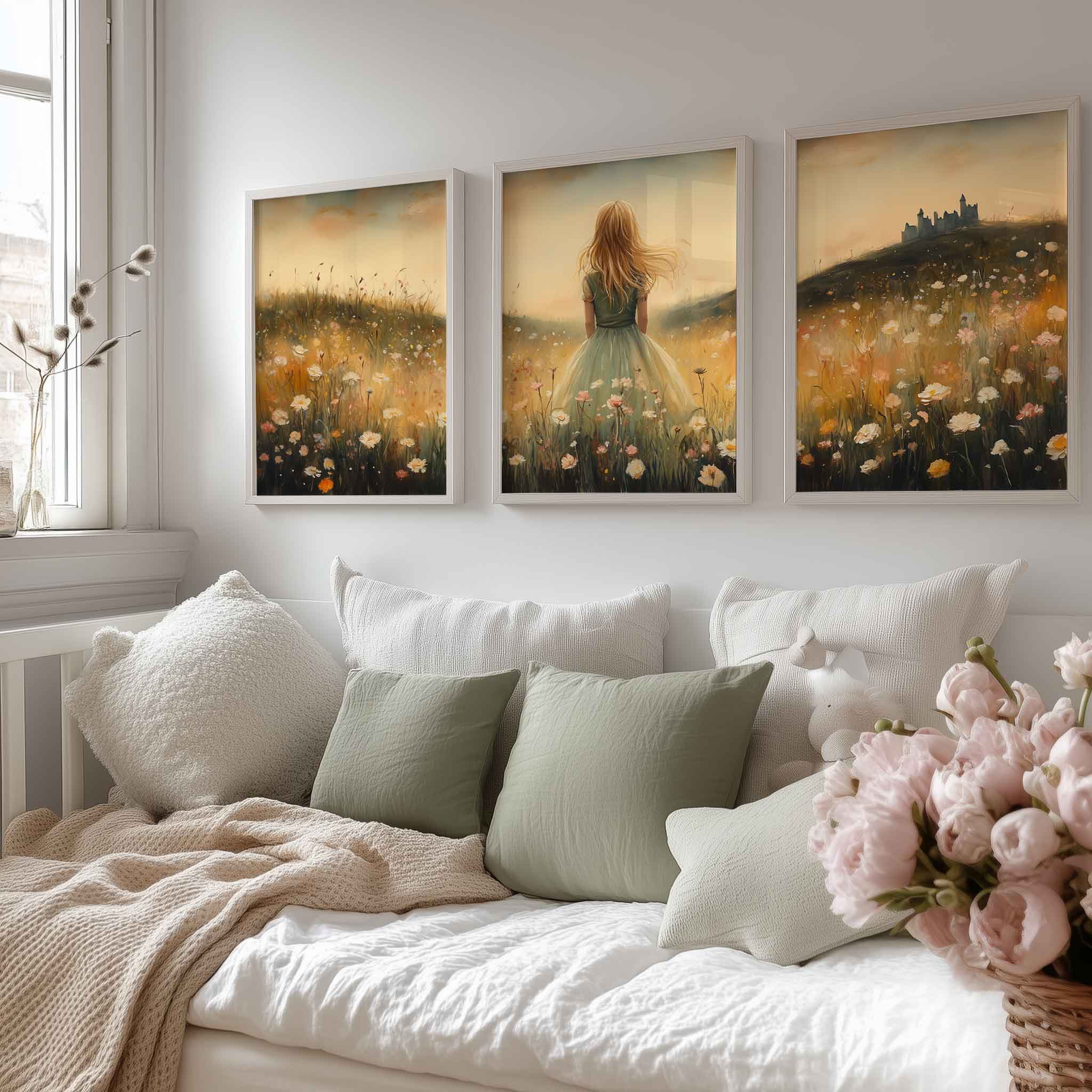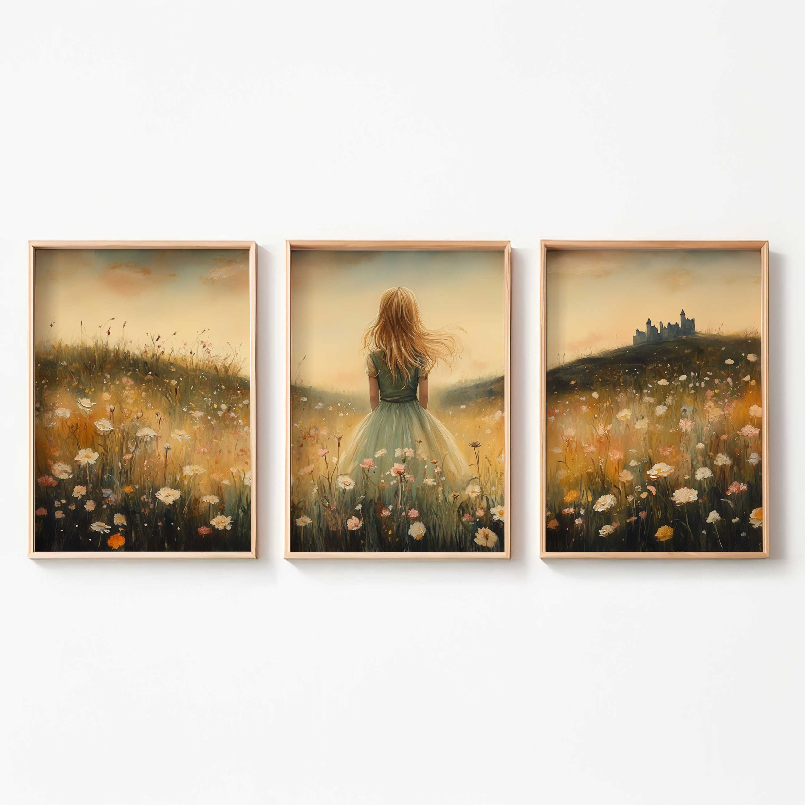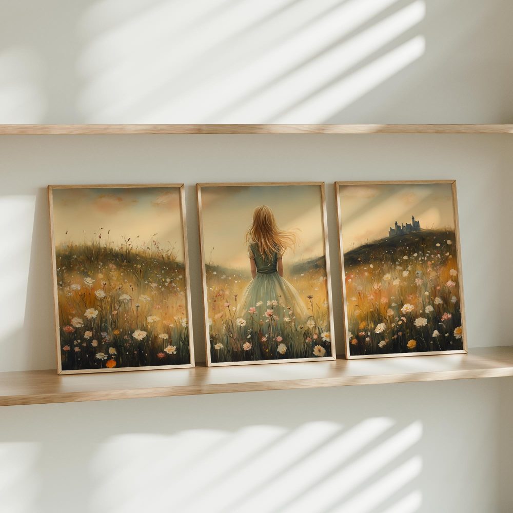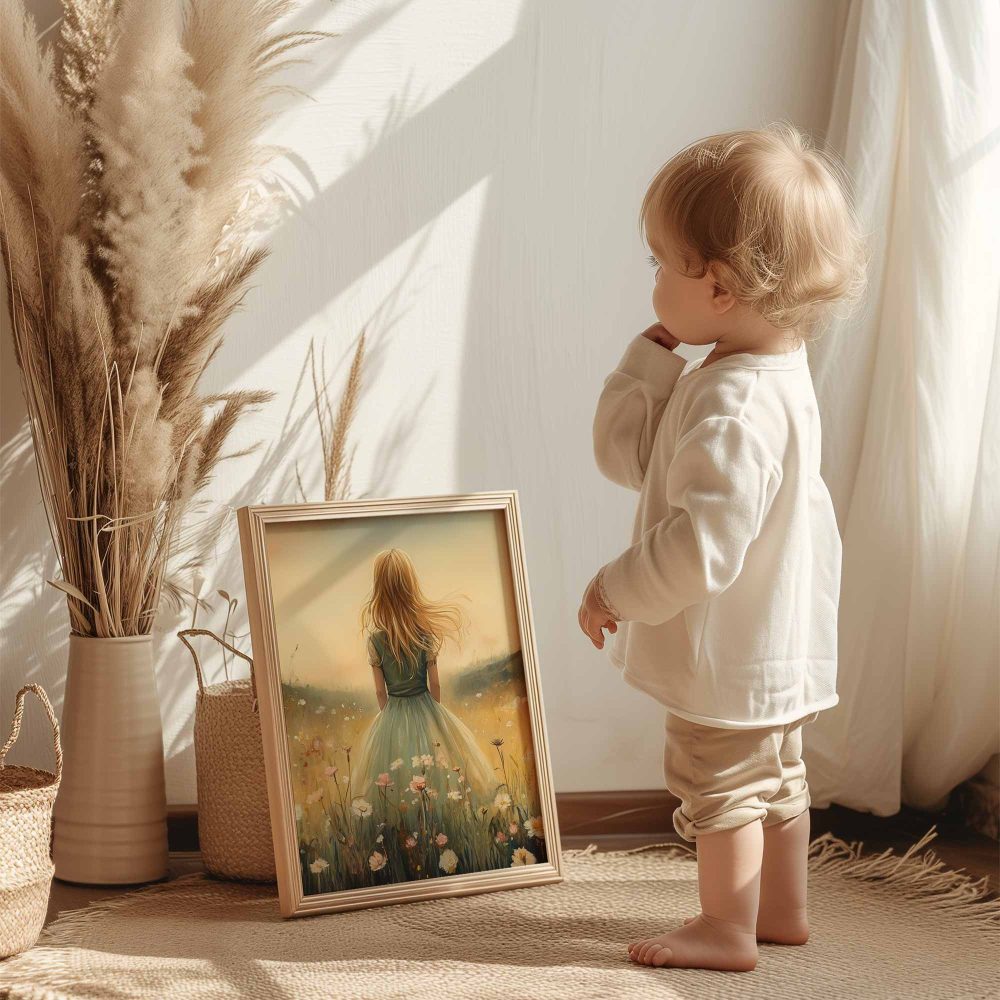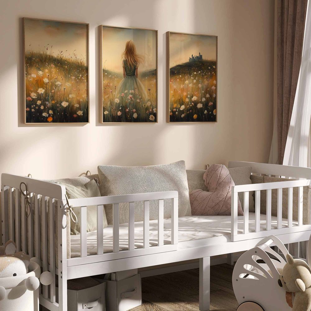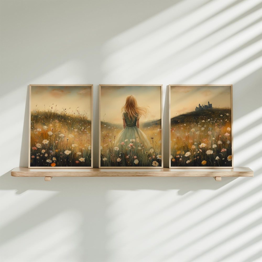 Terug naar collectie / Kinderkamer posters / Bloemen posters / Feeëriek Meisje in Bloemenveld met Kasteel