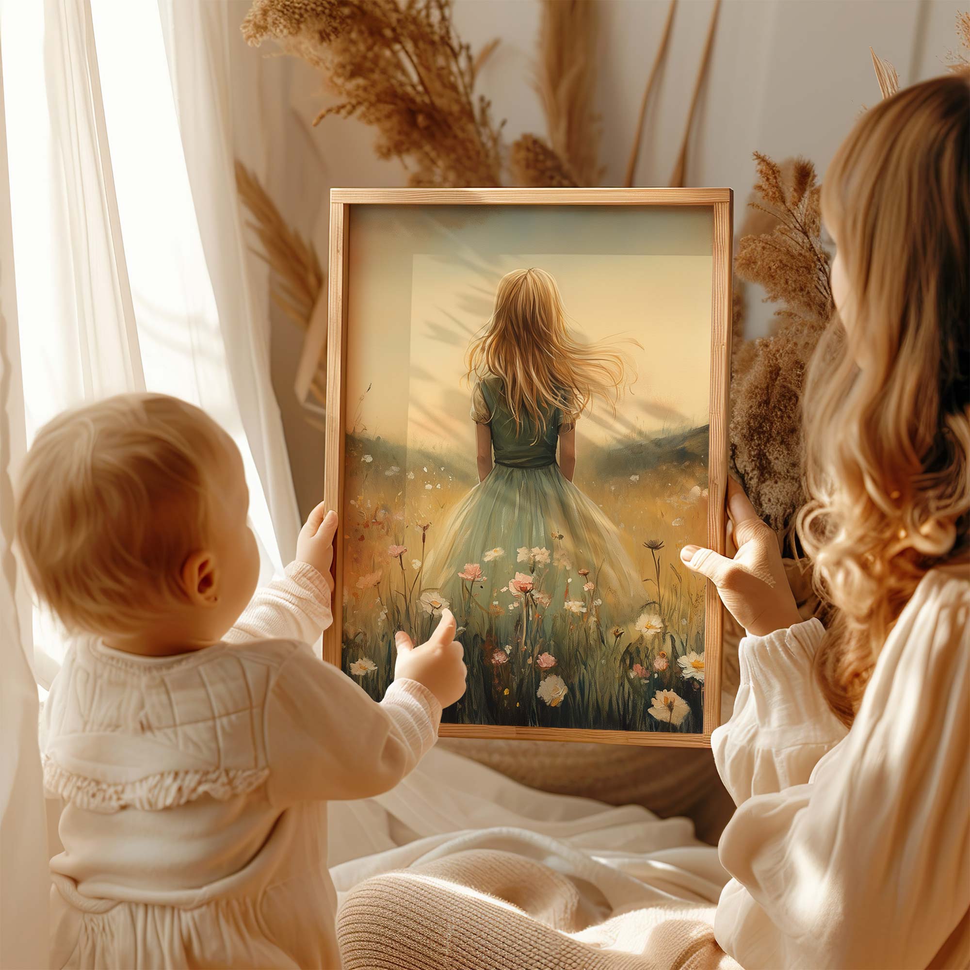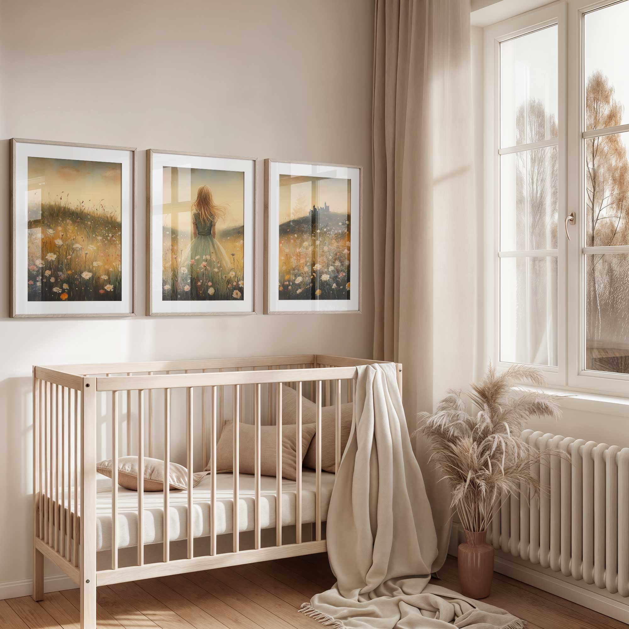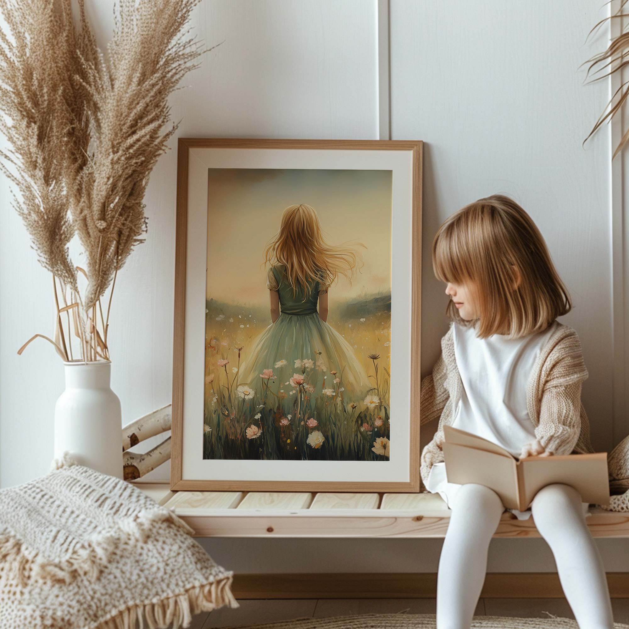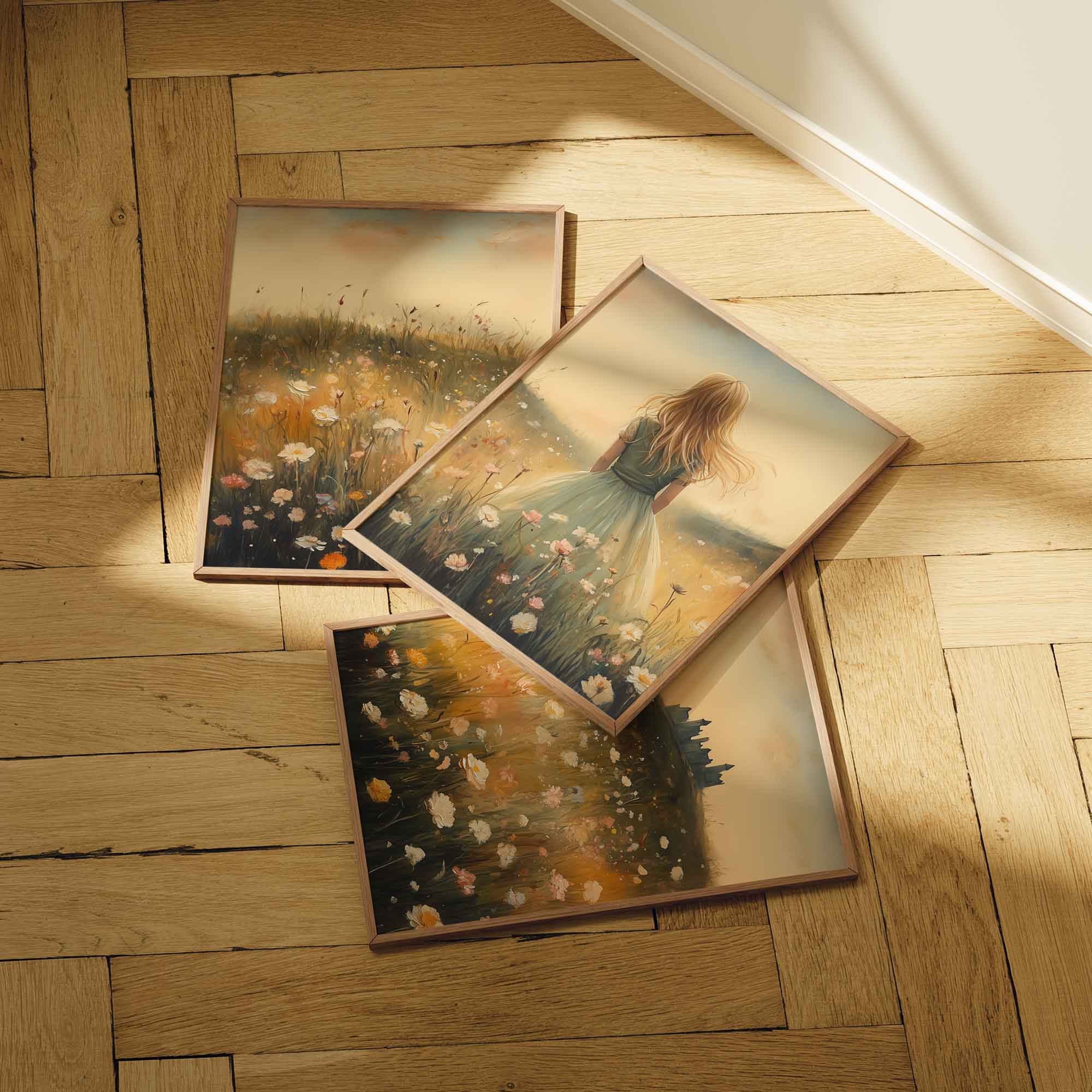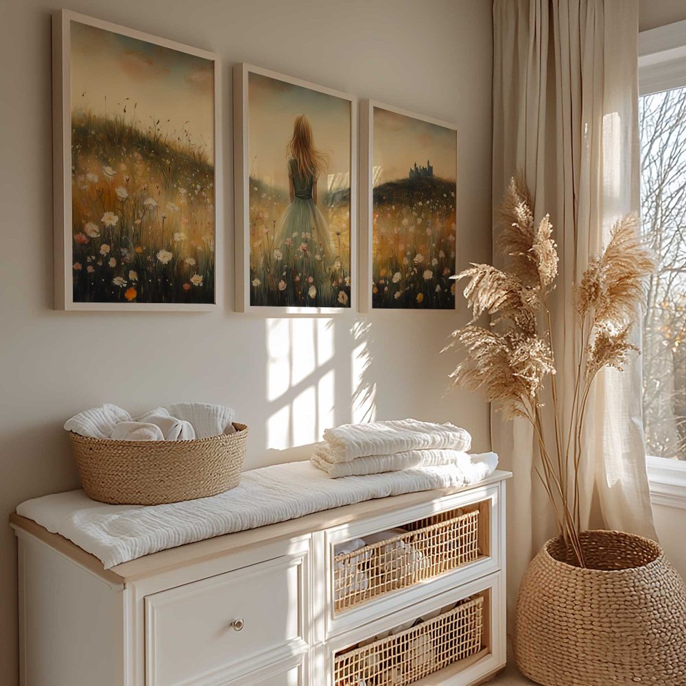Terug naar collectie / Kinderkamer posters / Bloemen posters / Feeëriek Meisje in Bloemenveld met Kasteel