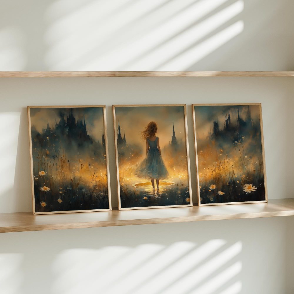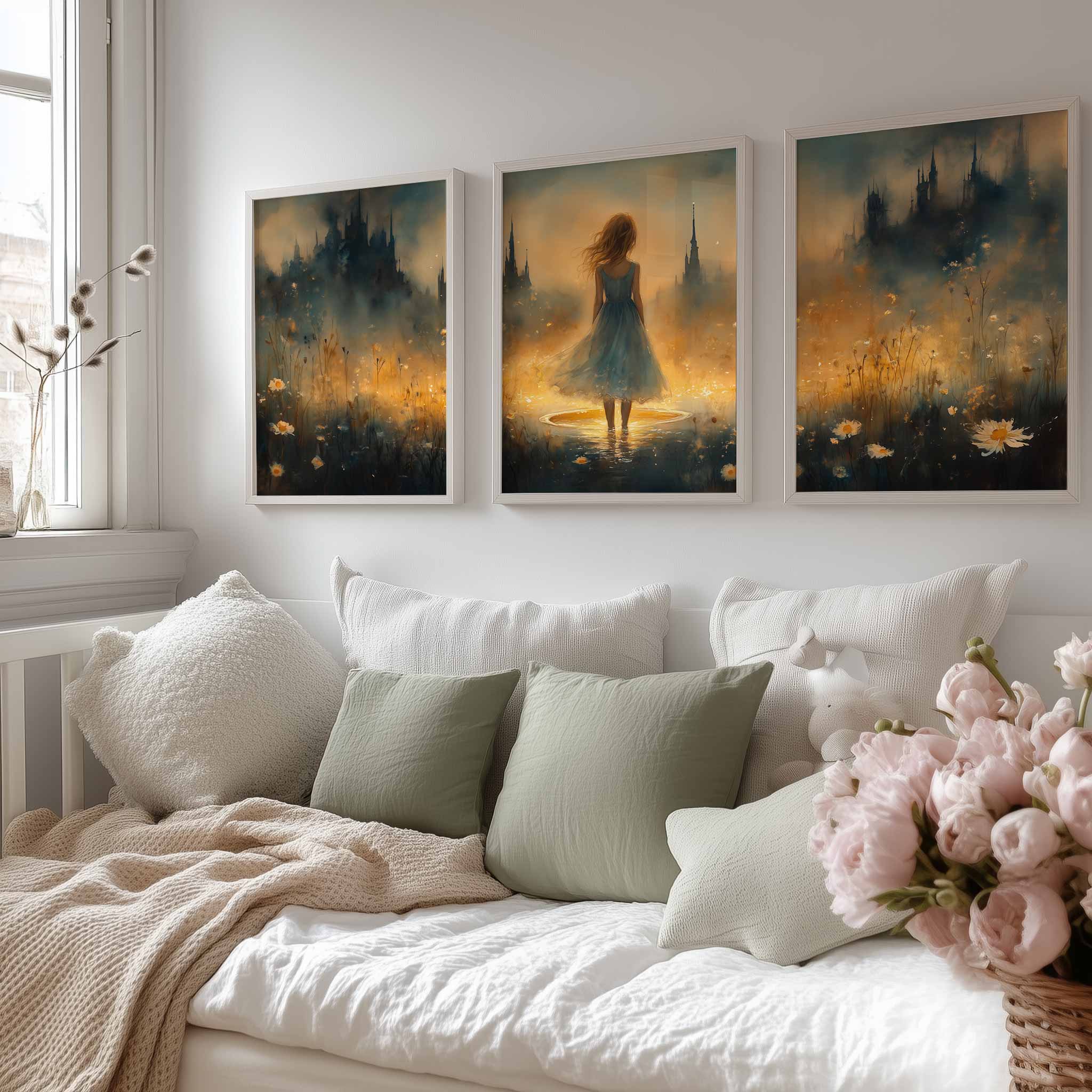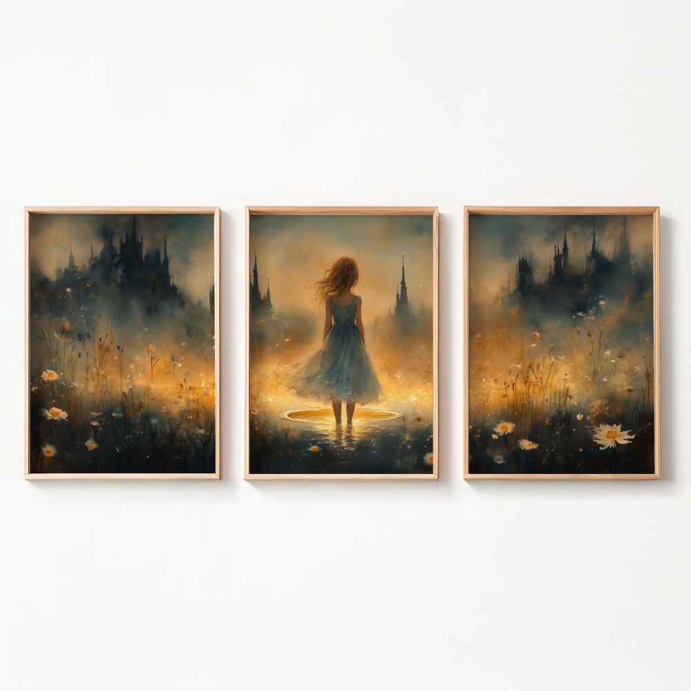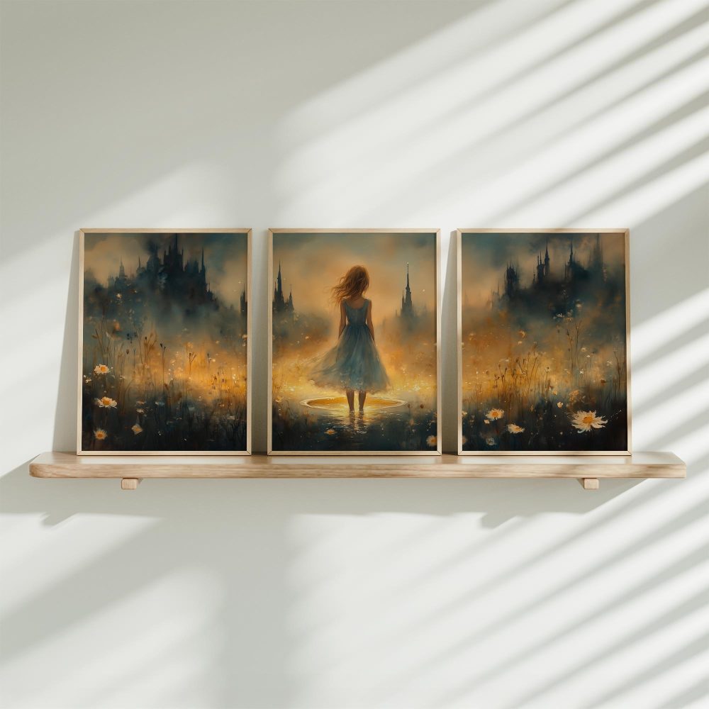 Terug naar collectie / Kinderkamer posters / Bloemen posters / Feeërieke Dame in Bloeiend Bloemenveld met Kasteel