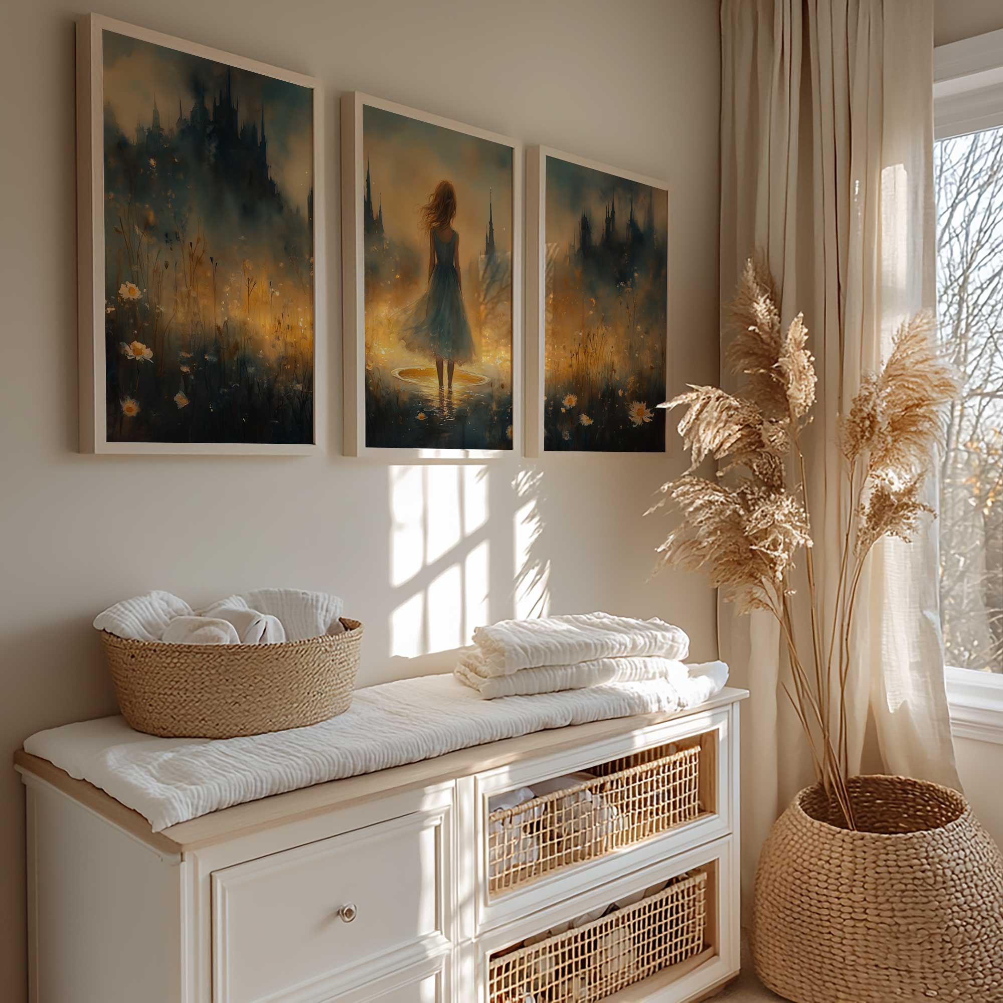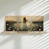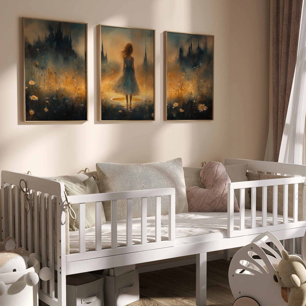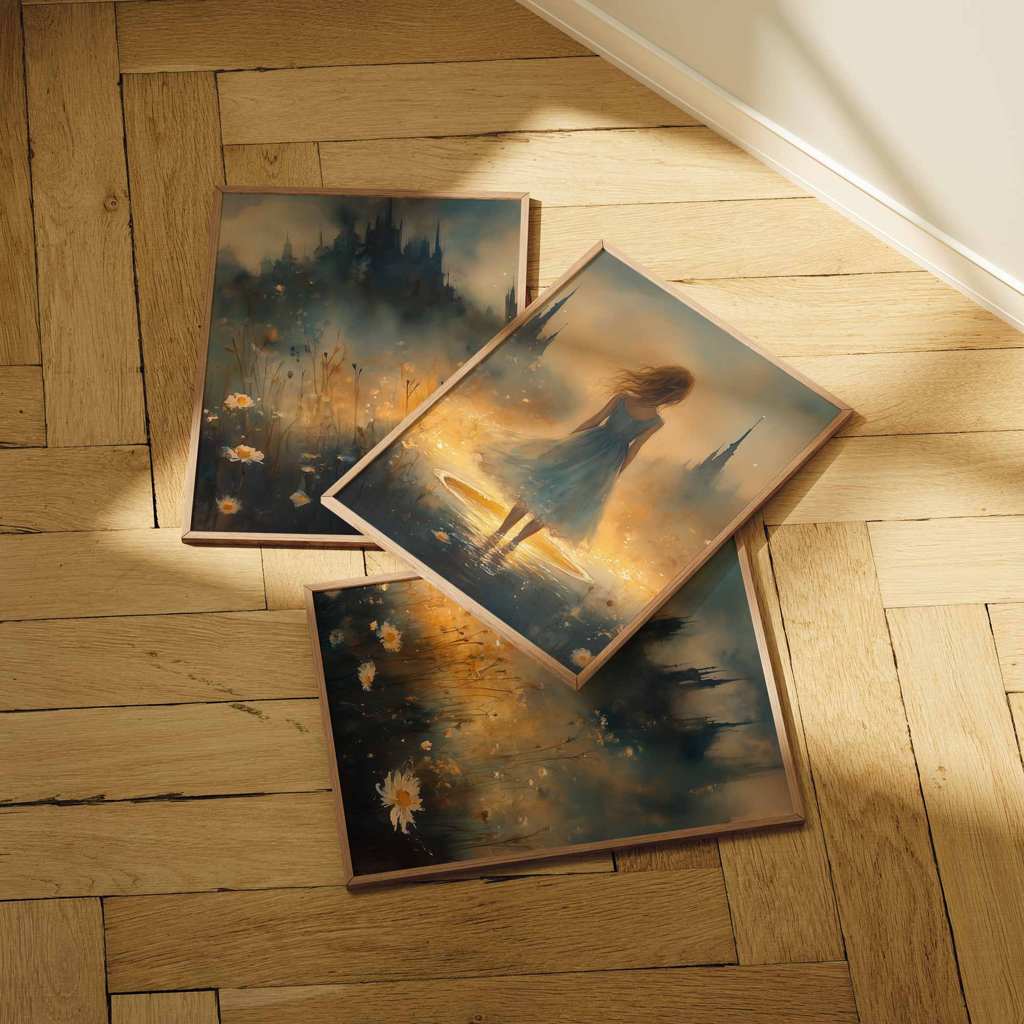 Terug naar collectie / Kinderkamer posters / Bloemen posters / Feeërieke Dame in Bloeiend Bloemenveld met Kasteel