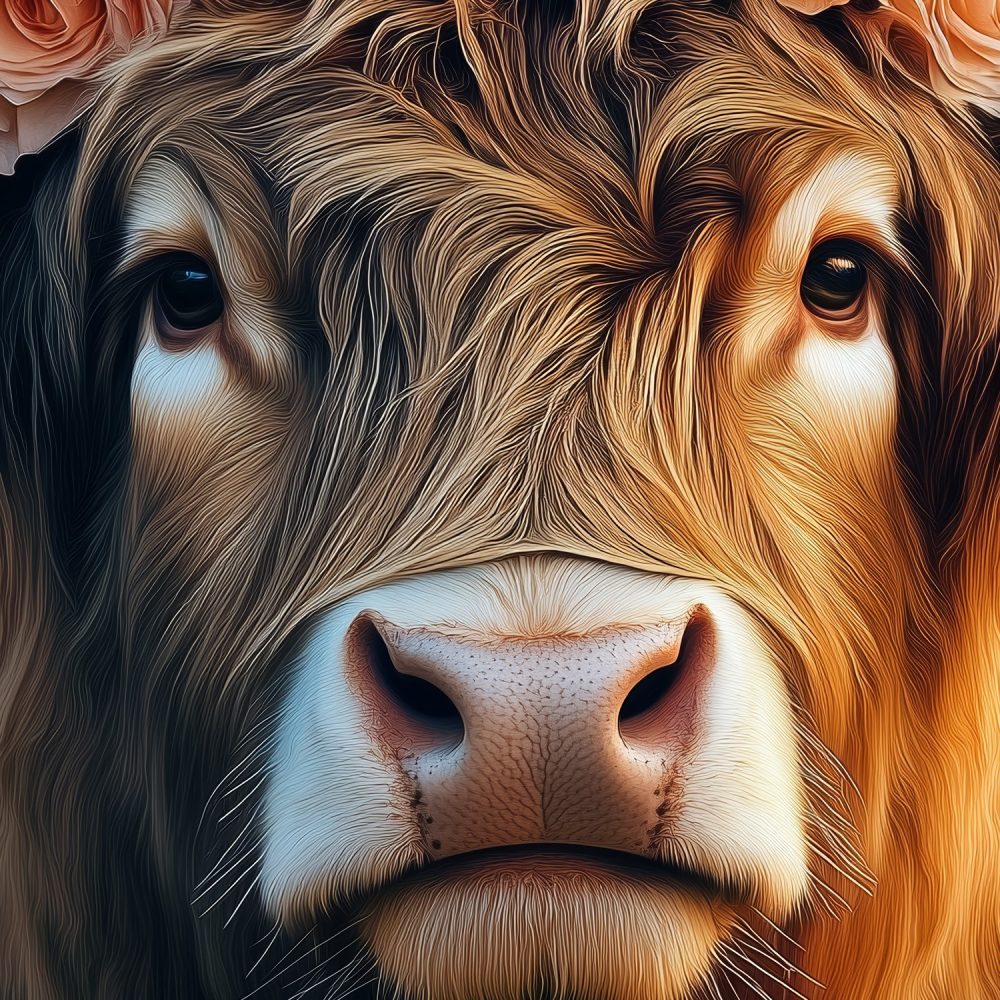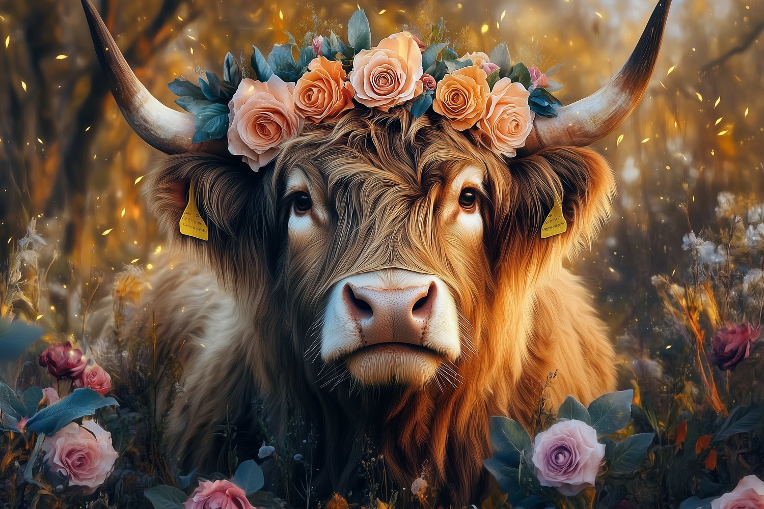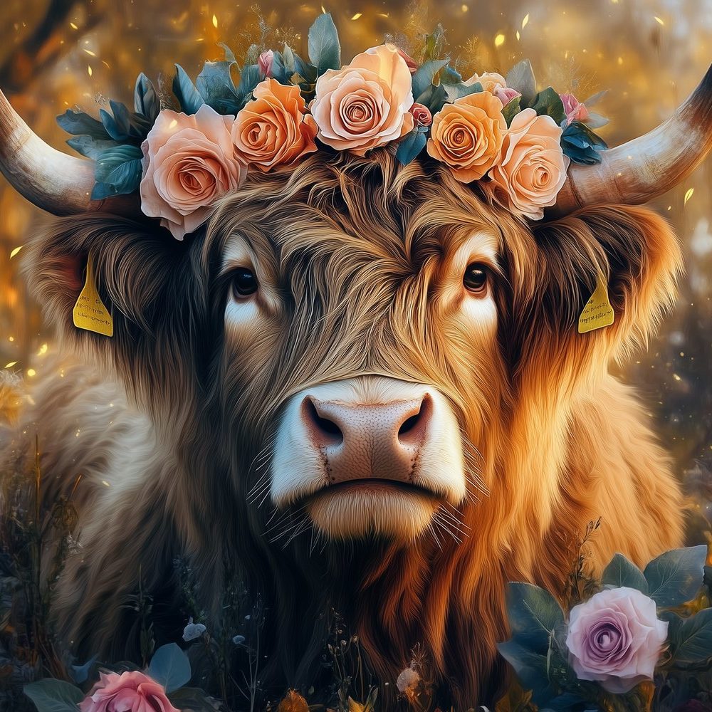 Terug naar collectie / Behang / Gekroonde koe in bloemenveld behang