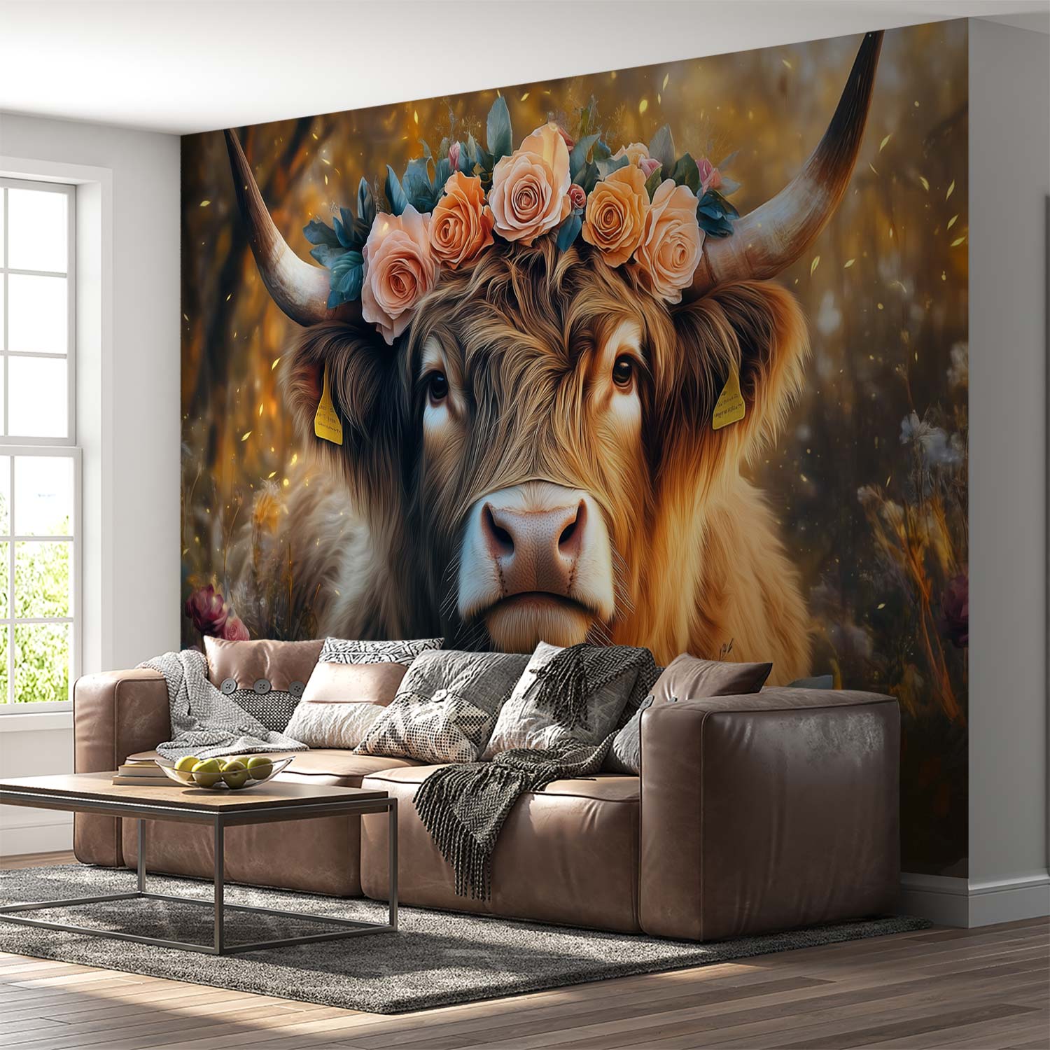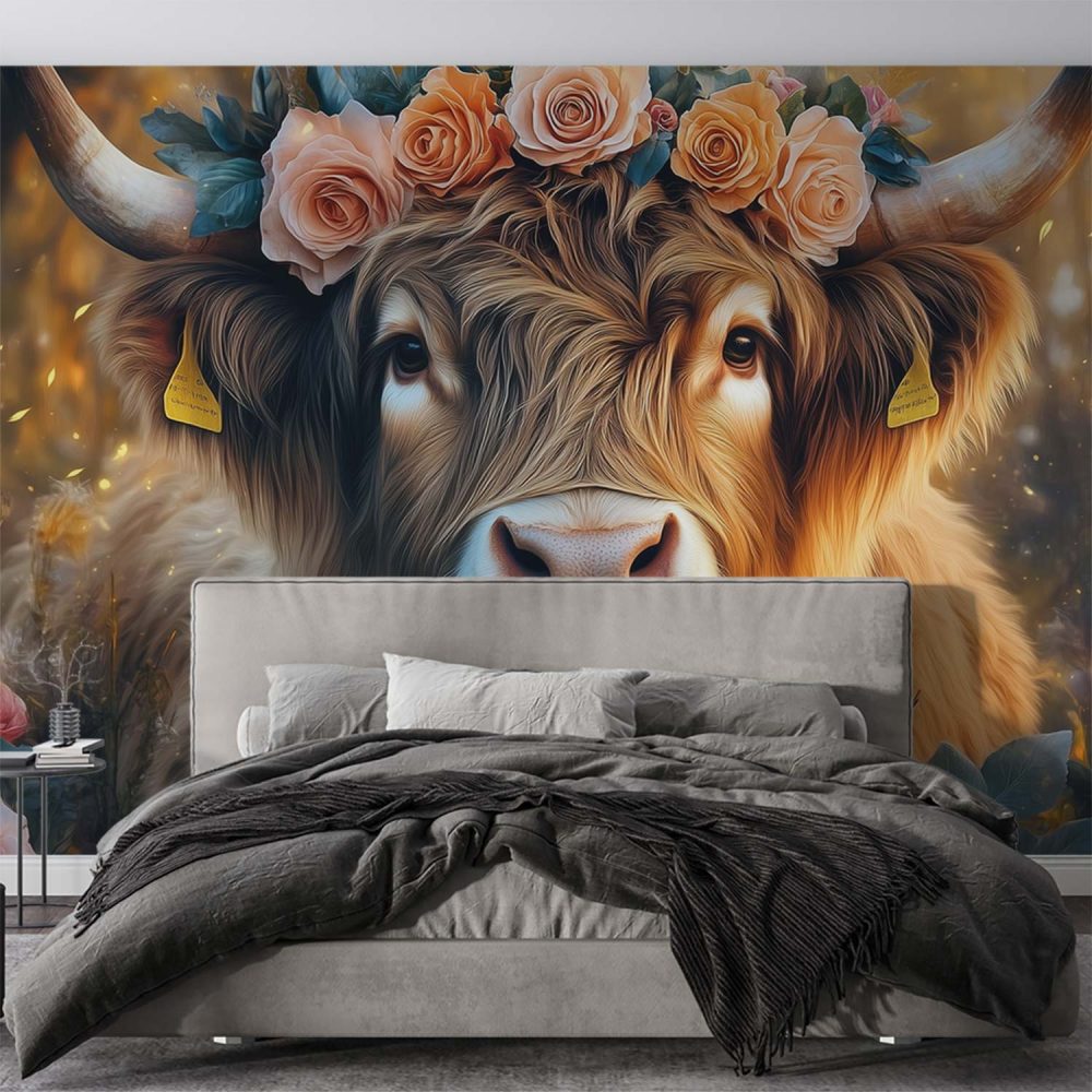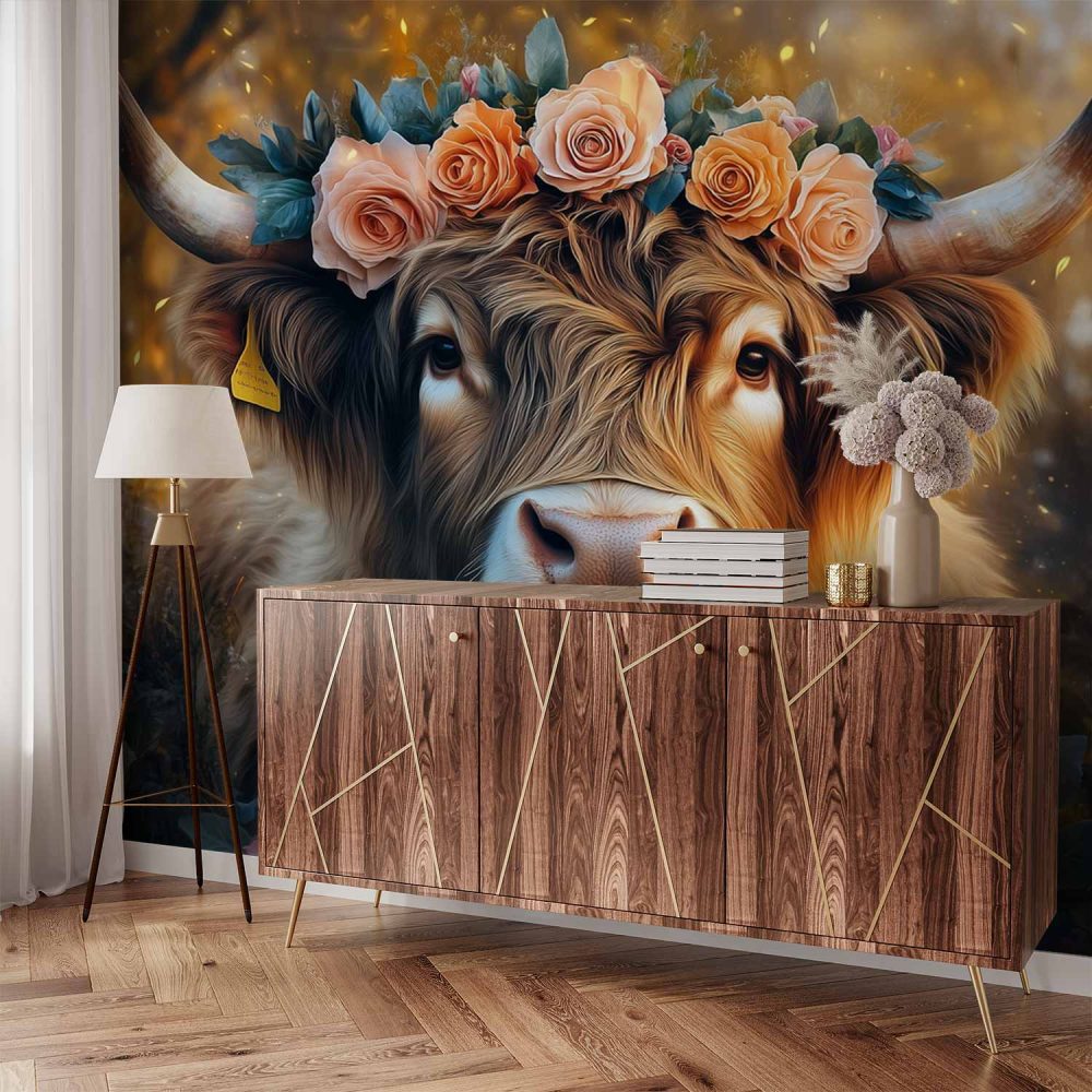 Gekroonde koe in bloemenveld behang