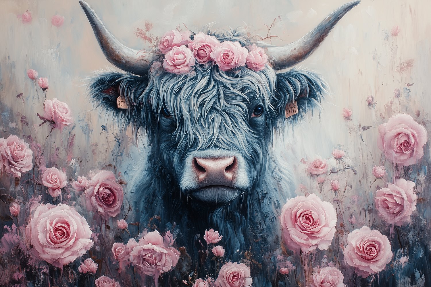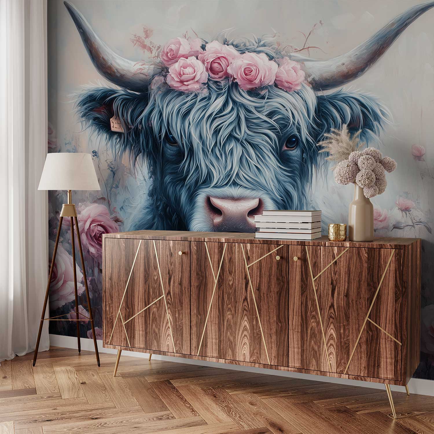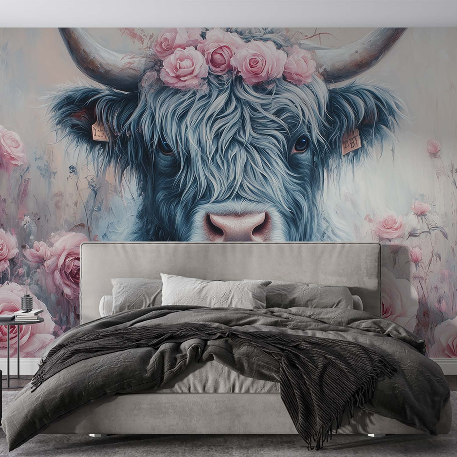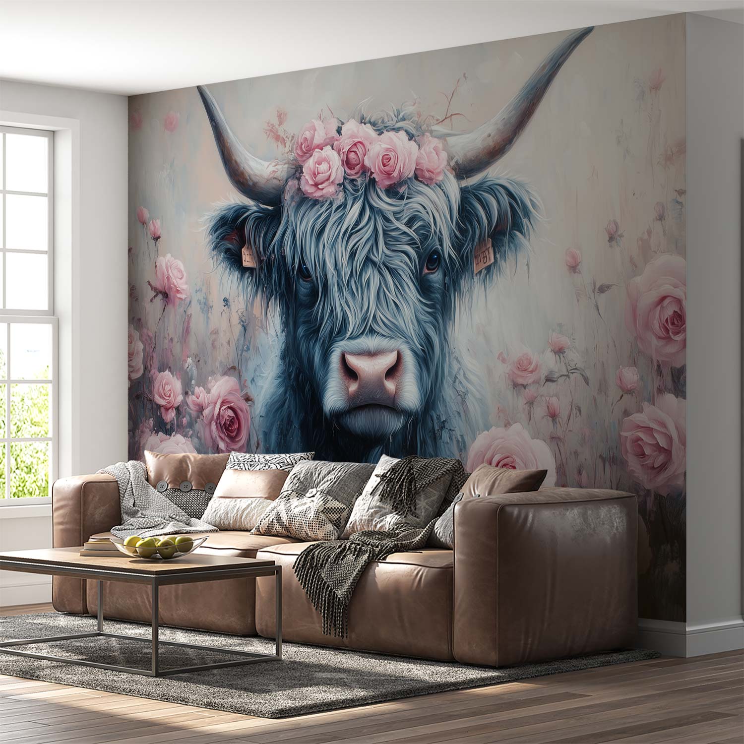 Terug naar collectie / Behang / Gekroonde koe in rozentuin behang