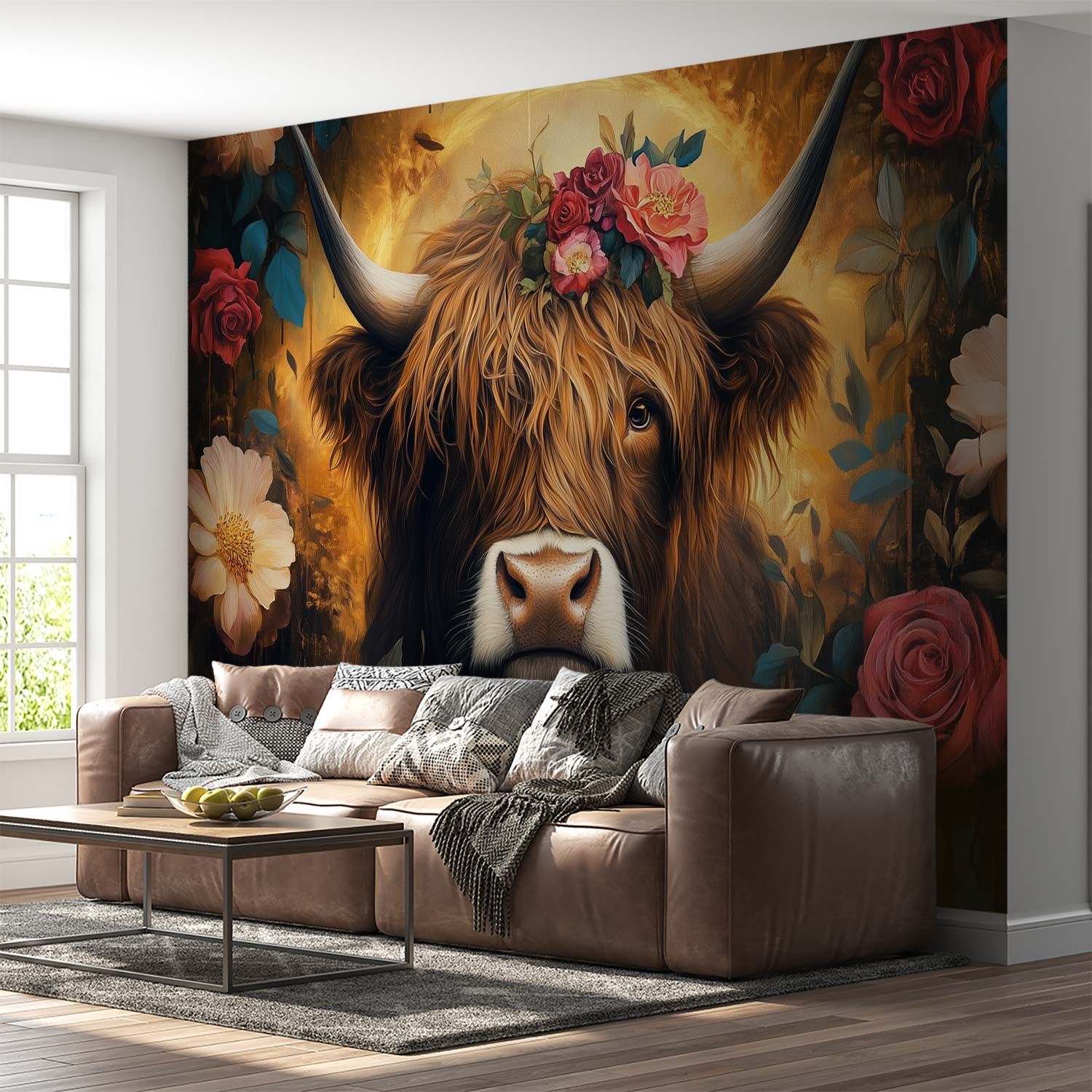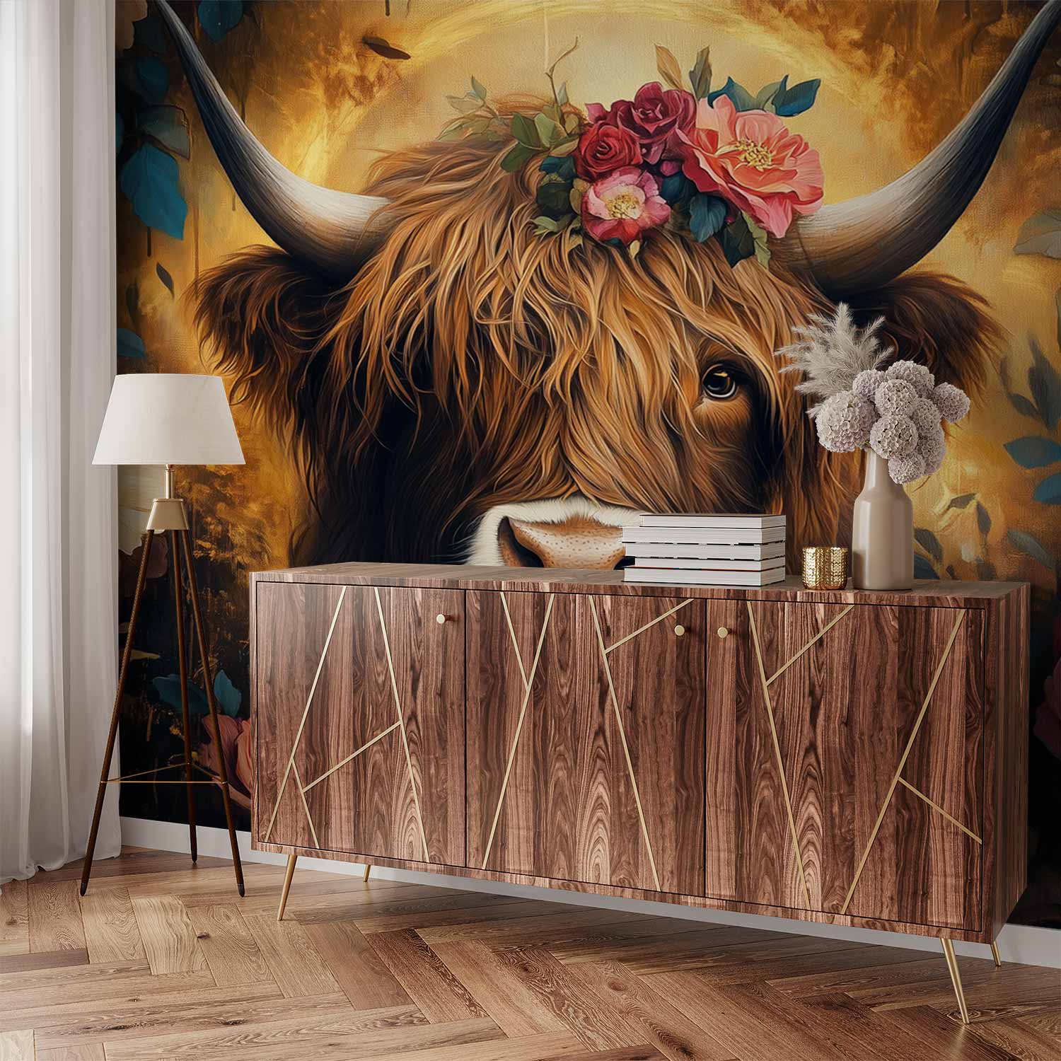 Gekroonde koe met bloemen behang