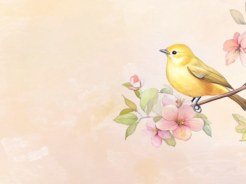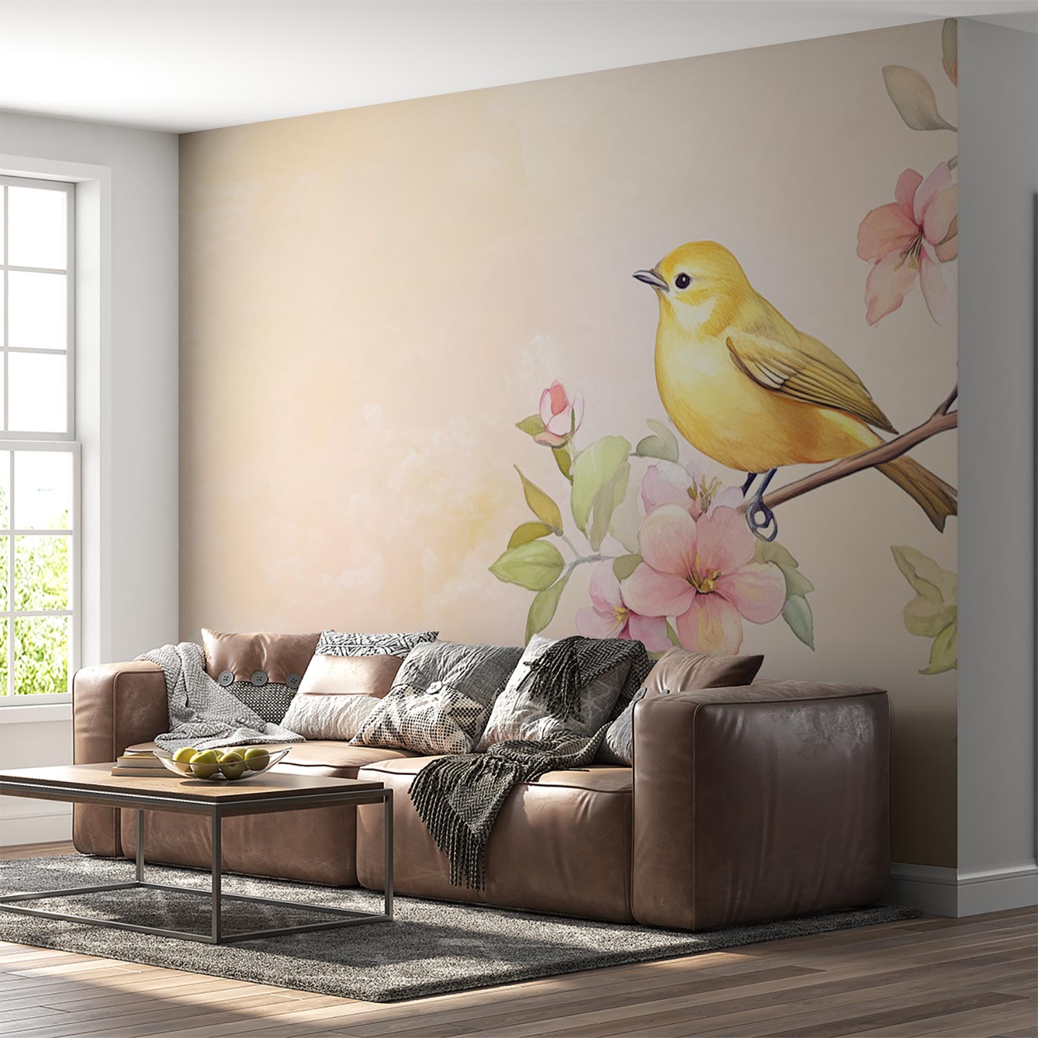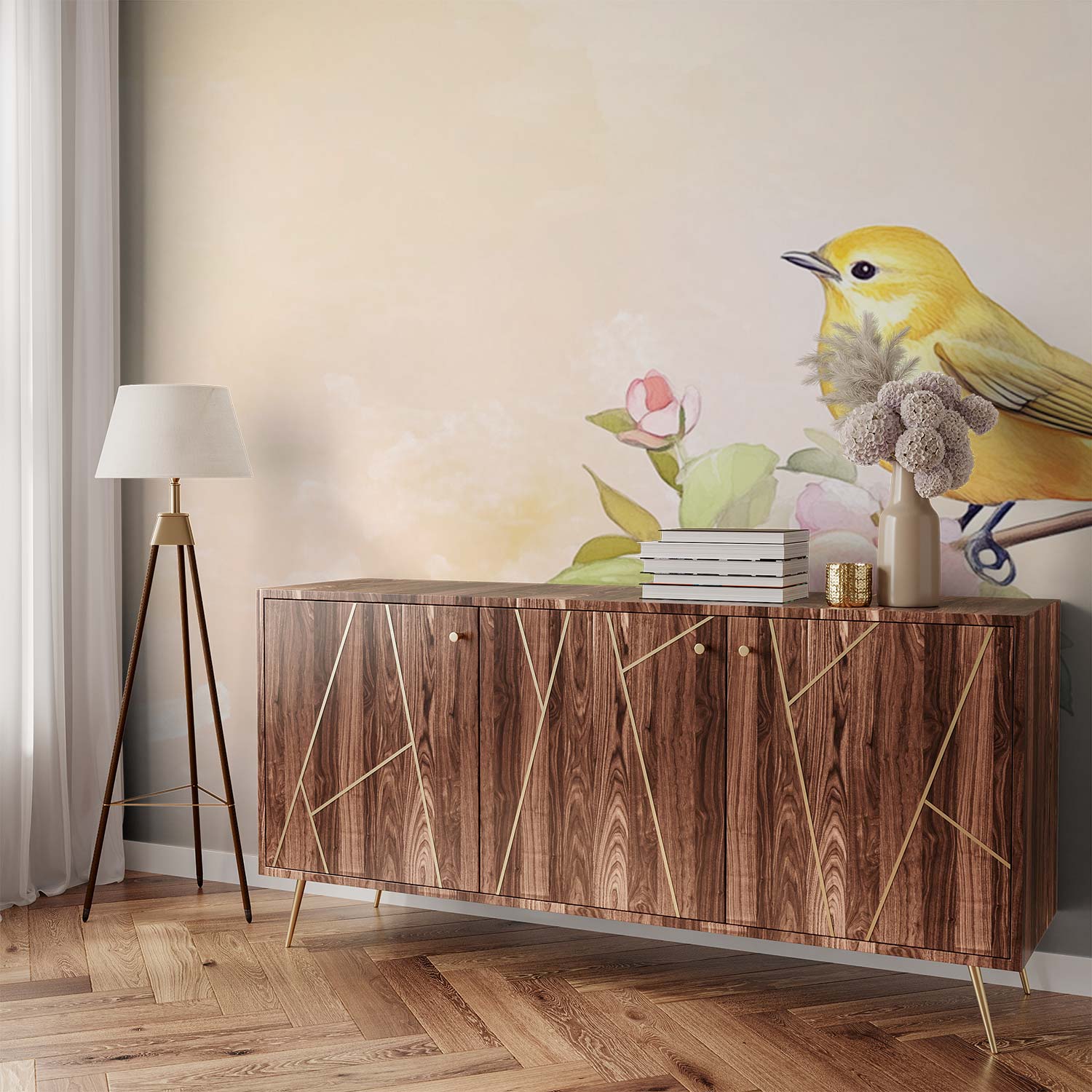Gele vogel op bloementak behang