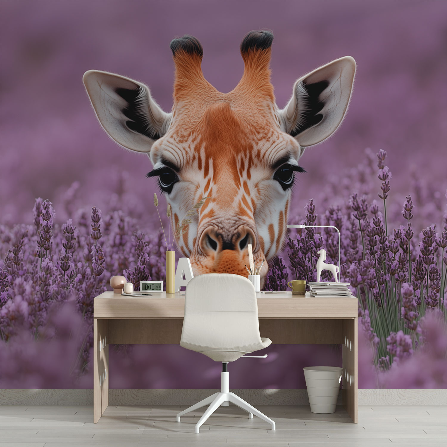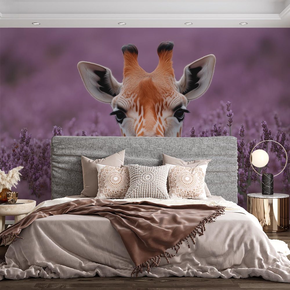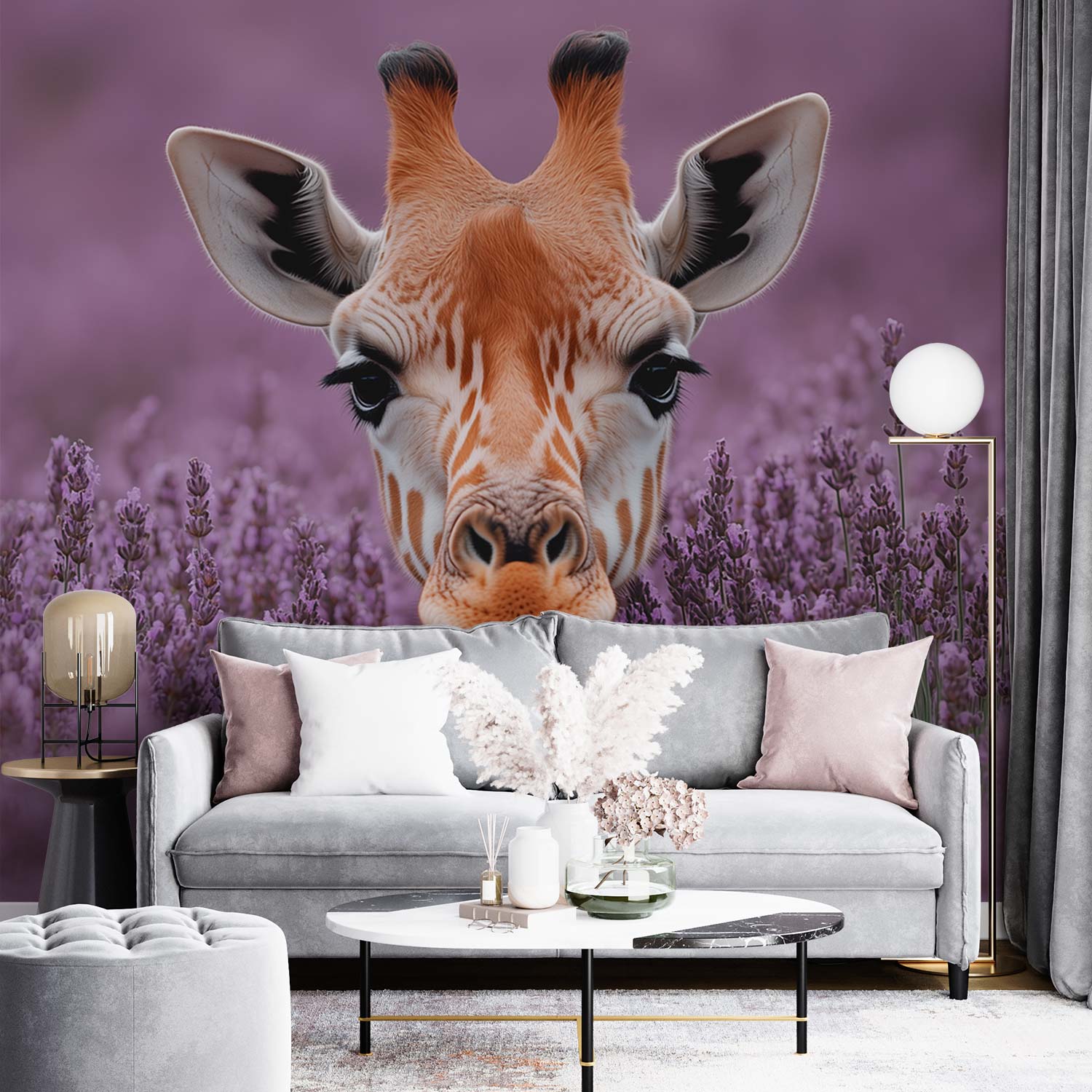 Terug naar collectie / Behang / Giraf in paarse bloemen behang