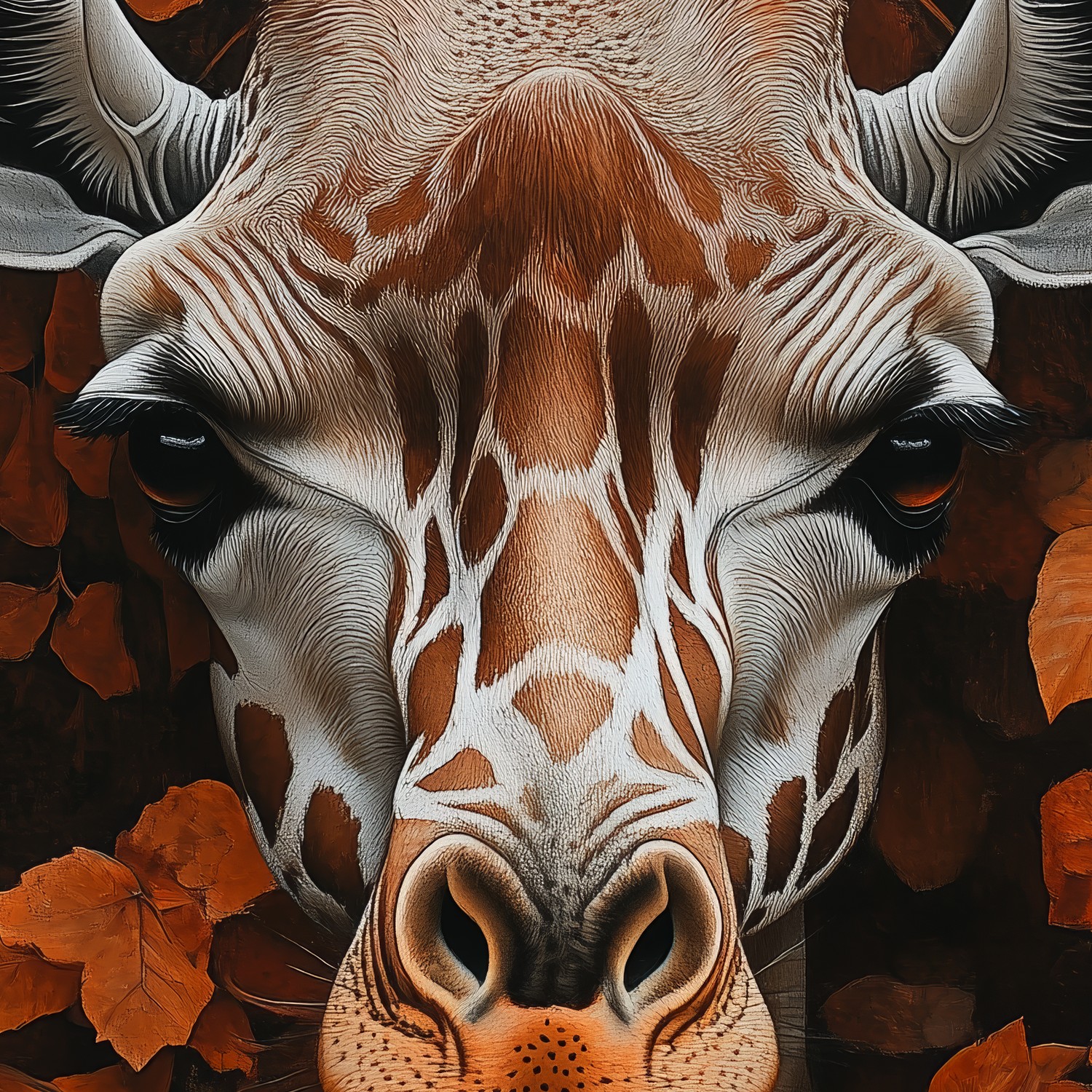 Terug naar collectie / Behang / Giraf tussen oranje bladeren behang
