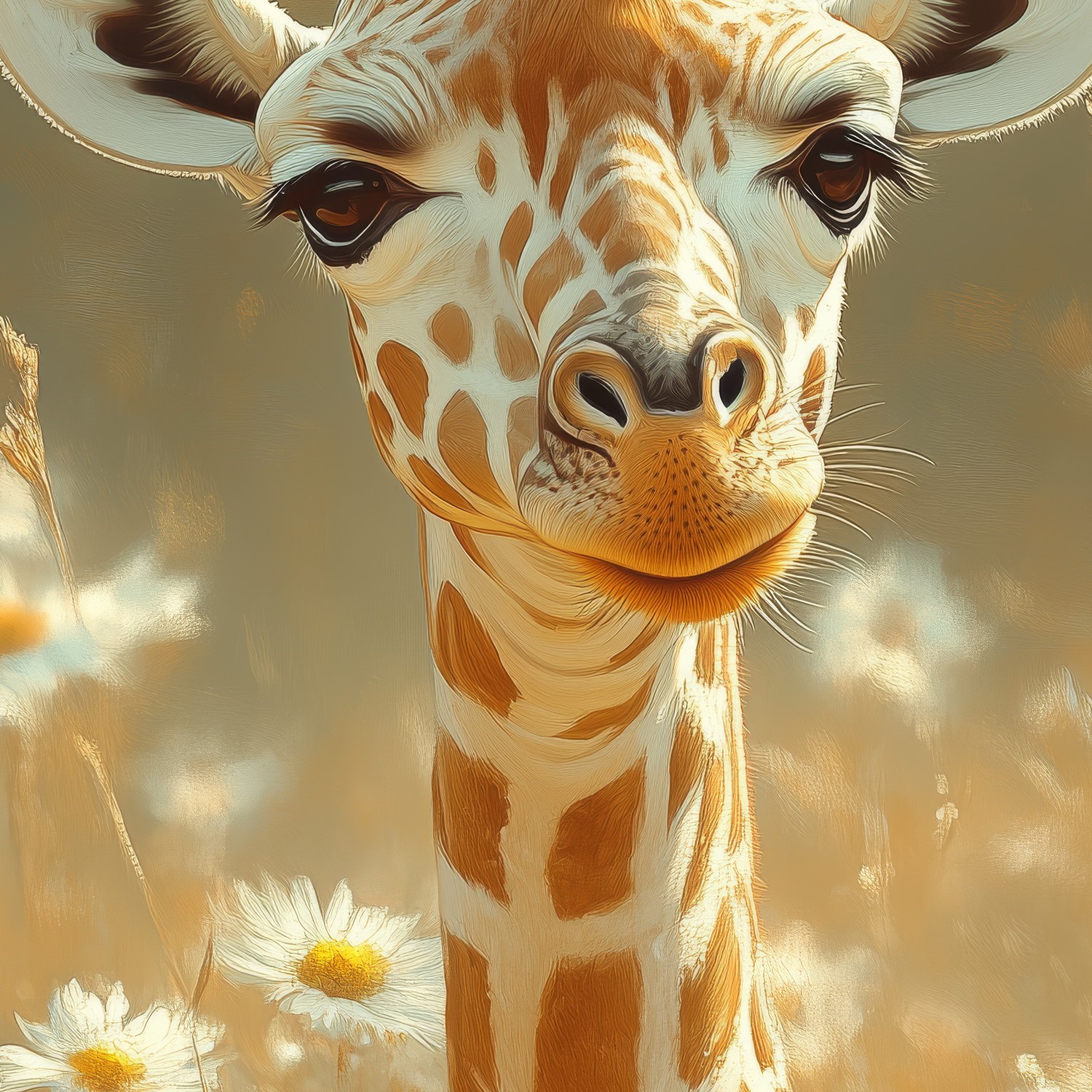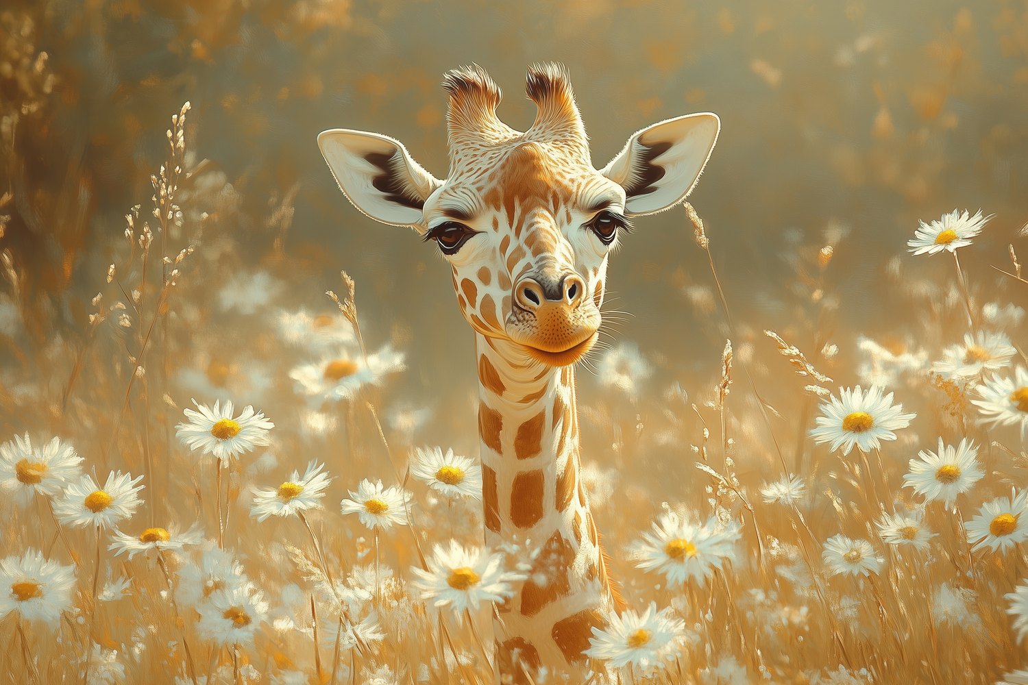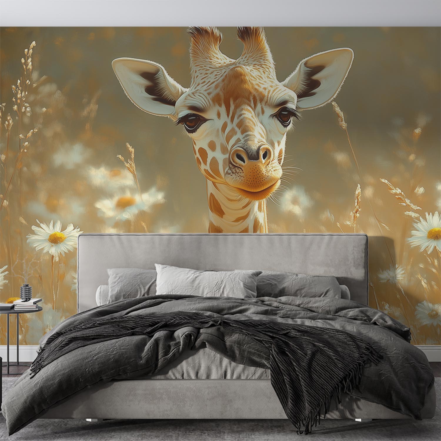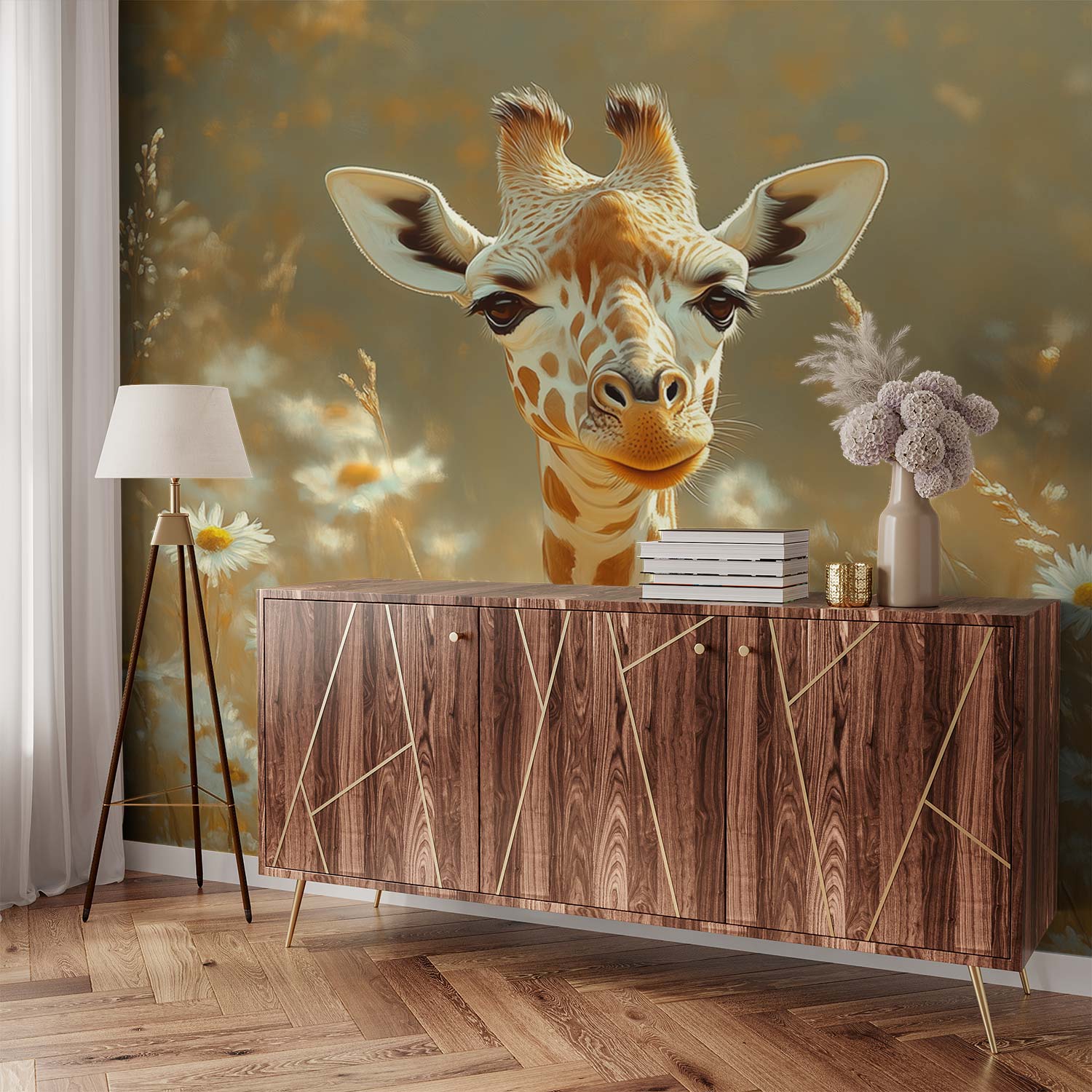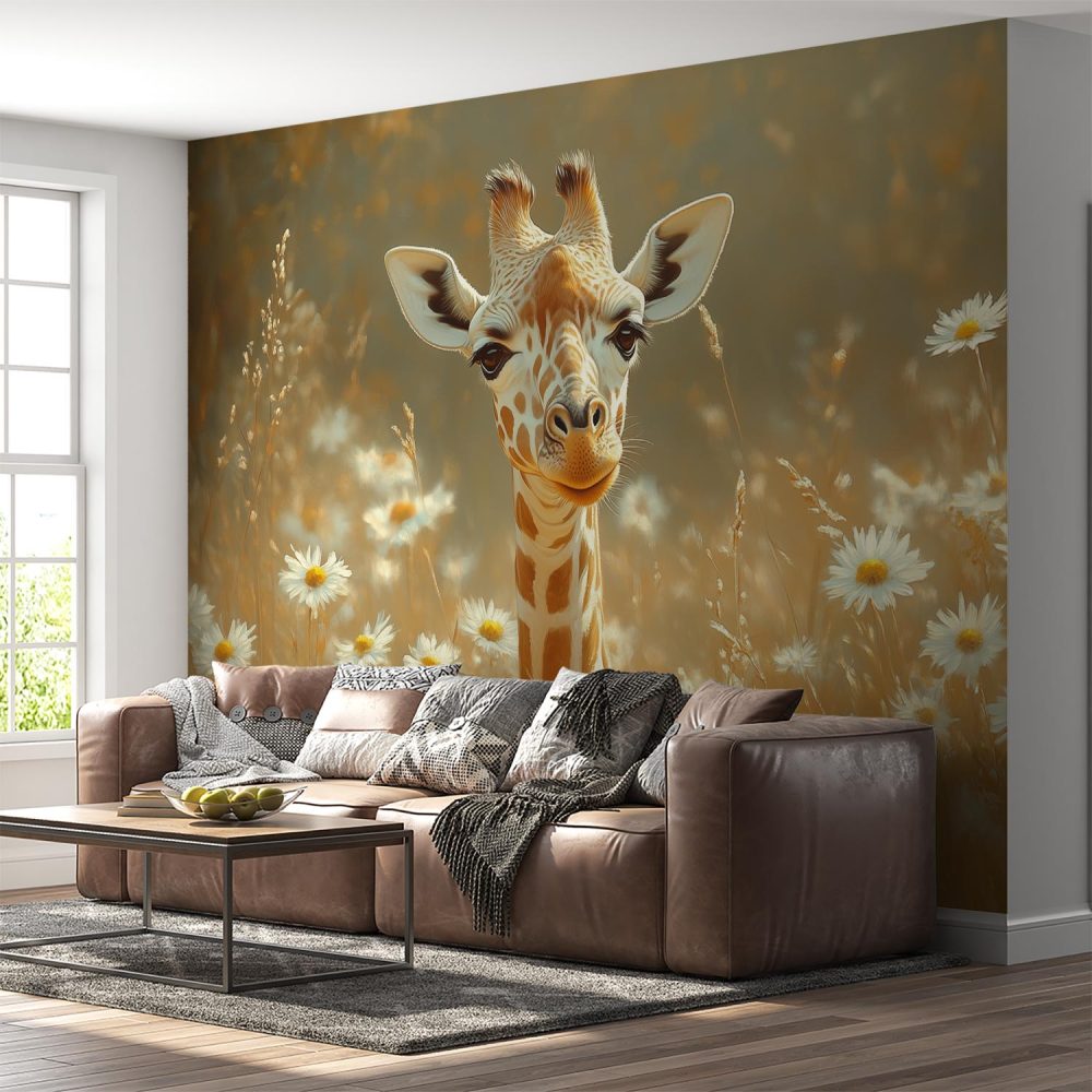 Terug naar collectie / Behang / Giraf tussen witte madeliefjes behang