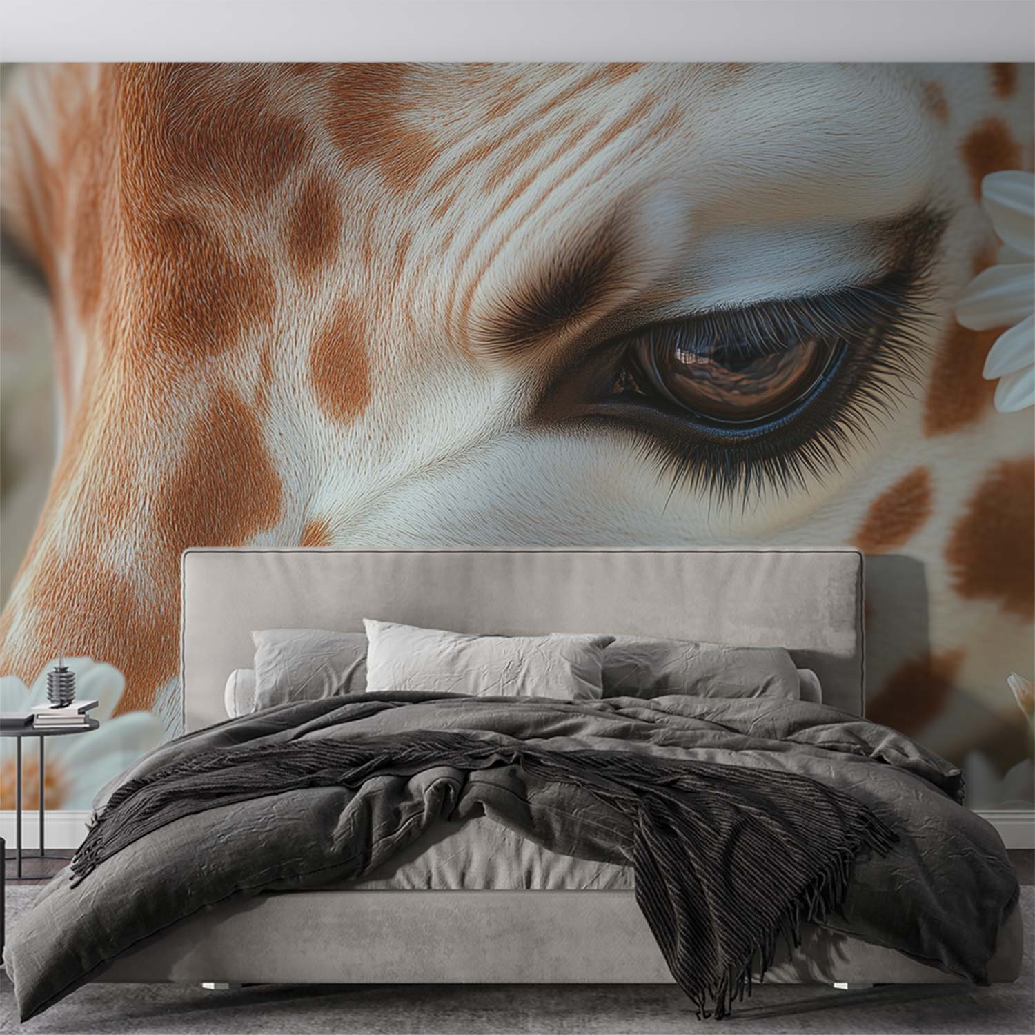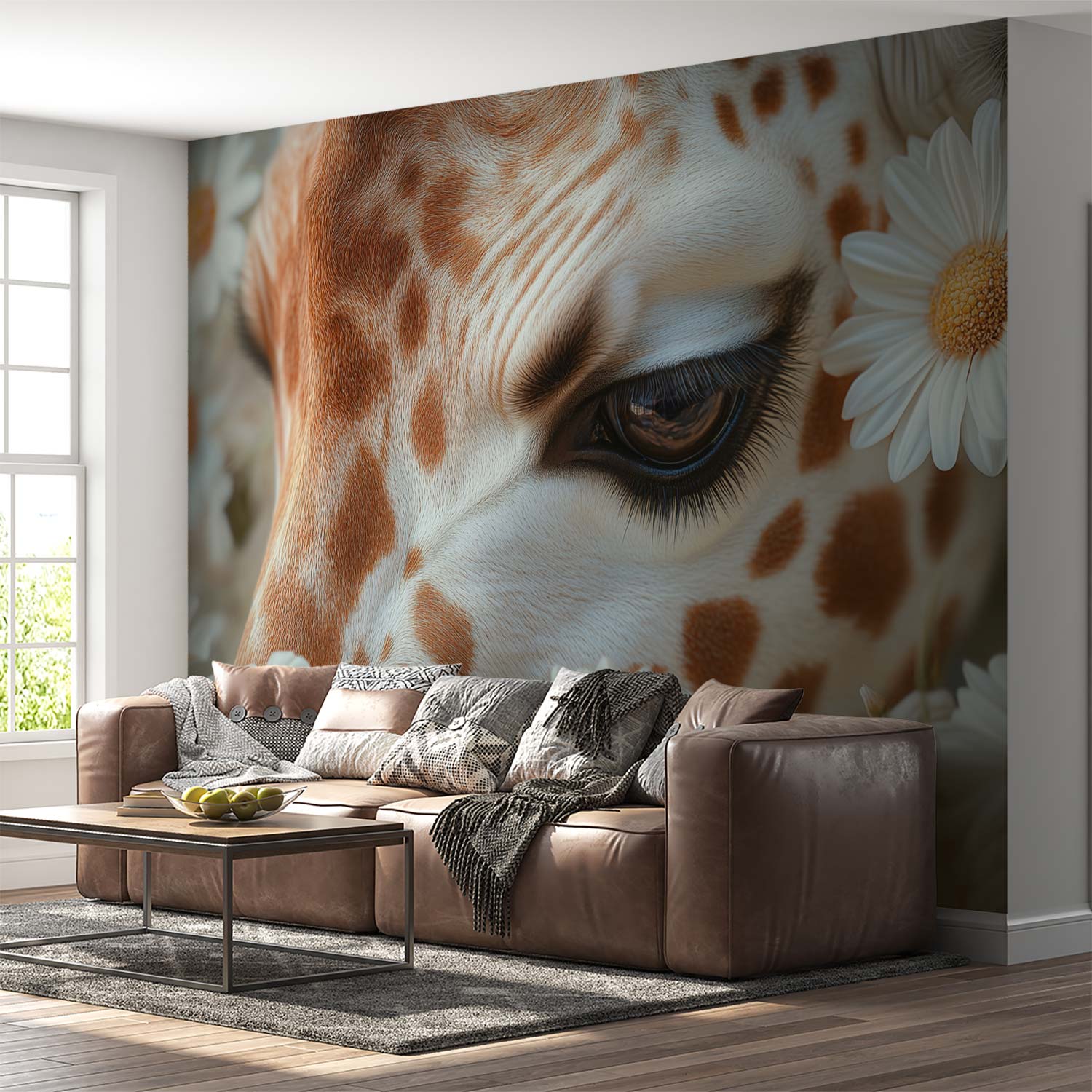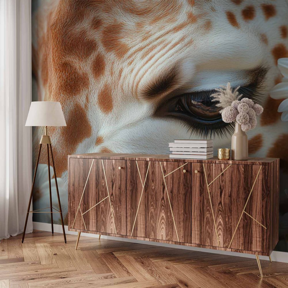 Terug naar collectie / Behang / Giraffe tussen witte madeliefjes behang
