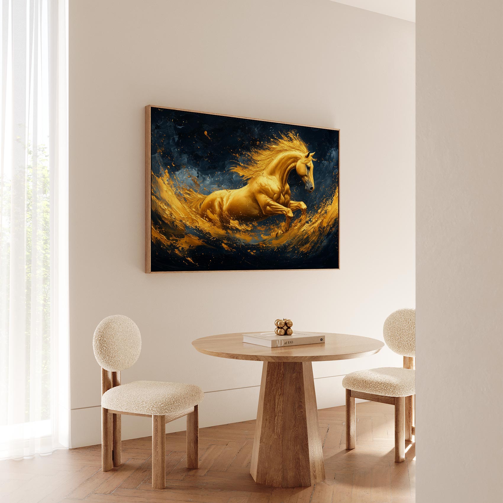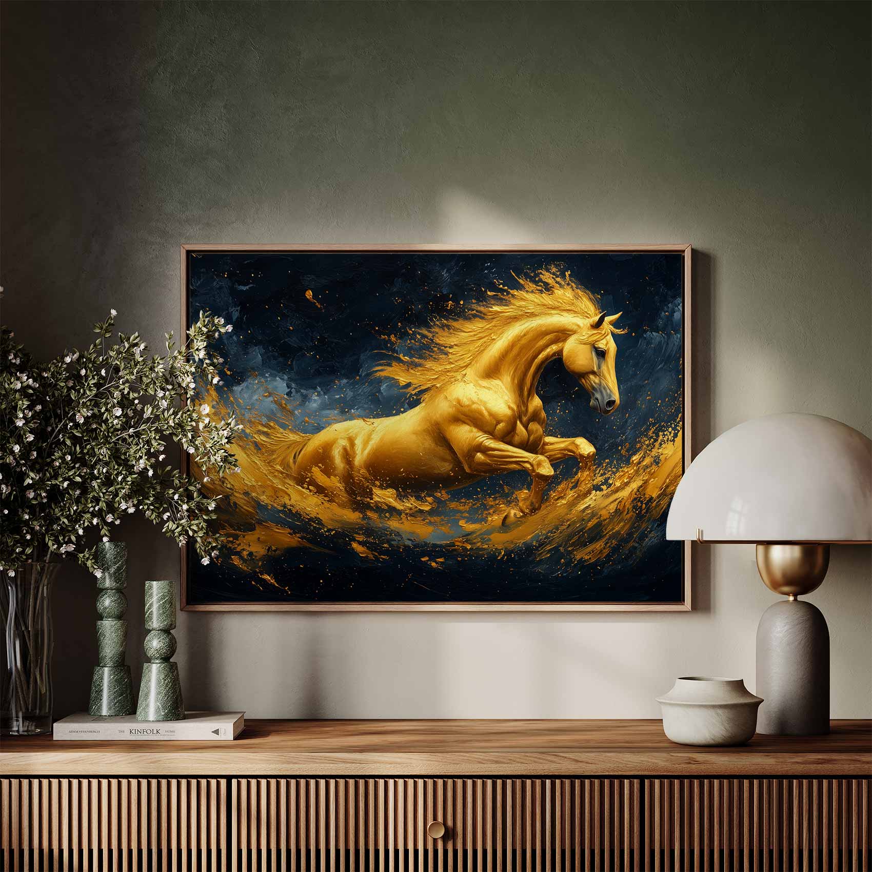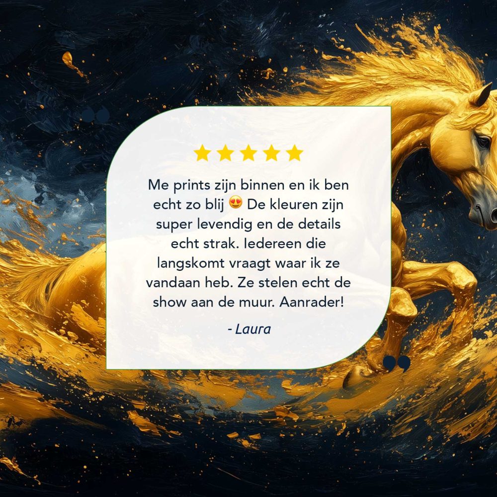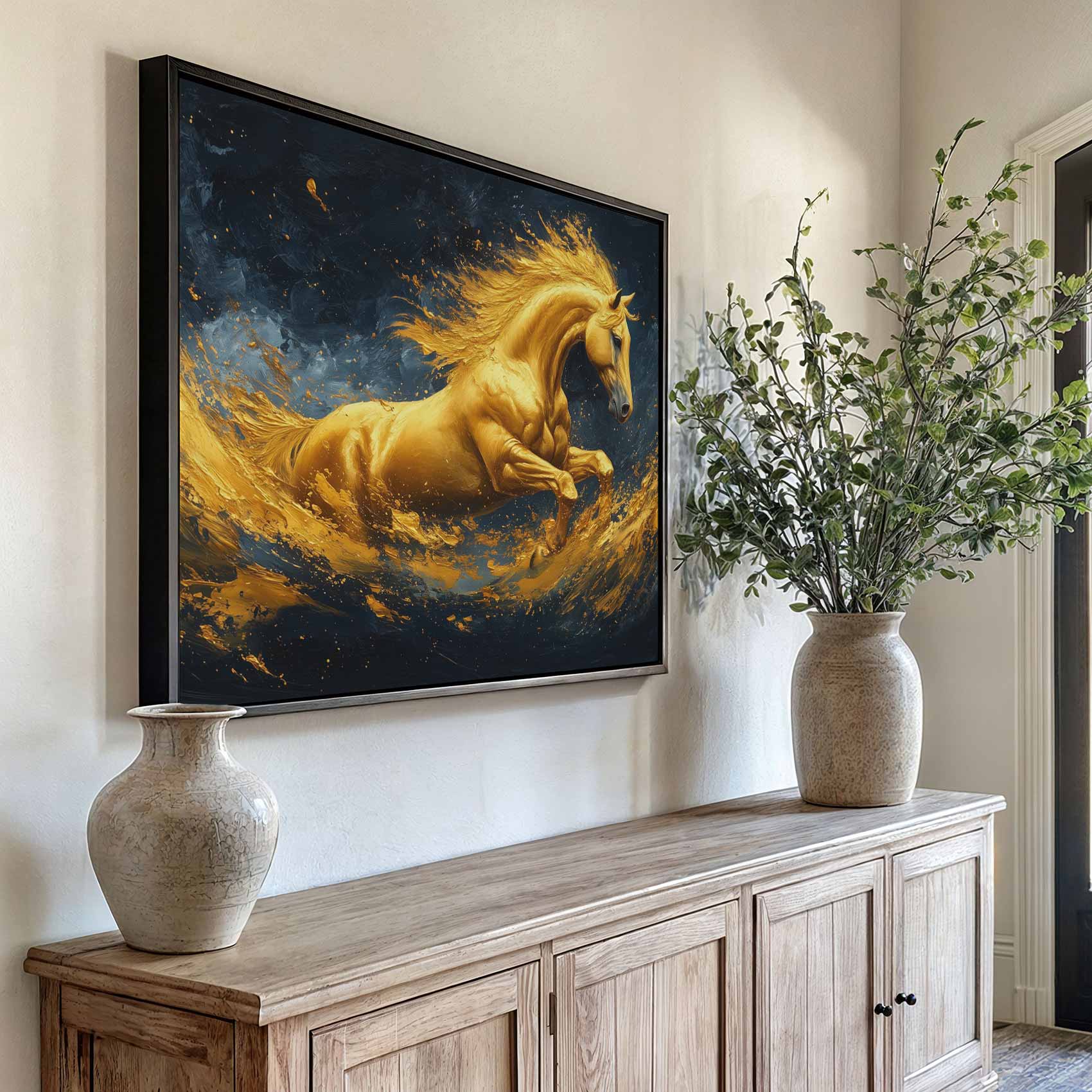 Terug naar collectie / Schilderijen / Abstract Schilderij / Gouden galopperende vlammenpaard