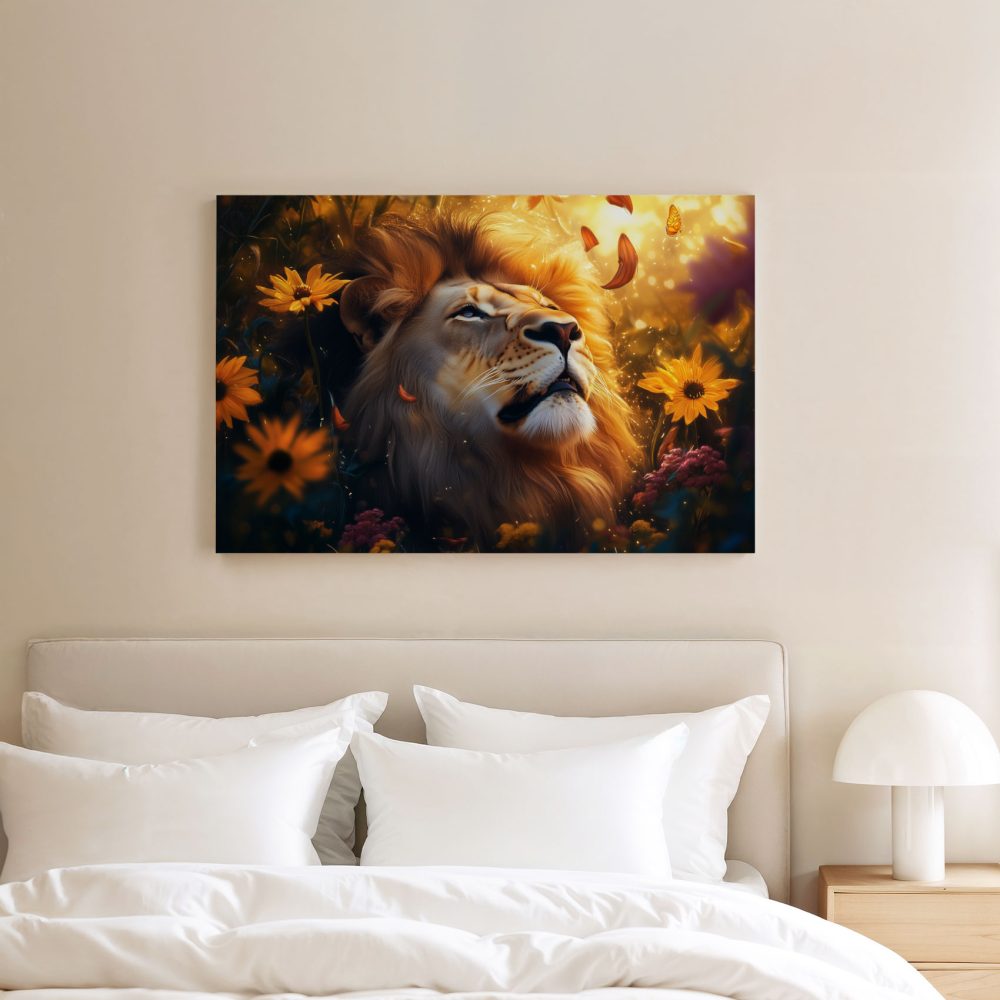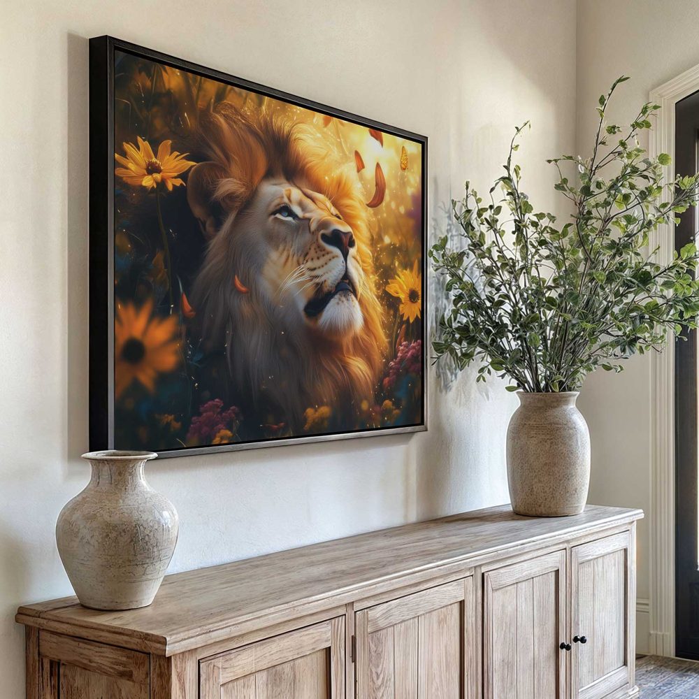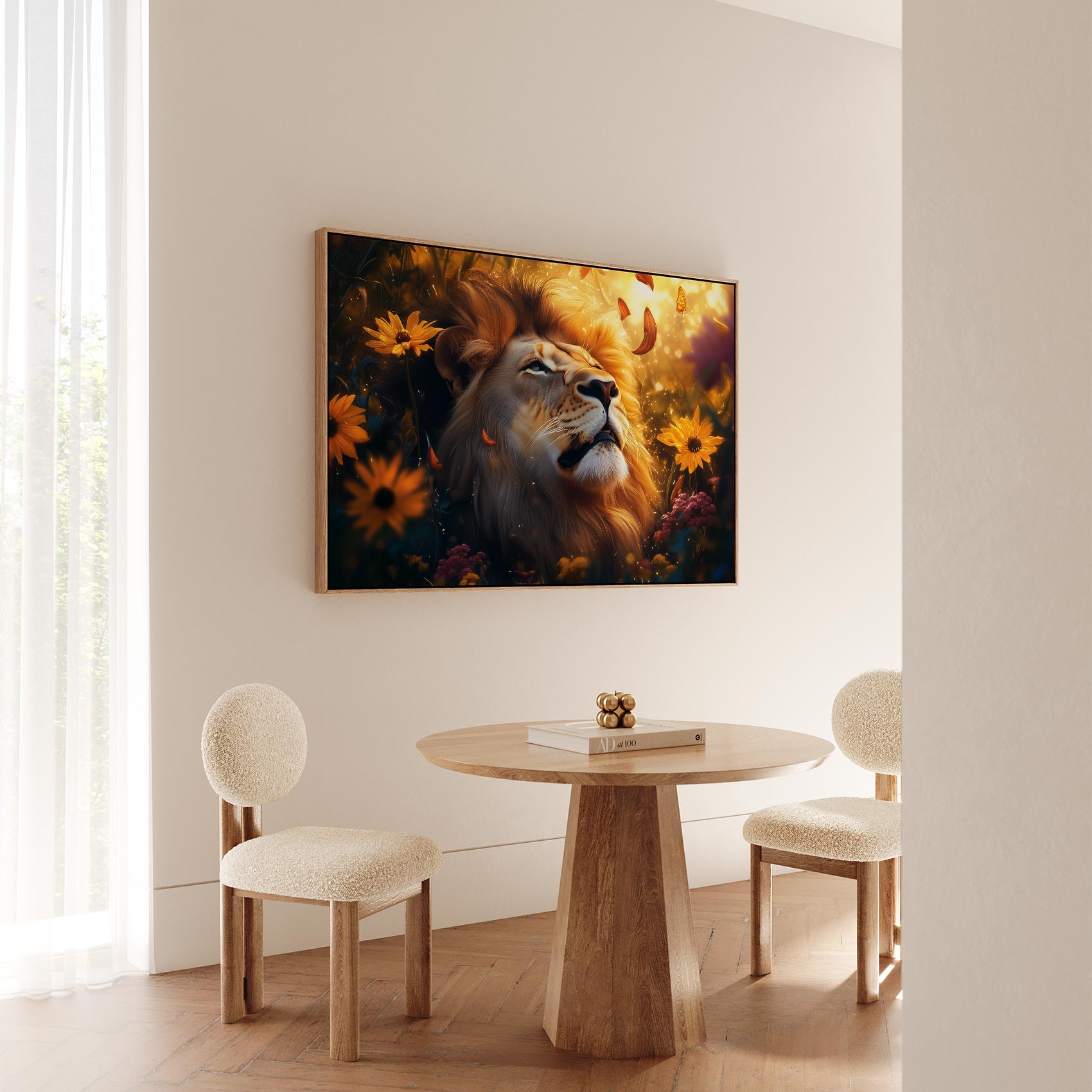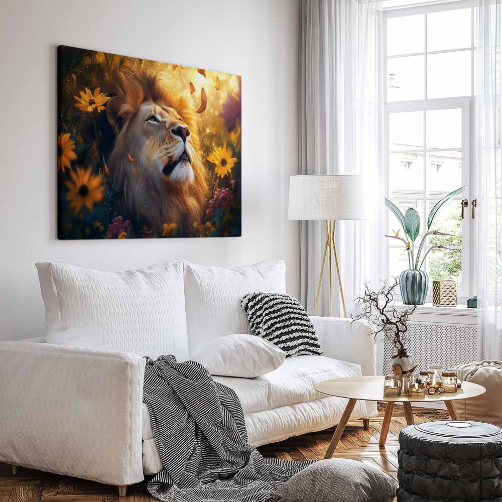 Terug naar collectie / Schilderijen / Bloemen Schilderij / Gouden leeuw in bloementuin