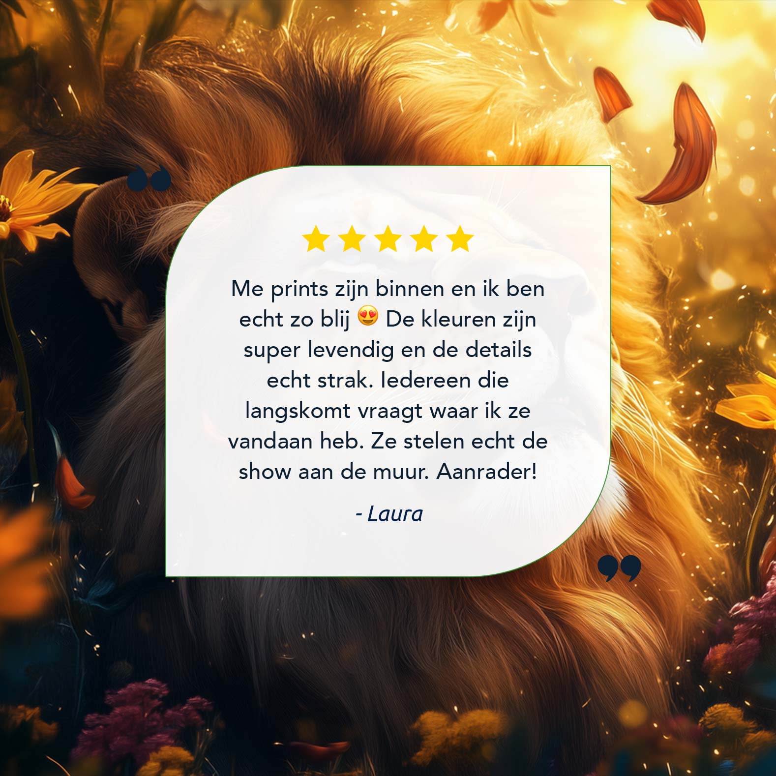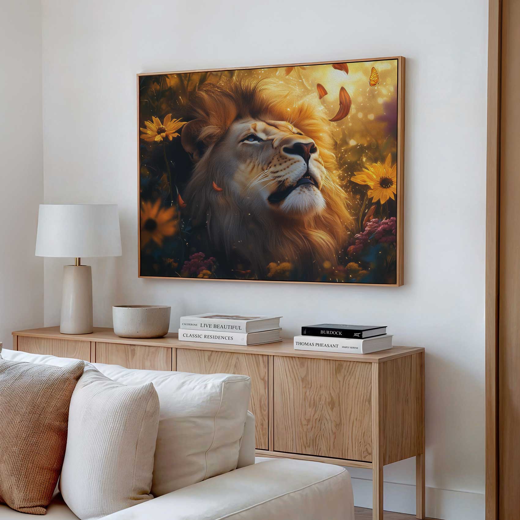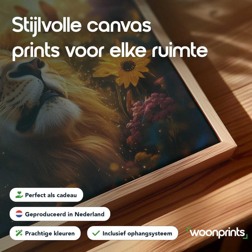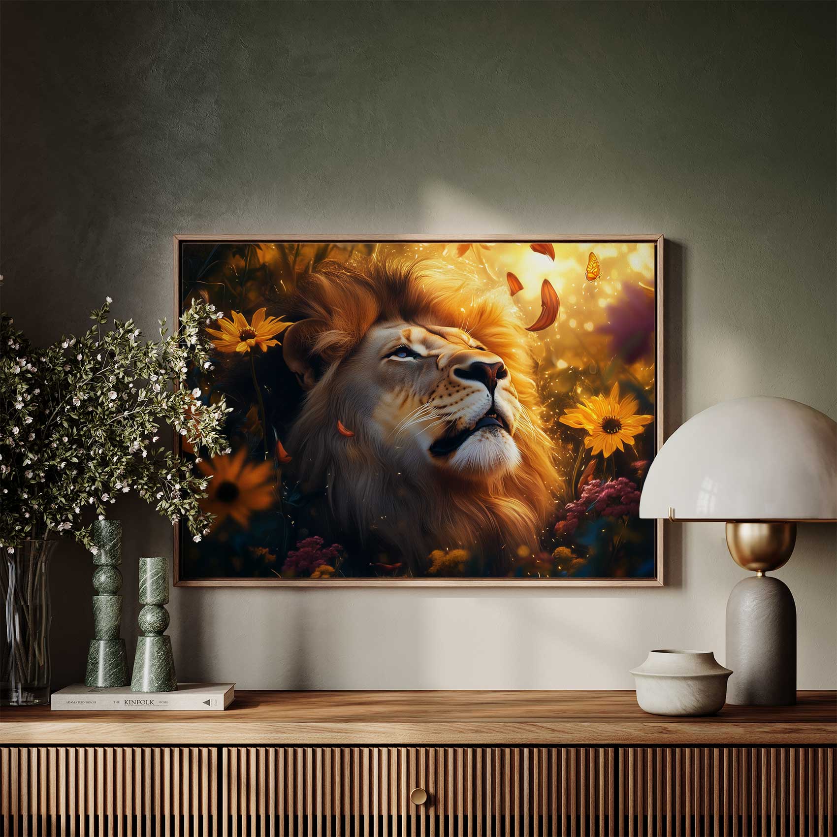 Terug naar collectie / Schilderijen / Bloemen Schilderij / Gouden leeuw in bloementuin