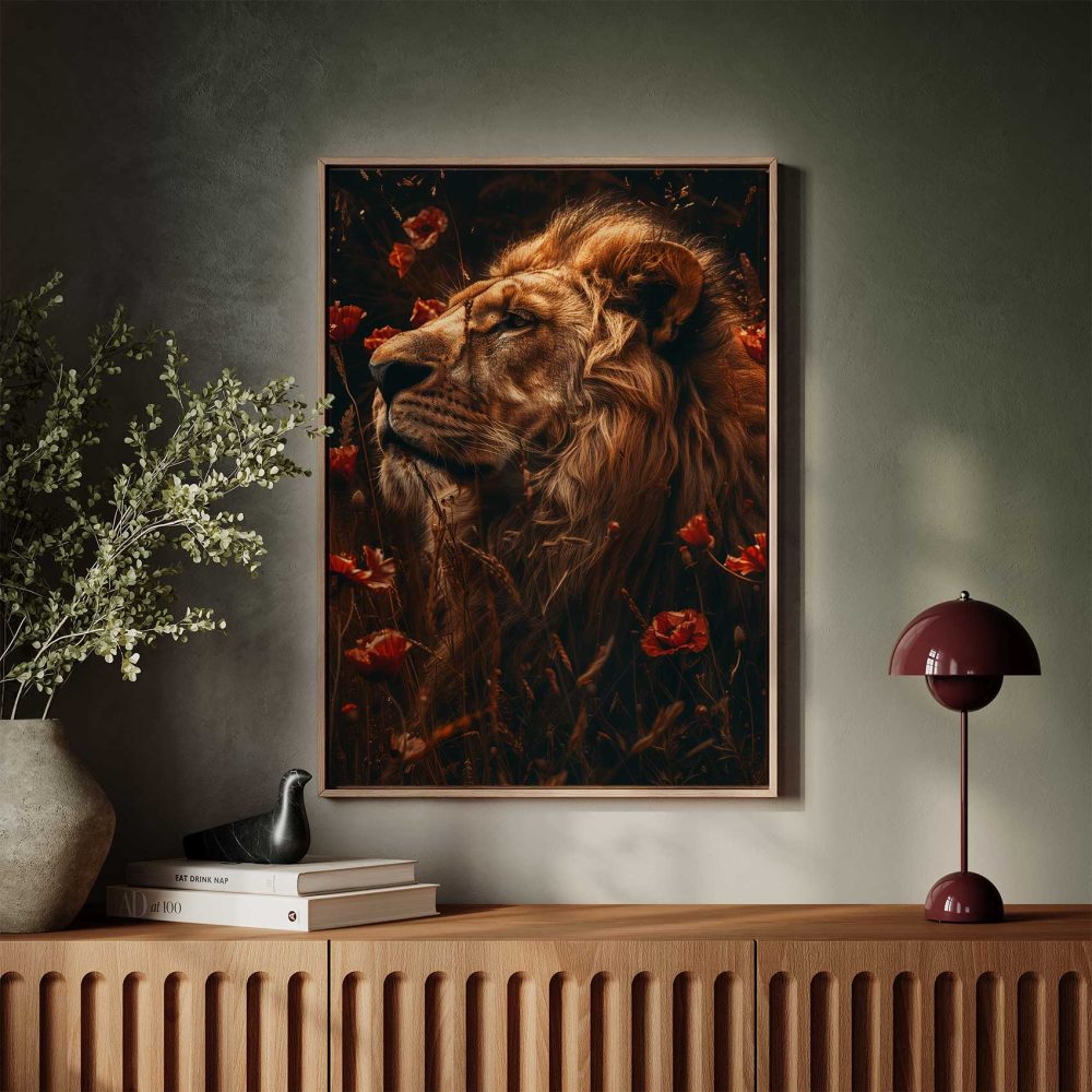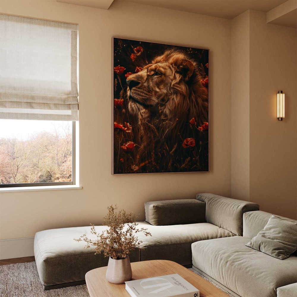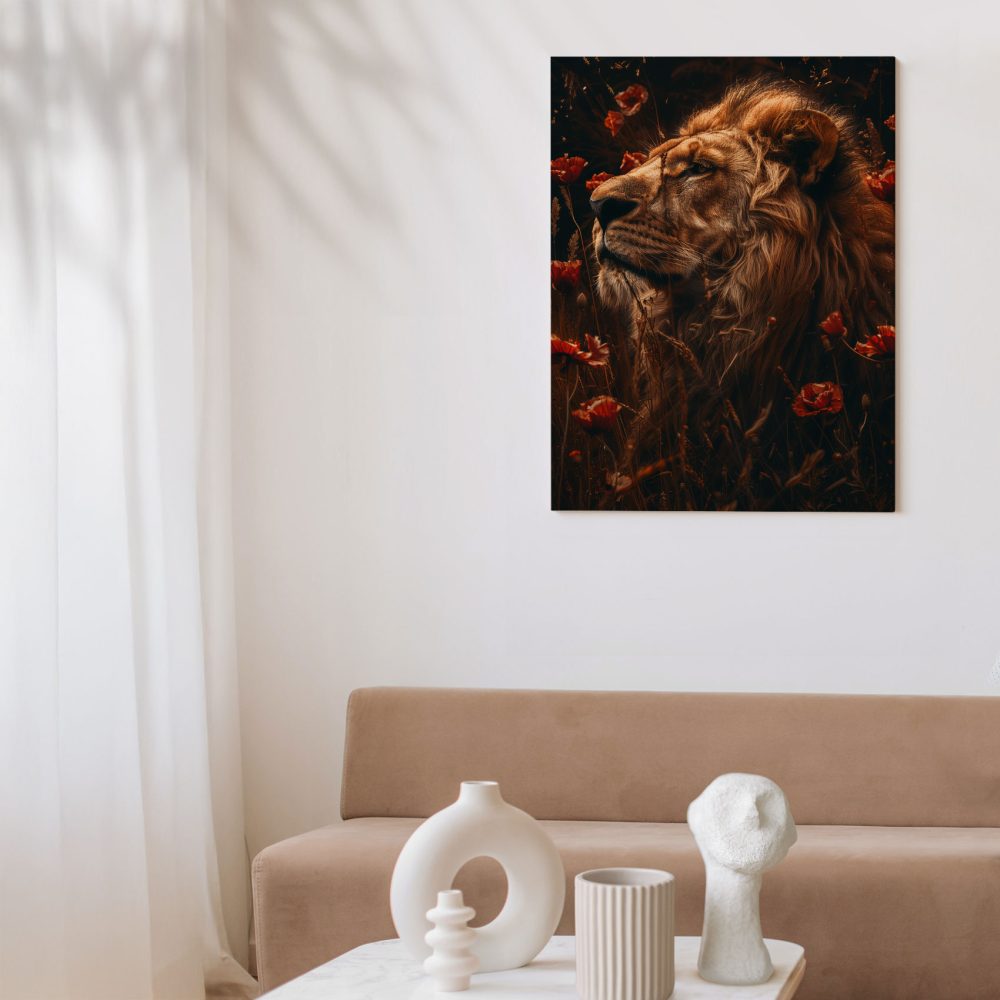 Terug naar collectie / Schilderijen / Bloemen Schilderij / Gouden leeuw tussen rode bloemen